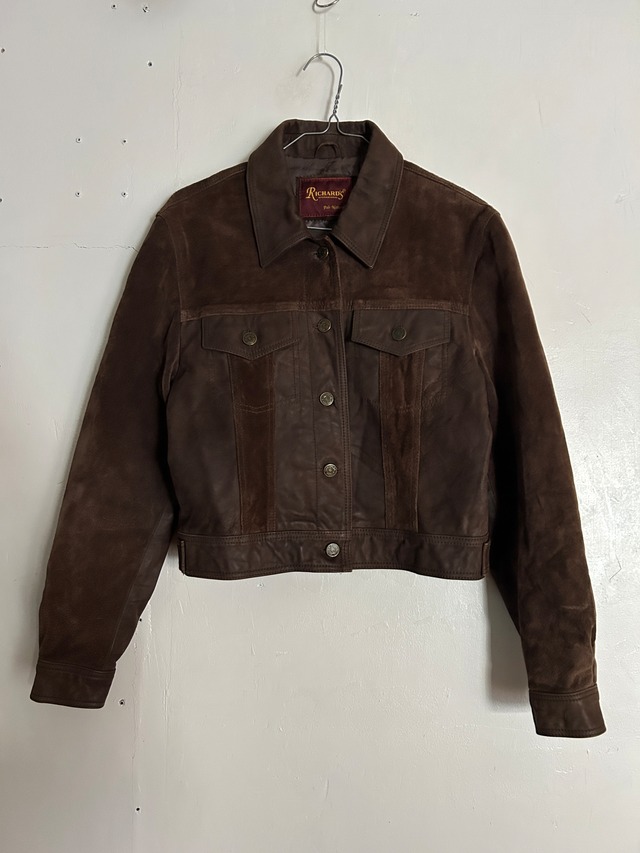 [Note] 同色のスエードとレザーで切り替えになっているジャケットです。ありそうで意外とないレザーの異素材デザイン。短丈で太いボトムと合わせると今っぽく着れます。もちもちとした素材で防寒性も◎ H-4093 [Condition] B A : 未使用品、デッドストック品、又は使用感やダメージがほとんどないUsed品 B : 若干の使用感があるUsed品 C : 汚れやダメージが目立つUsed品 [Size] サイズ表記 38 着丈 48cm 肩幅 43cm 身幅 50cm 袖丈 58.5cm [Color] ブラウン [Country] Made in Portugal [Material] レザー100% [Model] 157cm [Attention] ※掲載されている商品は全て1点もののUSED・VINTAGE商品です。購入後の返品、交換は受け付けておりません。 ※中古の特性上、写真と表記以外の傷や汚れがある場合がございます。 ※撮影時の光の環境や、ご使用のモニターによって実際の色と多少異なる場合がございます。 ※平置き採寸のため若干の誤差はご了承ください。 ※店頭でも同日同時間に販売開始いたしますので万が一時間差で売り切れてしまった場合はキャンセルとなりますので予めご了承ください。 ※銀行振込、コンビニ・pay-easy払いのお客様に関しては、在庫確保の旨を別途メールにてご連絡いたしますので、在庫確保のご連絡後のご入金、お支払いをお願いいたします。万が一、支払いを済ませてしまい在庫が確保出来なかった場合は、返金処理をさせていただきます。予めご了承ください。 その他商品に関するお問い合わせはメール、又はDMにてご連絡ください。