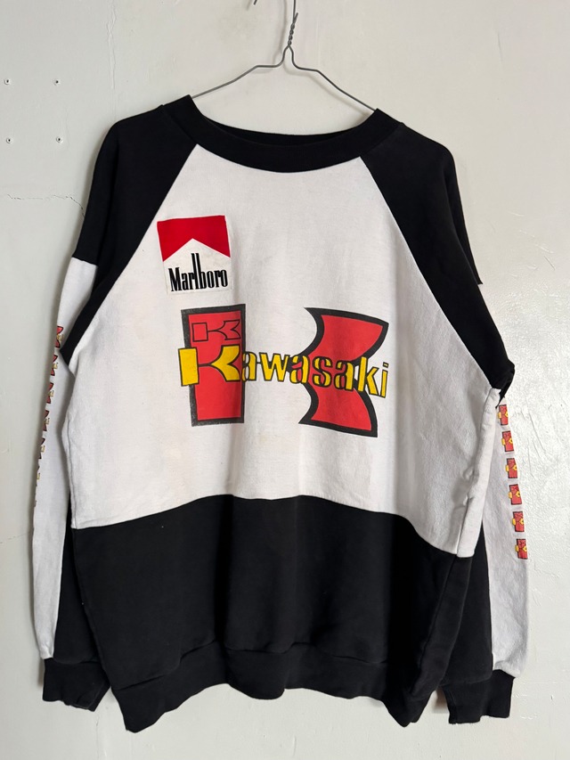 [Note] Kawasakiのレーシンググラフィックが大胆に入ったスウェットシャツ。ホワイトとブラックの配色が程良く主張のある一着です。モータースポーツらしい無骨さと古着ならではの存在感を楽しめます。 H-4096 [Condition] B A : 未使用品、デッドストック品、又は使用感やダメージがほとんどないUsed品 B : 若干の使用感があるUsed品 C : 汚れやダメージが目立つUsed品 [Size] サイズ表記 XL 着丈 64cm 肩幅 66cm 身幅 56cm 袖丈 52cm [Color] ホワイト [Country] 表記無し [Material] コットン 100% [Model] 191cm [Attention] ※掲載されている商品は全て1点もののUSED・VINTAGE商品です。購入後の返品、交換は受け付けておりません。 ※中古の特性上、写真と表記以外の傷や汚れがある場合がございます。 ※撮影時の光の環境や、ご使用のモニターによって実際の色と多少異なる場合がございます。 ※平置き採寸のため若干の誤差はご了承ください。 ※店頭でも同日同時間に販売開始いたしますので万が一時間差で売り切れてしまった場合はキャンセルとなりますので予めご了承ください。 ※銀行振込、コンビニ・pay-easy払いのお客様に関しては、在庫確保の旨を別途メールにてご連絡いたしますので、在庫確保のご連絡後のご入金、お支払いをお願いいたします。万が一、支払いを済ませてしまい在庫が確保出来なかった場合は、返金処理をさせていただきます。予めご了承ください。 その他商品に関するお問い合わせはメール、又はDMにてご連絡ください。