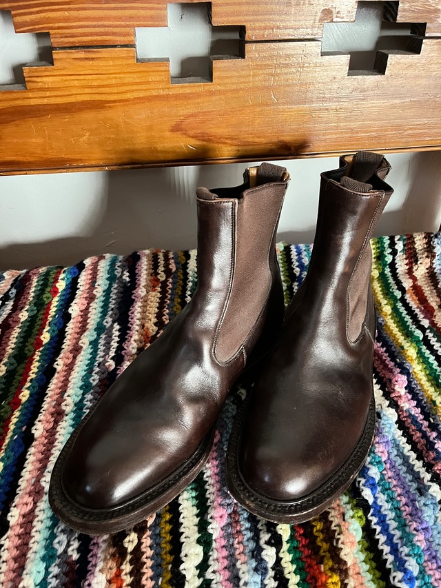 [Note] サイドがゴアになっていて、履きやすさ抜群のブーツです。OldTricker’sということもあり、シンプルかつ高級感があるためスラックスなど綺麗目なパンツと相性抜群です。また、デニムやスエットなどカジュアルなパンツでも一つの外しとしてスタイリングしていただくと、また変化のあるファッションスタイルを楽しんでいただけると思います。 H-4100 [Condition] B A : 未使用品、デッドストック品、又は使用感やダメージがほとんどないUsed品 B : 若干の使用感があるUsed品 C : 汚れやダメージが目立つUsed品 [Size] サイズ表記 無し 長さ 29cm 幅 11cm ヒール高 3cm [Color] ダークブラウン [Country] Made In England [Material] レザー [Model] [Attention] ※掲載されている商品は全て1点もののUSED・VINTAGE商品です。購入後の返品、交換は受け付けておりません。 ※中古の特性上、写真と表記以外の傷や汚れがある場合がございます。 ※撮影時の光の環境や、ご使用のモニターによって実際の色と多少異なる場合がございます。 ※平置き採寸のため若干の誤差はご了承ください。 ※店頭でも同日同時間に販売開始いたしますので万が一時間差で売り切れてしまった場合はキャンセルとなりますので予めご了承ください。 ※銀行振込、コンビニ・pay-easy払いのお客様に関しては、在庫確保の旨を別途メールにてご連絡いたしますので、在庫確保のご連絡後のご入金、お支払いをお願いいたします。万が一、支払いを済ませてしまい在庫が確保出来なかった場合は、返金処理をさせていただきます。予めご了承ください。 その他商品に関するお問い合わせはメール、又はDMにてご連絡ください。