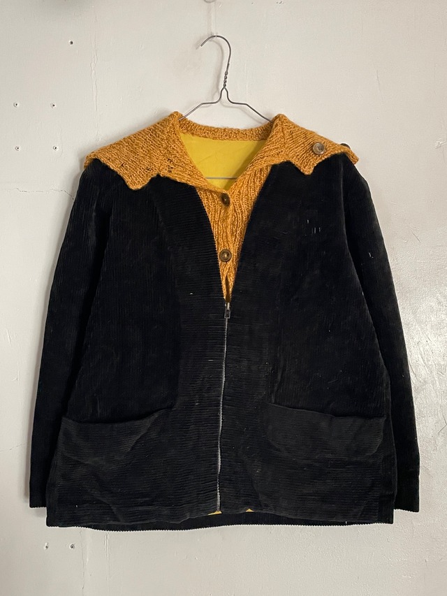 [Note] ブラックボディのコーデュロイと、マスタードカラーのニットがドッキングしたジャケット。あまり見かけない面白いデザインになっています。ニットはかなりネックが高め。顔が半分隠れるくらいの高さまであります。コーデュロイの色気と、ニットの可愛らしさが、良い具合にミックスした1着。短丈めでややタイトめな今っぽいシルエットなのも魅力的です。 H-4109 [Condition] B A : 未使用品、デッドストック品、又は使用感やダメージがほとんどないUsed品 B : 若干の使用感があるUsed品 C : 汚れやダメージが目立つUsed品 [Size] サイズ表記 無し 着丈 63cm 肩幅 45cm 身幅 54cm 袖丈 53cm [Color] ブラック、マスタード [Country] 表記無し [Material] 表記無し [Model] 183cm [Attention] ※掲載されている商品は全て1点もののUSED・VINTAGE商品です。購入後の返品、交換は受け付けておりません。 ※中古の特性上、写真と表記以外の傷や汚れがある場合がございます。 ※撮影時の光の環境や、ご使用のモニターによって実際の色と多少異なる場合がございます。 ※平置き採寸のため若干の誤差はご了承ください。 ※店頭でも同日同時間に販売開始いたしますので万が一時間差で売り切れてしまった場合はキャンセルとなりますので予めご了承ください。 ※銀行振込、コンビニ・pay-easy払いのお客様に関しては、在庫確保の旨を別途メールにてご連絡いたしますので、在庫確保のご連絡後のご入金、お支払いをお願いいたします。万が一、支払いを済ませてしまい在庫が確保出来なかった場合は、返金処理をさせていただきます。予めご了承ください。 その他商品に関するお問い合わせはメール、又はDMにてご連絡ください。