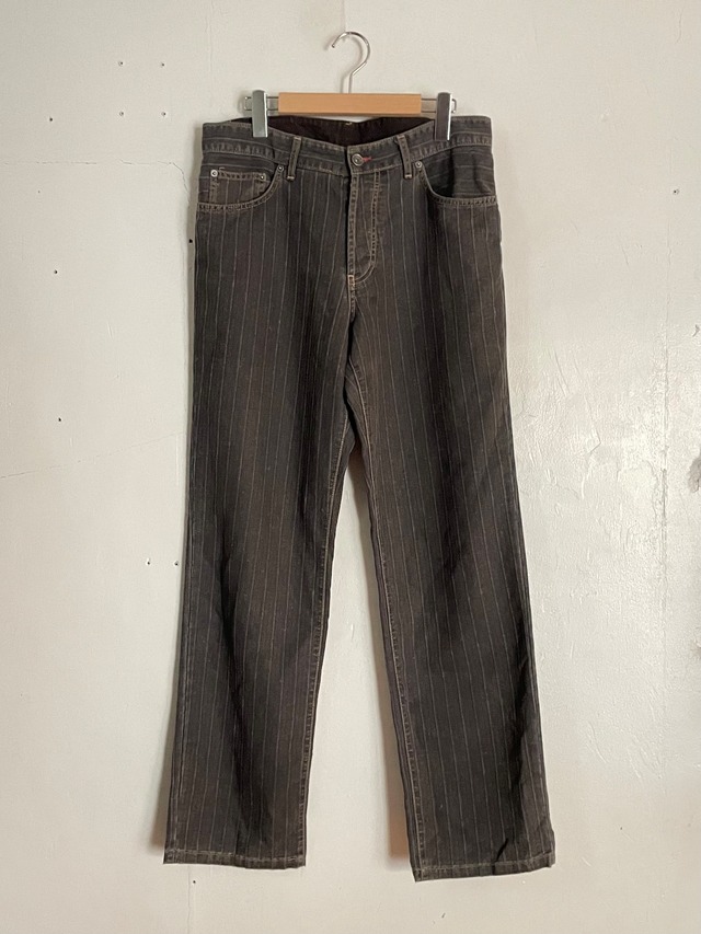 [Note] チャコール系の落ち着いた色味に、縦のストライプ柄が入ったデニムパンツです。ストライプが縦を強調し、脚をすっきり長く見せてくれるデザイン。やや細身のストレートで、カジュアルすぎず、きれいめモード寄りのスタイリングに合わせやすい一本です。デニム生地ながらストライプ入りで、他と被りにくいアイテムです。 H-3995 [Condition] B A : 未使用品、デッドストック品、又は使用感やダメージがほとんどないUsed品 B : 若干の使用感があるUsed品 C : 汚れやダメージが目立つUsed品 [Size] サイズ表記 42 ウエスト 66cm 総丈 108cm 股上 28cm 股下 77cm わたり幅 30cm 裾幅 21cm [Color] チャコール [Country] 表記無し [Material] ポリエステル 61% コットン 39% [Model] 156cm [Attention] ※掲載されている商品は全て1点もののUSED・VINTAGE商品です。購入後の返品、交換は受け付けておりません。 ※中古の特性上、写真と表記以外の傷や汚れがある場合がございます。 ※撮影時の光の環境や、ご使用のモニターによって実際の色と多少異なる場合がございます。 ※平置き採寸のため若干の誤差はご了承ください。 ※店頭でも同日同時間に販売開始いたしますので万が一時間差で売り切れてしまった場合はキャンセルとなりますので予めご了承ください。 ※銀行振込、コンビニ・pay-easy払いのお客様に関しては、在庫確保の旨を別途メールにてご連絡いたしますので、在庫確保のご連絡後のご入金、お支払いをお願いいたします。万が一、支払いを済ませてしまい在庫が確保出来なかった場合は、返金処理をさせていただきます。予めご了承ください。 その他商品に関するお問い合わせはメール、又はDMにてご連絡ください。