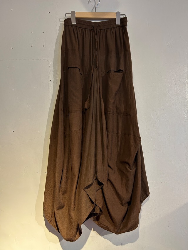 [Note] 落ち感のある生地を贅沢に使用した、立体的なドレープが印象的なロングスカート。重なり合うレイヤード構造とバルーンシルエットにより、動くたびに表情が変わるデザインが魅力です。ウエストはイージー仕様でリラックスした履き心地ながら、モード感とアート性を併せ持つ一本。 H-4053 [Condition] B A : 未使用品、デッドストック品、又は使用感やダメージがほとんどないUsed品 B : 若干の使用感があるUsed品 C : 汚れやダメージが目立つUsed品 [Size] サイズ表記 2 ウエスト 33cm(ゴム) 総丈 97cm [Color] ブラウン [Country] Made in Nepal [Material] コットン 100% [Model] 157cm [Attention] ※掲載されている商品は全て1点もののUSED・VINTAGE商品です。購入後の返品、交換は受け付けておりません。 ※中古の特性上、写真と表記以外の傷や汚れがある場合がございます。 ※撮影時の光の環境や、ご使用のモニターによって実際の色と多少異なる場合がございます。 ※平置き採寸のため若干の誤差はご了承ください。 ※店頭でも同日同時間に販売開始いたしますので万が一時間差で売り切れてしまった場合はキャンセルとなりますので予めご了承ください。 ※銀行振込、コンビニ・pay-easy払いのお客様に関しては、在庫確保の旨を別途メールにてご連絡いたしますので、在庫確保のご連絡後のご入金、お支払いをお願いいたします。万が一、支払いを済ませてしまい在庫が確保出来なかった場合は、返金処理をさせていただきます。予めご了承ください。 その他商品に関するお問い合わせはメール、又はDMにてご連絡ください。