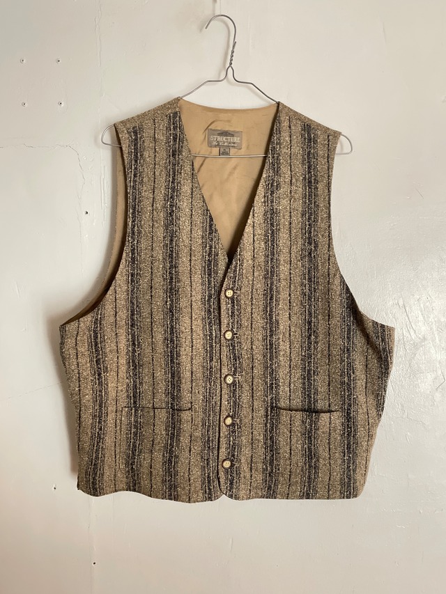 [Note] 落ち着いた色味のストライプ柄で、背中は無地タイプのベスト。あえて荒めに編まれたような素材感が優しい印象、立体感もあります。シルクとレーヨンの混紡素材が柔らかく、アームホールも深めにとられているので、レイヤードには最適だと思います。前ポケットも綺麗に柄合わせされている、クオリティの高い一着です。 H-3445 [Condition] B A : 未使用品、デッドストック品、又は使用感やダメージがほとんどないUsed品 B : 若干の使用感があるUsed品 C : 汚れやダメージが目立つUsed品 [Size] サイズ表記 XL 着丈 59cm 肩幅 36cm 身幅 59cm [Color] ベージュ [Country] Made in Hong Kong [Material] 表地 シルク 55%、レーヨン 45% 裏地 アセテート 100% [Model] 177cm [Attention] ※掲載されている商品は全て1点もののUSED・VINTAGE商品です。購入後の返品、交換は受け付けておりません。 ※中古の特性上、写真と表記以外の傷や汚れがある場合がございます。 ※撮影時の光の環境や、ご使用のモニターによって実際の色と多少異なる場合がございます。 ※平置き採寸のため若干の誤差はご了承ください。 ※店頭でも同日同時間に販売開始いたしますので万が一時間差で売り切れてしまった場合はキャンセルとなりますので予めご了承ください。 ※銀行振込、コンビニ・pay-easy払いのお客様に関しては、在庫確保の旨を別途メールにてご連絡いたしますので、在庫確保のご連絡後のご入金、お支払いをお願いいたします。万が一、支払いを済ませてしまい在庫が確保出来なかった場合は、返金処理をさせていただきます。予めご了承ください。