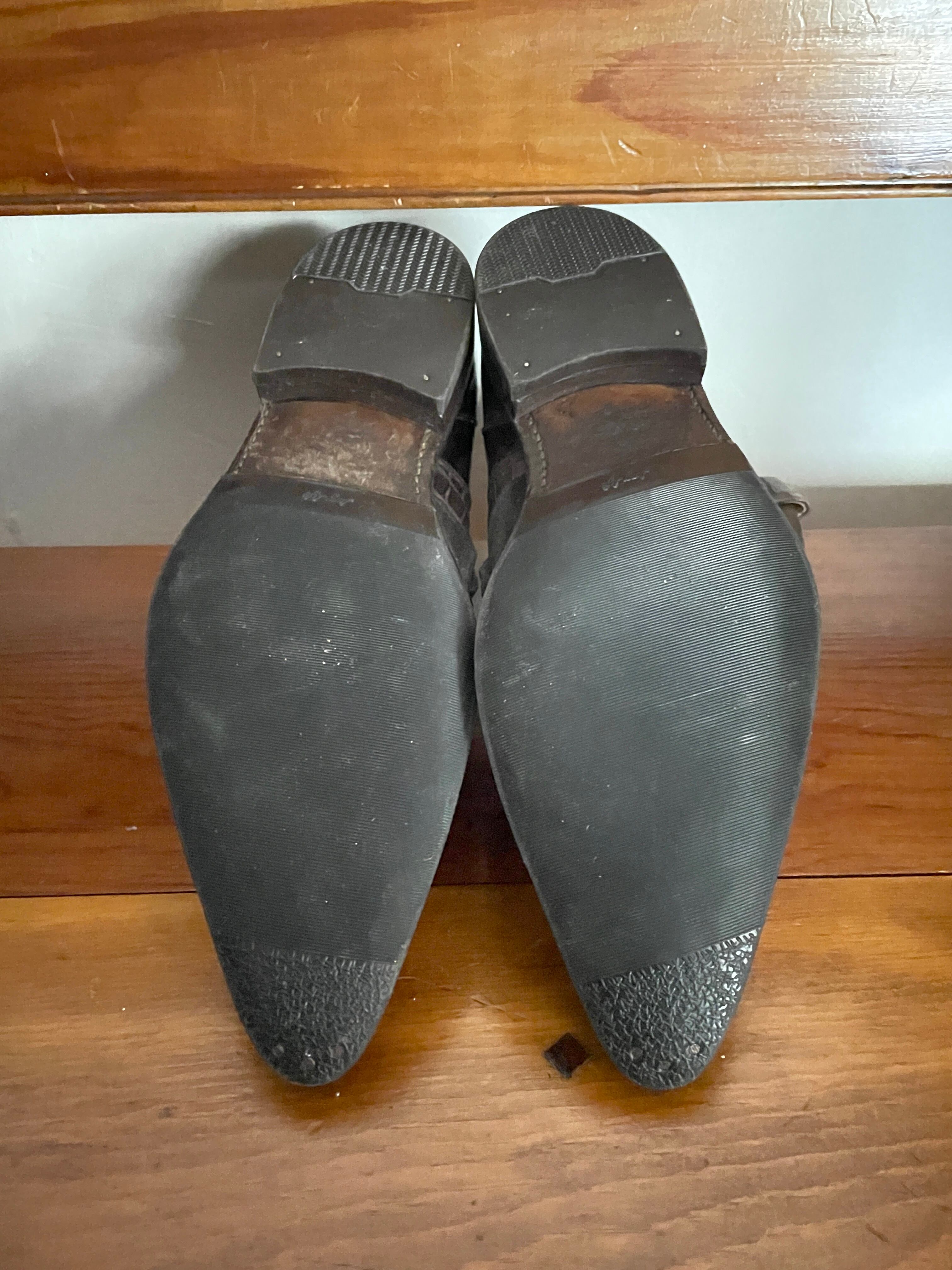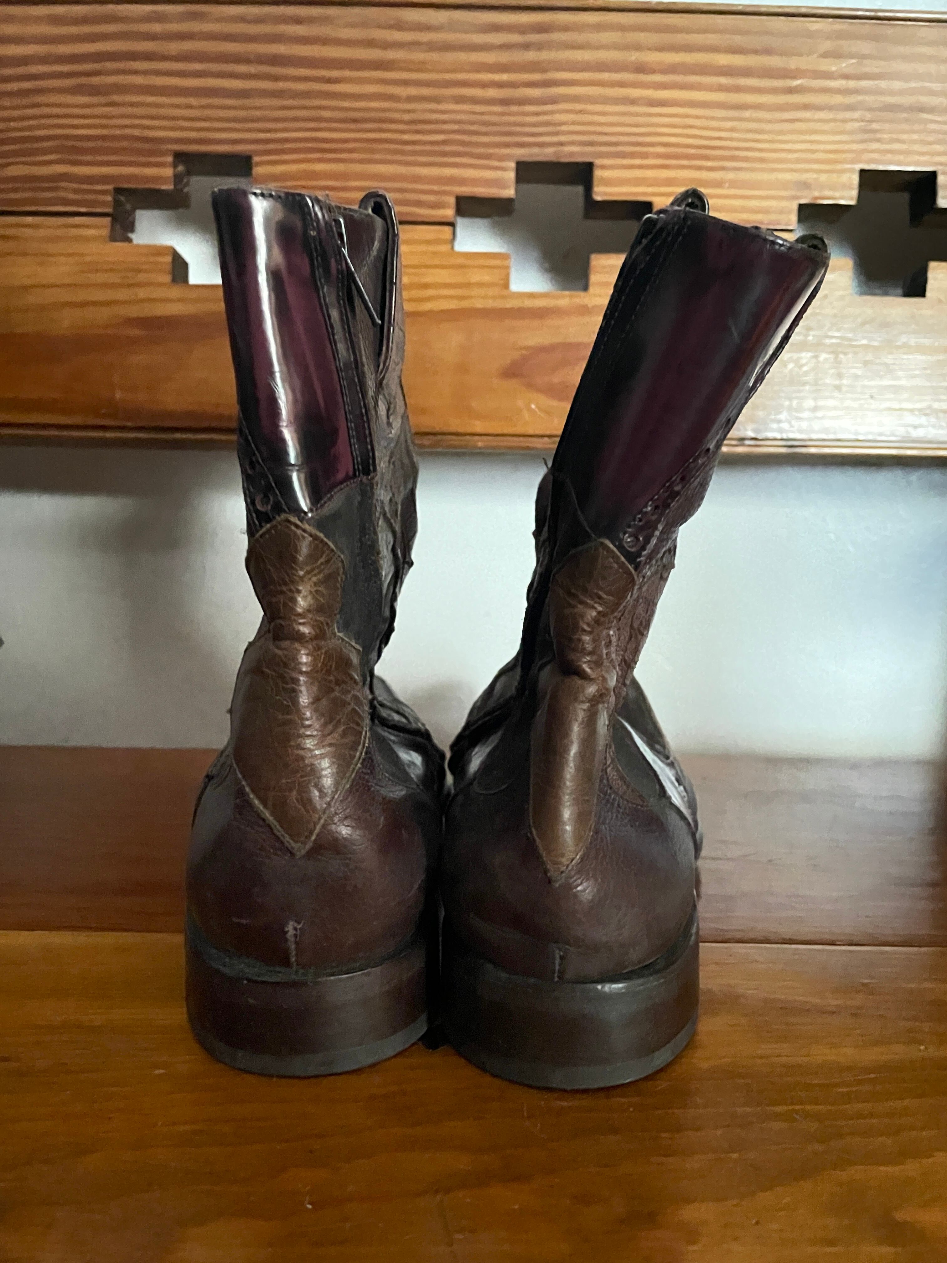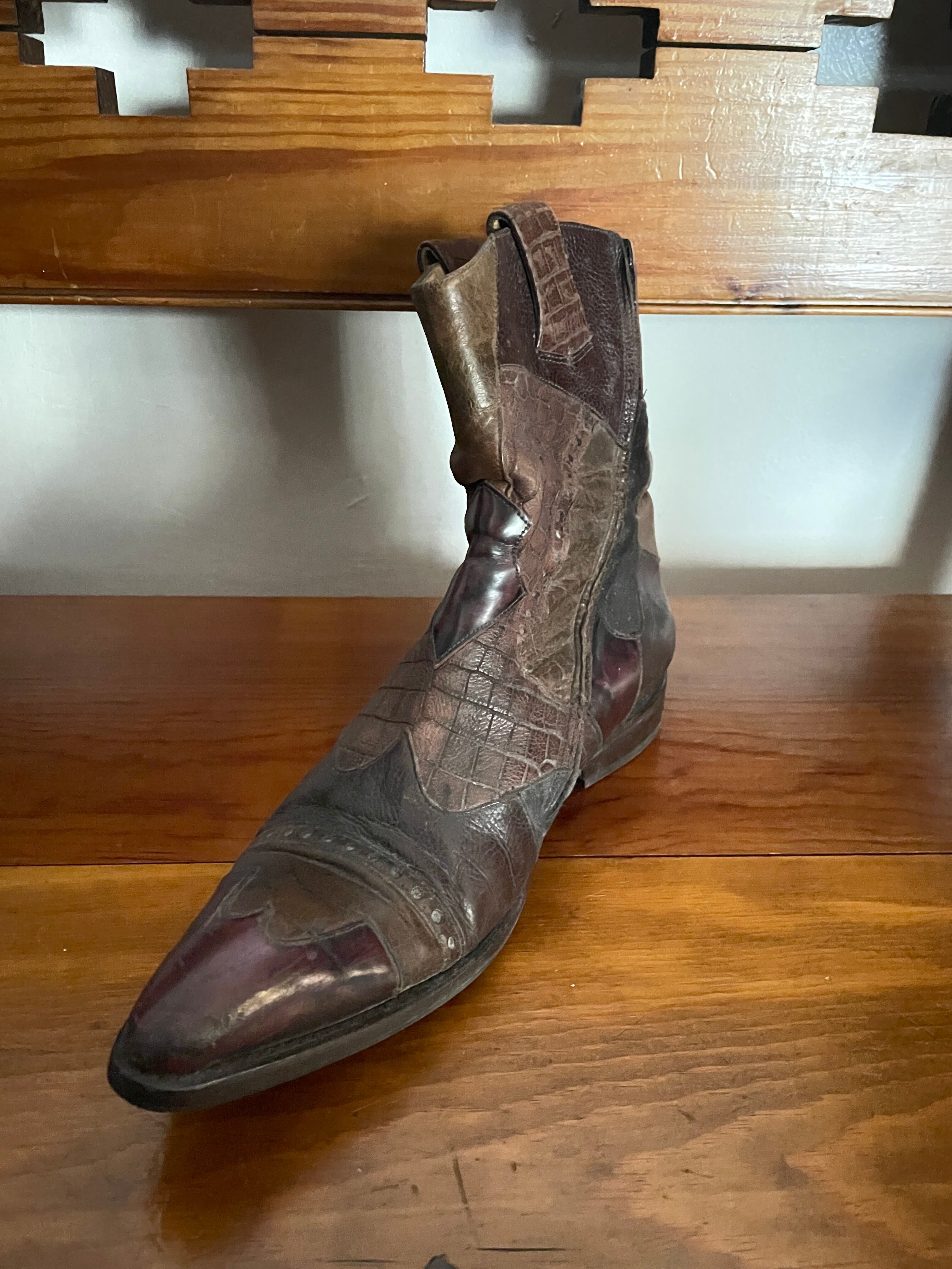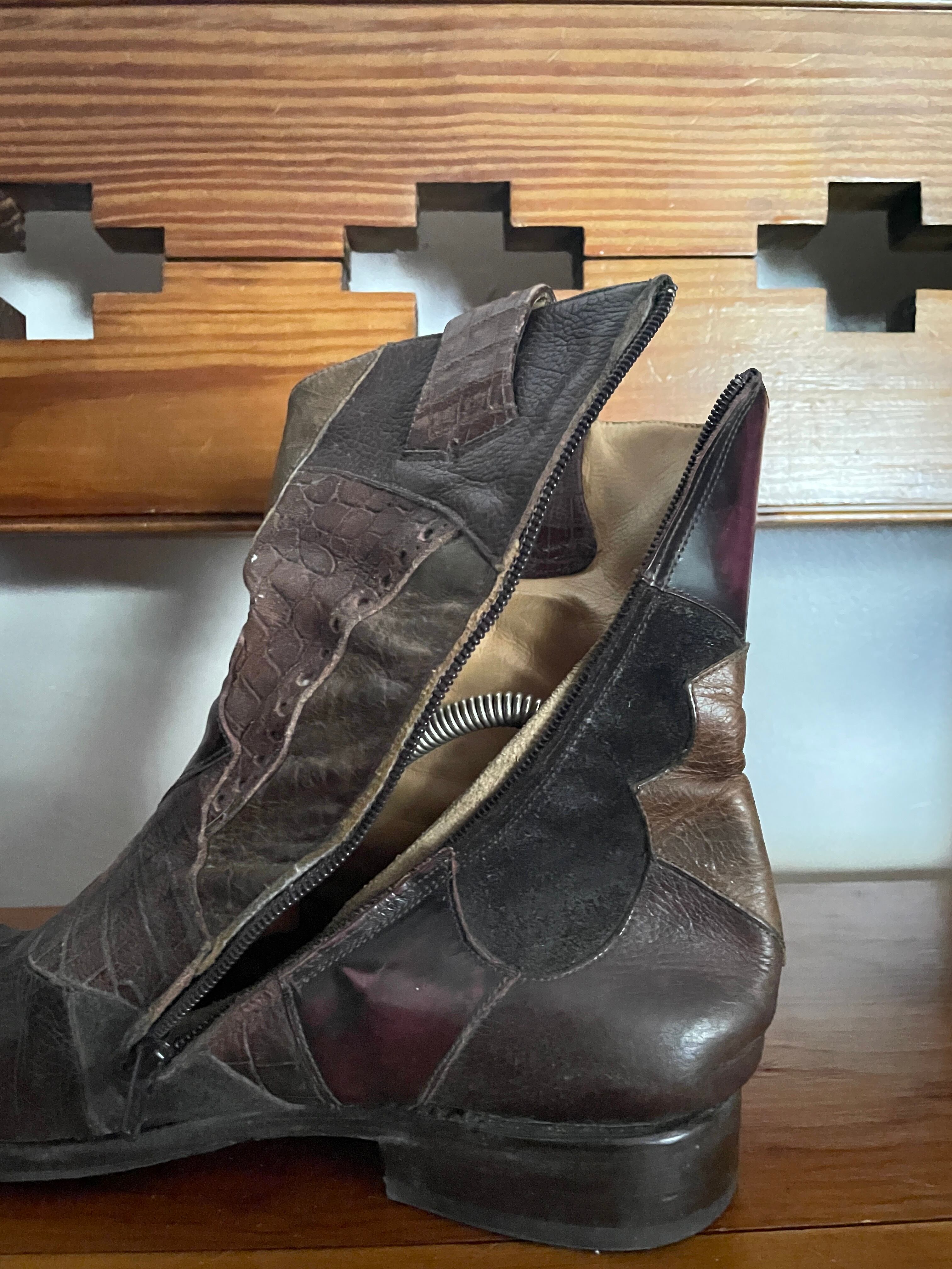様々なブラウン調の様々な柄が施された、ウエスタンブーツ。70年代の雰囲気を感じさせれるディテール。つま先がとんがっているシャープめなシルエット。内側に捩れたサイドジップも珍しいです。単色のウエスタンブーツは見かけますが。こういった雰囲気のある柄のウエスタンはなかなかレアかと思います。サイズも大きめで、ファッションのメインになってくれそうな一足です。ソールの減りも少なくコンディションも◎です。