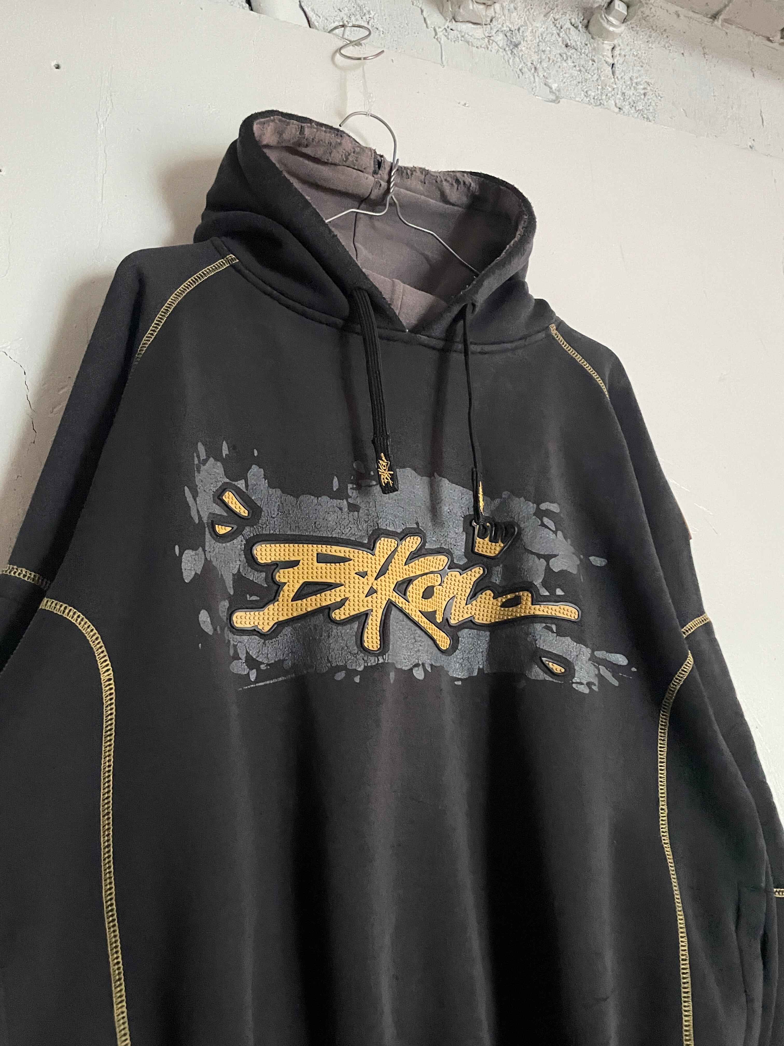 褪せたブラックボディに、イエローステッチとゴムのようなパッチデザインが施されたパーカー。Y2Kな雰囲気が感じられるディテール。フロント以外にも、ポイントでブランドパッチが施されています。非常にバランス感のい良い1着です。肘当ても付いていて、コットンポリのしっかりとした生地感。短丈でありながら、身幅たっぷりな今っぽいシルエットになってます。フード、袖口、裾部分のダメージもまた堪らなくかっこいです。