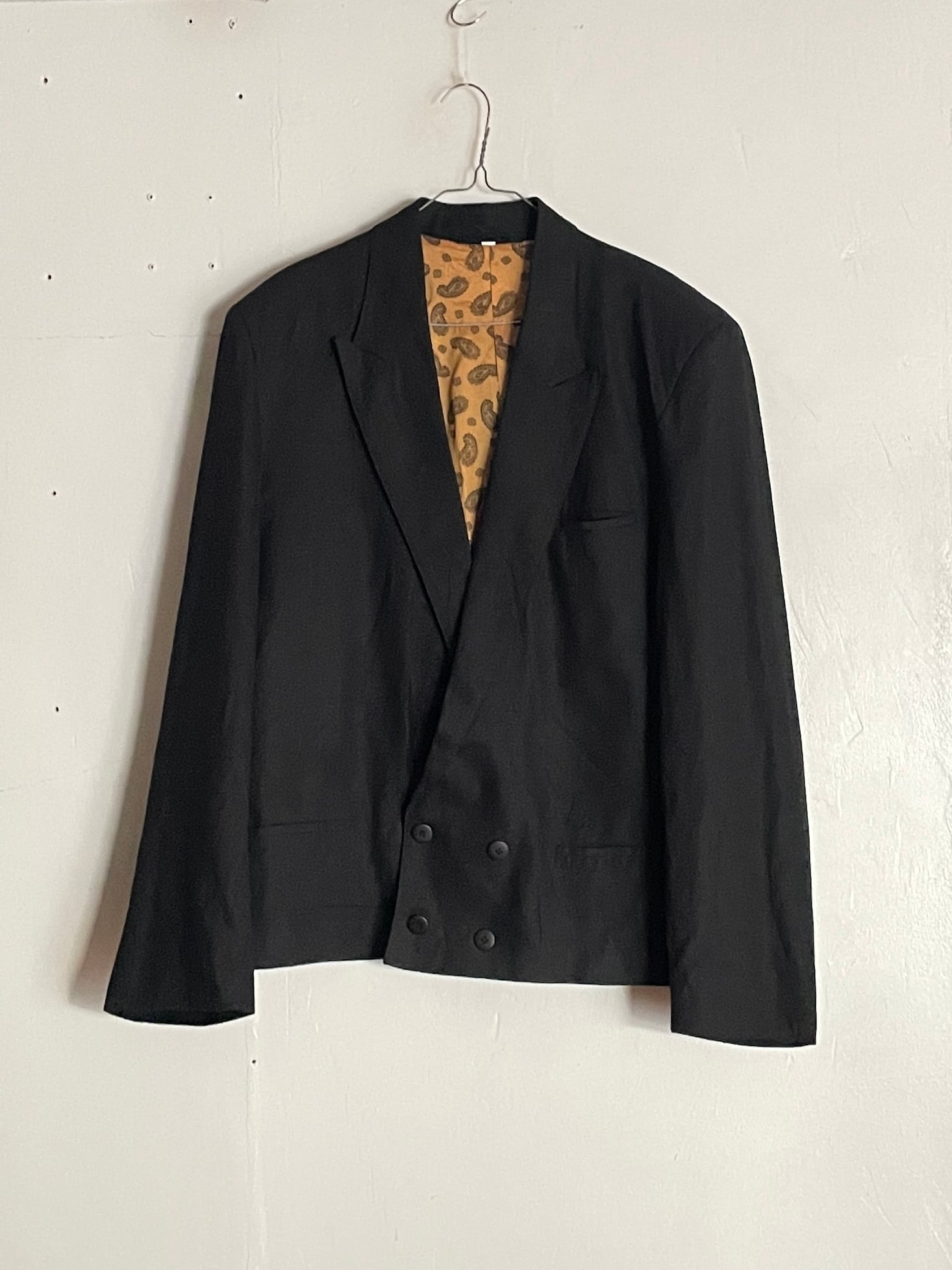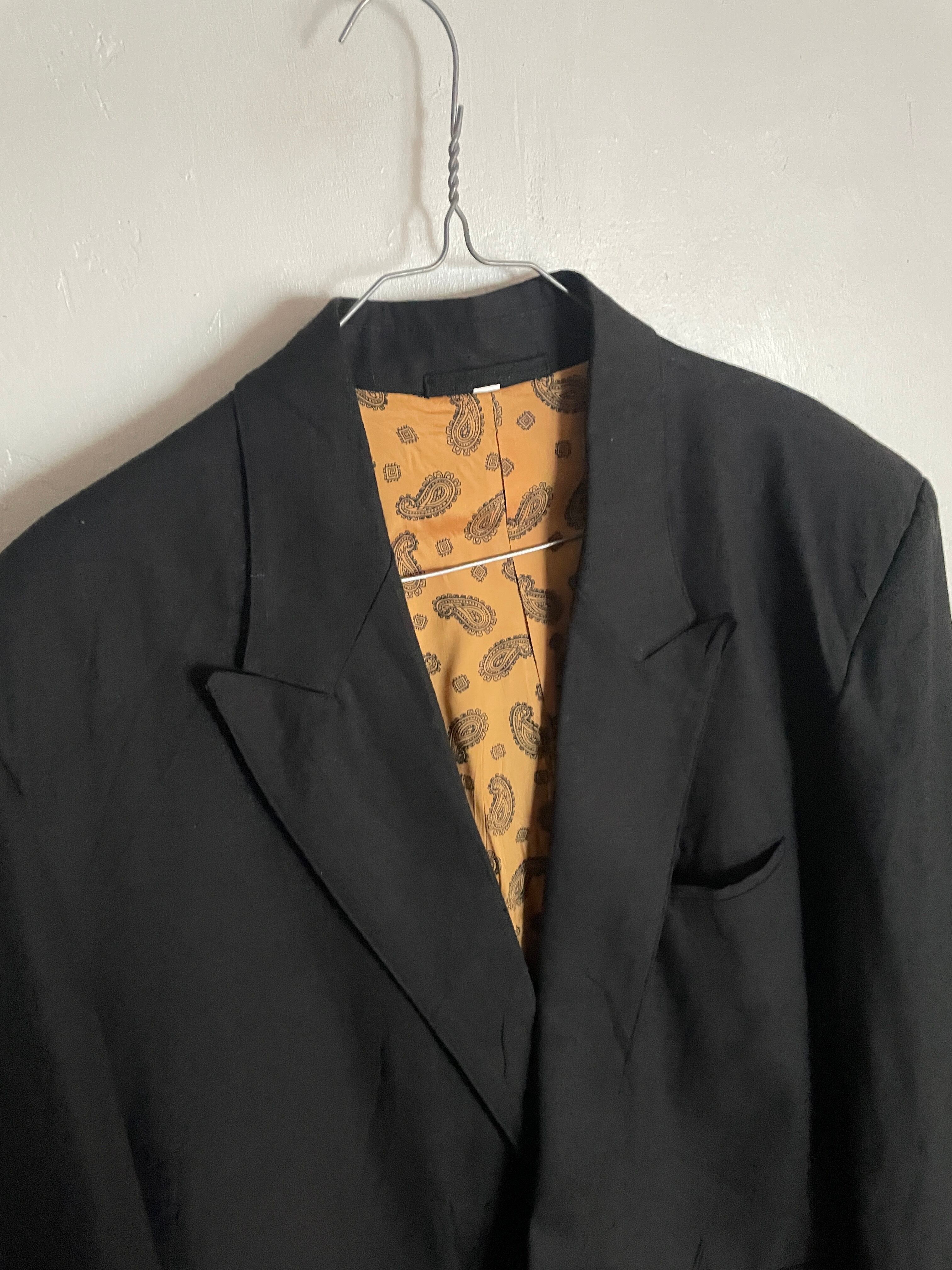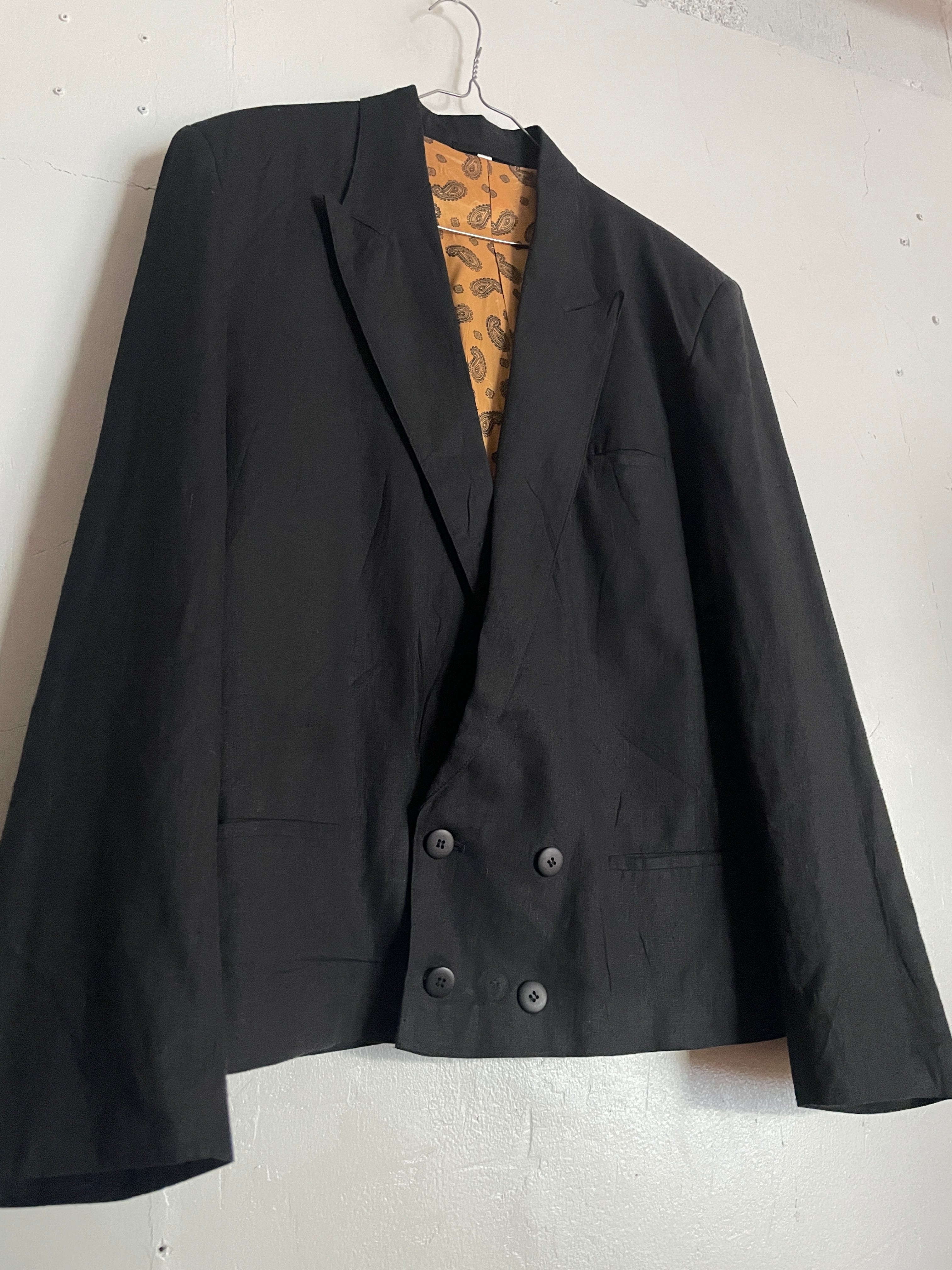 ブラックボディーで、サラッとしたリネンとコットン素材の、ダブルテーラードジャケット。普通のテーラードジャケットよりも、カチッとし過ぎず、ラフに着られそうです。まさに春アイテム。裏地は派手さのあるペイズリー柄になっていて、表裏でメリハリがあるのが魅力的です。ゆったりと着られるサイズ感になってます。
