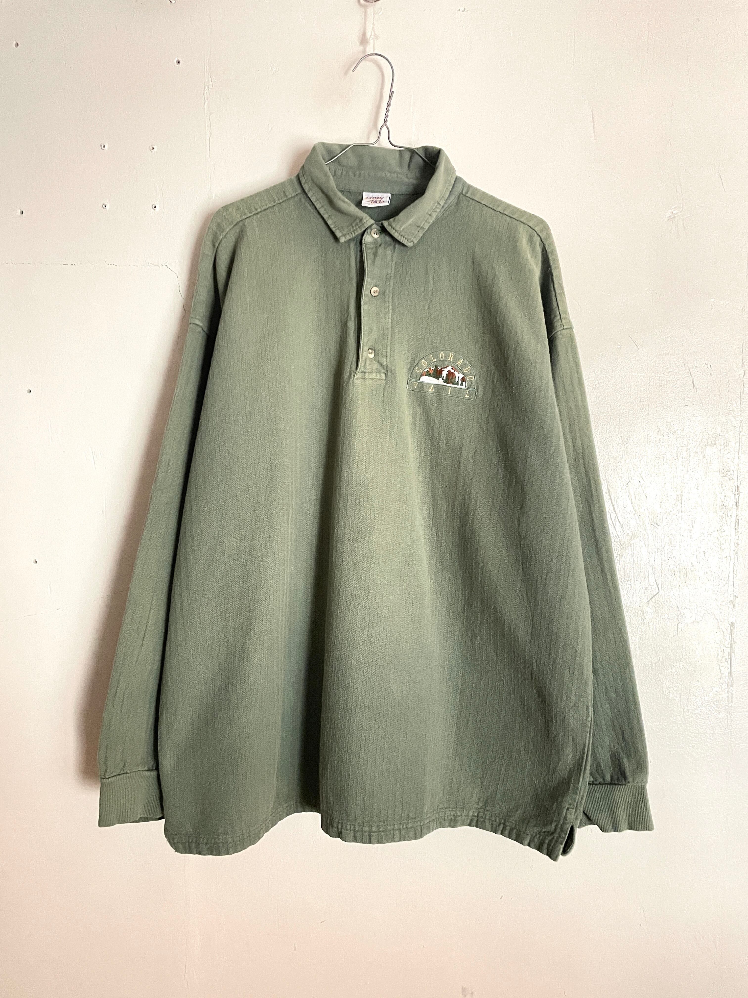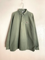 ハワイのホノルルに拠点を置くアパレルブランド、クレイジーシャツのポロシャツ。淡いグリーンカラーで、よく見ると素材の織りによって細いヘリンボーン柄が見られ、立体感のある仕上がりになっています。ワンポイント刺繍のシンプルなデザイン、ややゆったりとしたサイズ感のアメリカ製の一着です。