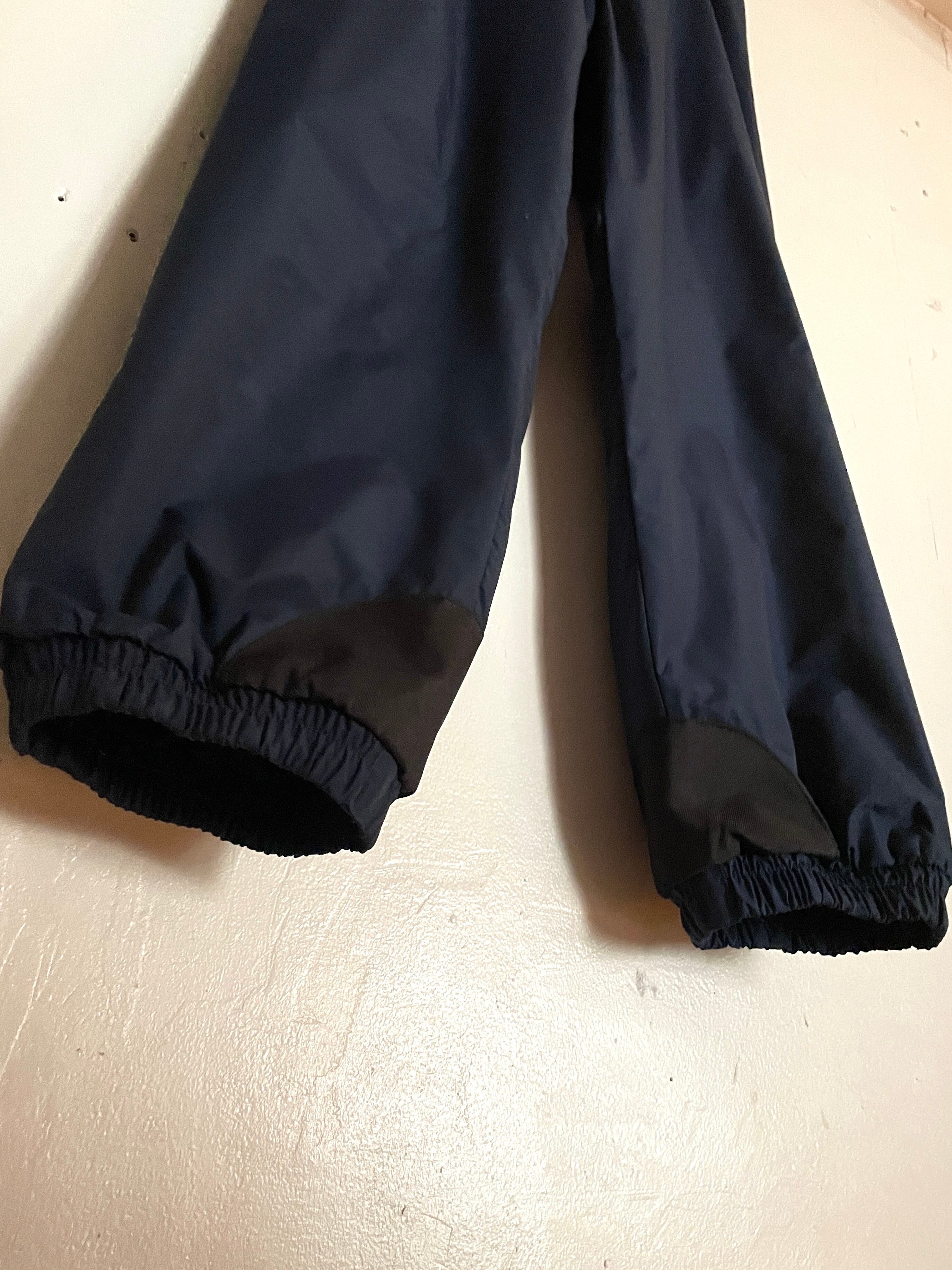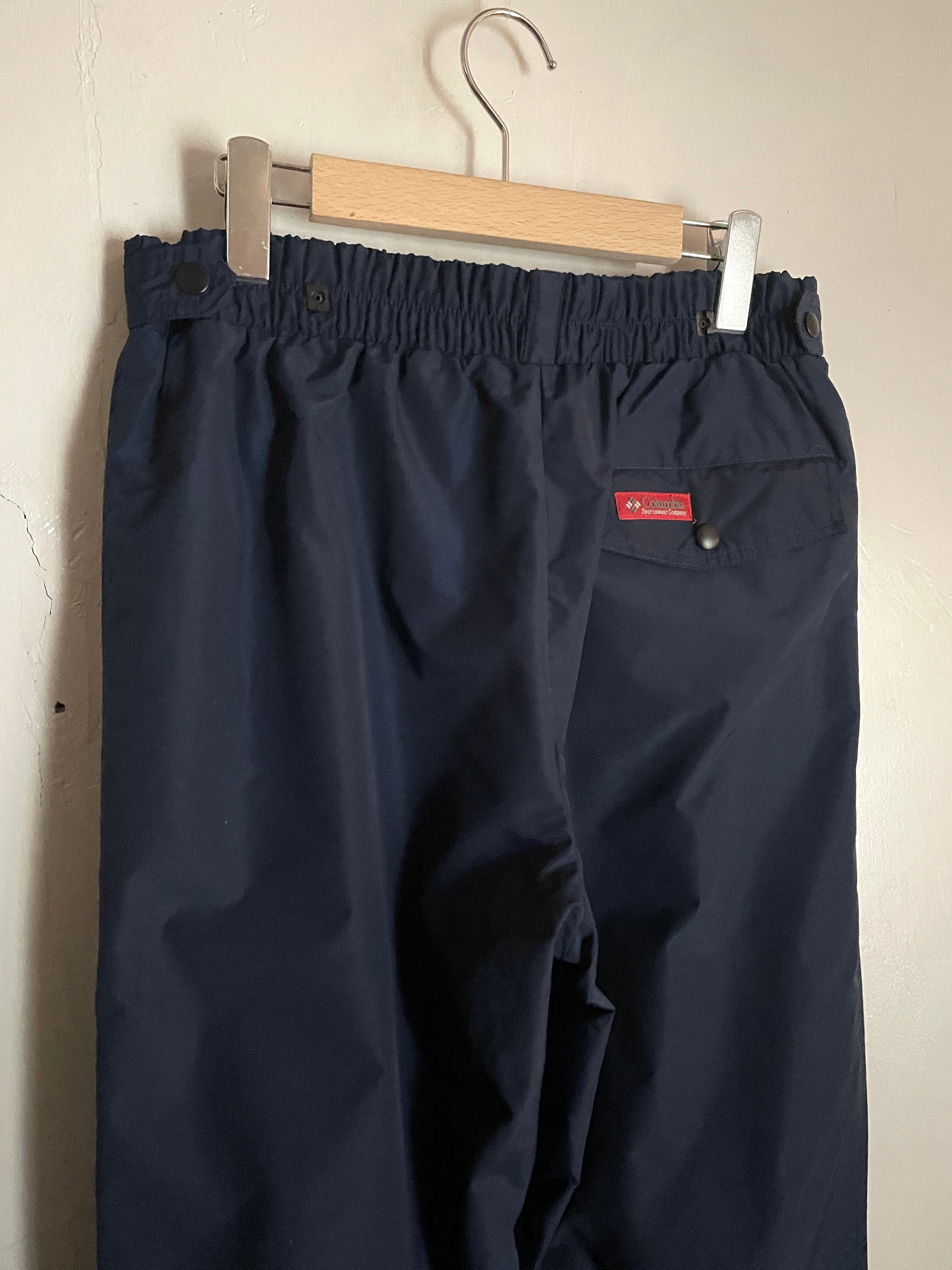 ネイビーのナイロン素材がアクティブで軽い着心地の、コロンビアナイロンパンツ。裾にゴムが入っていて、スナップボタンで裾幅を調整することで、バルーンパンツのようなシルエットを楽しめます。ウエスト部分にもゴムが入り、ホックを使ったアジャスター付きのため幅広いウエストのサイズに対応。ポケットは右バックポケットのみです。