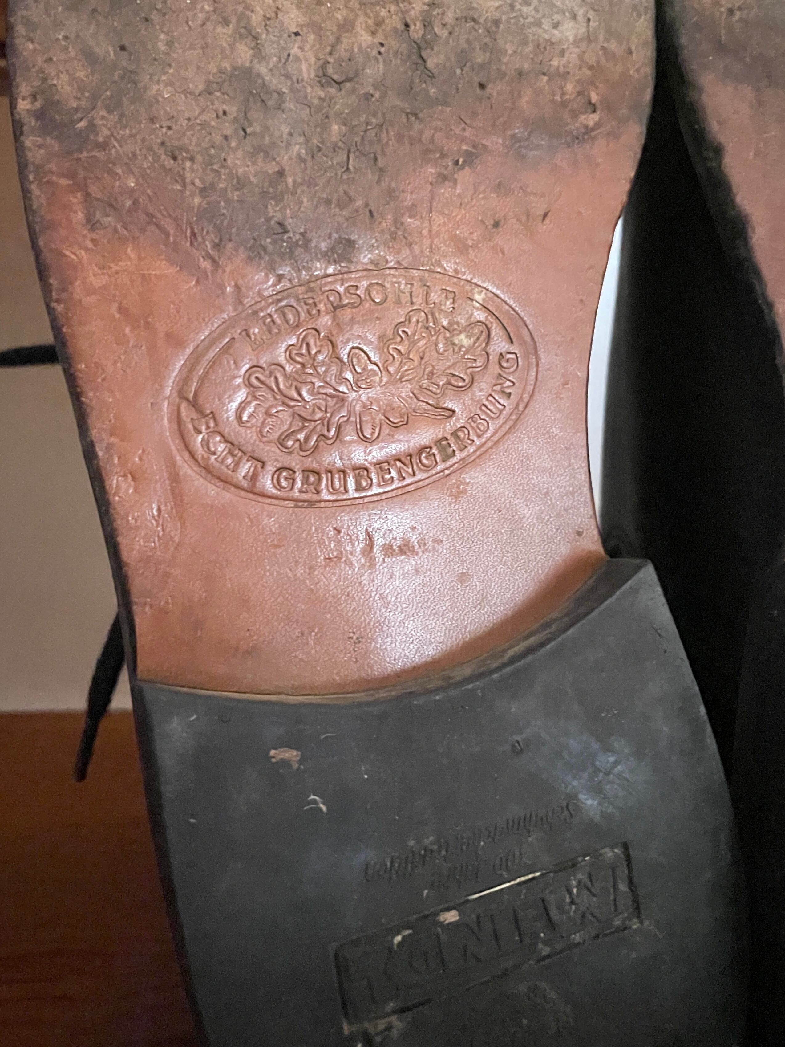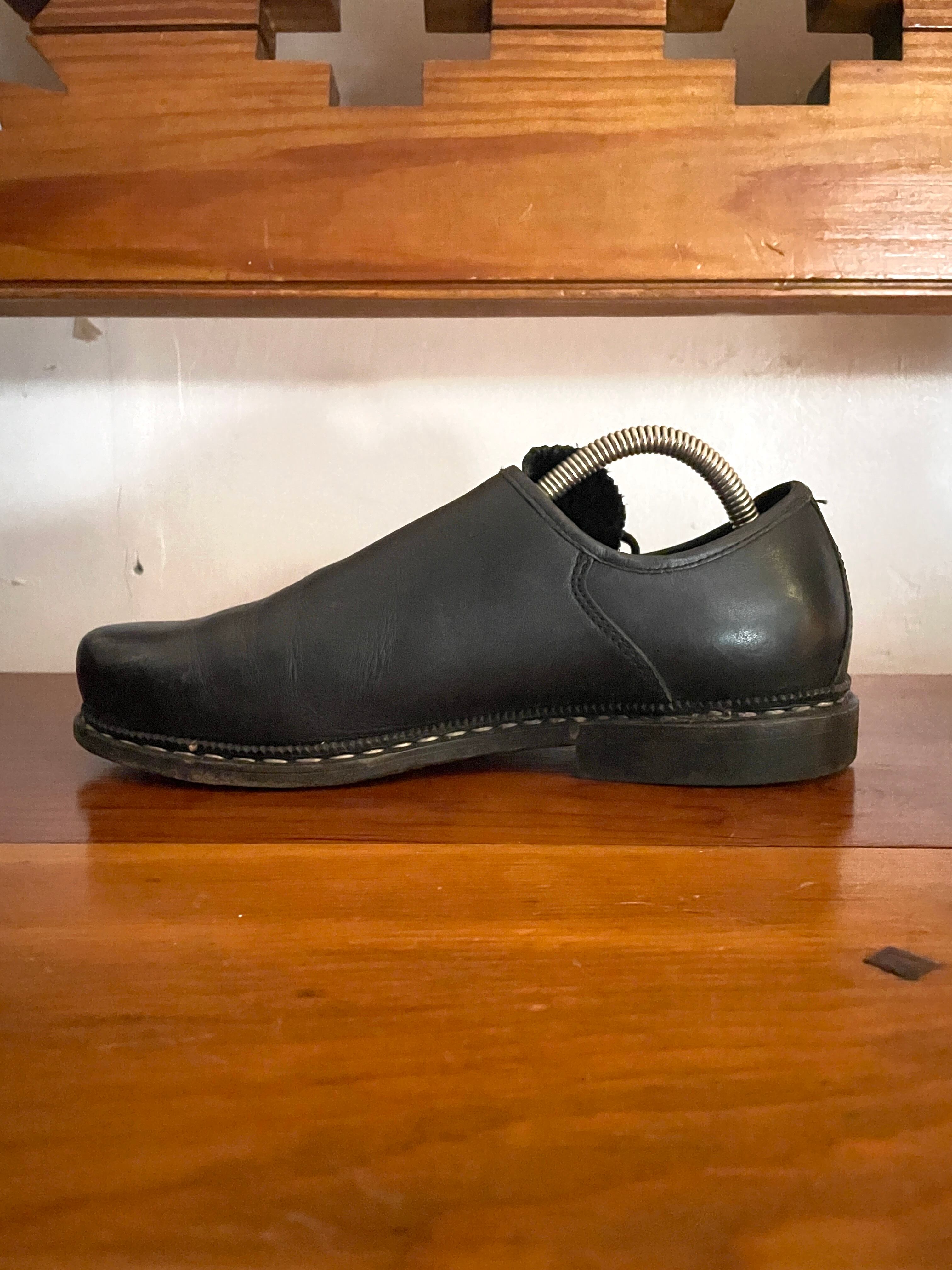 丸みを帯びたフォルムで、斜めにシューレースが付いた珍しいデザインのレザーシューズ。中心部分にタンがないためスッキリとした印象です。レザースリッポン的なデザインで、派手過ぎず、それでも個性を出せる作りになっています。サイズ表記はありませんが、アウトソールの全長が27cmのため、普段25〜25.5cm程度を履く方に丁度良いかと思います。全体的に若干のスレが見られます。