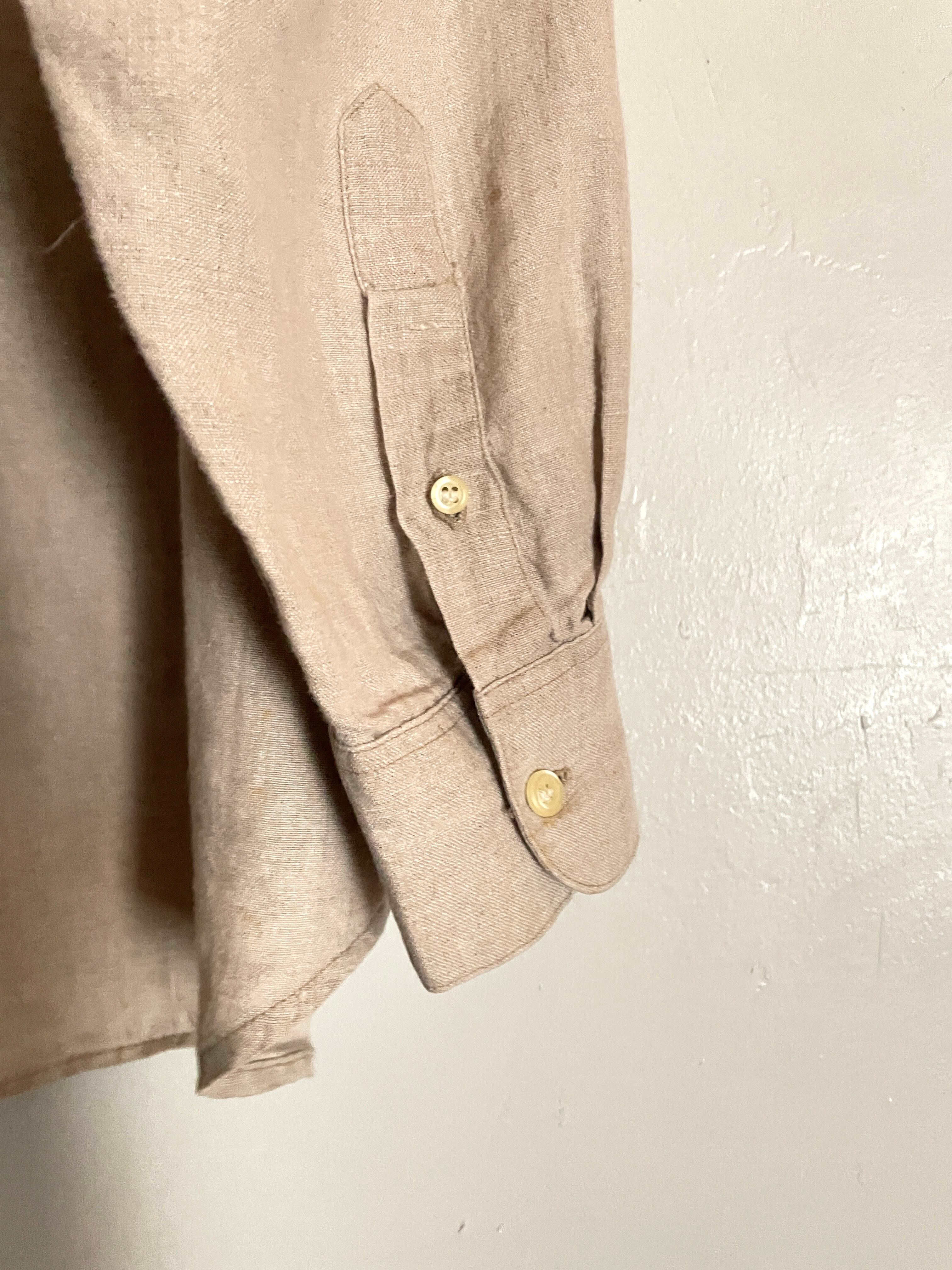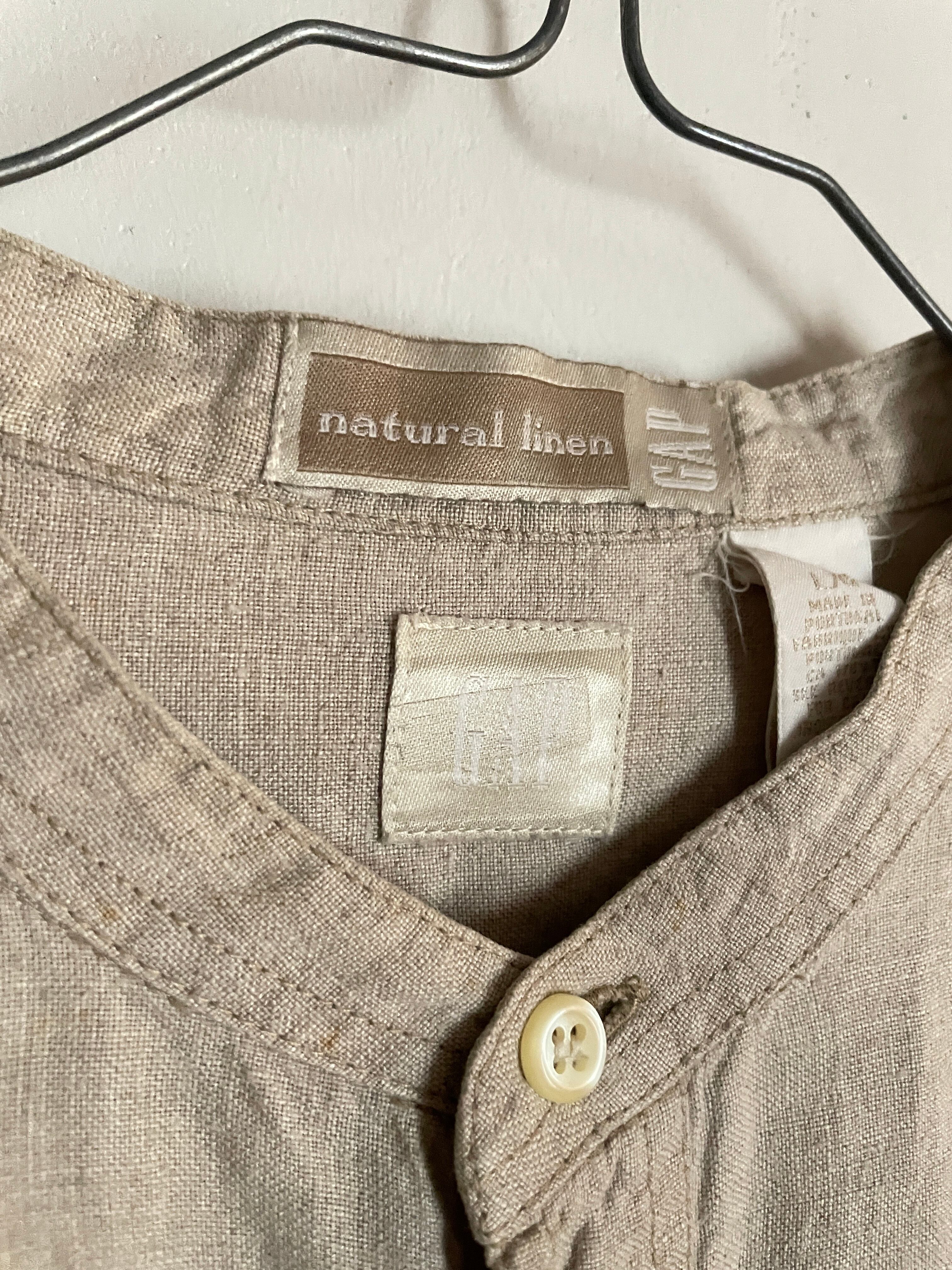 ナチュラルな色味が優しい印象のギャップノーカラーシャツ。無駄のないシンプルなデザインですが、素材に上質なリネンを使うことで、安っぽさのない上品な雰囲気に仕上がっています。素材も色も、春を意識したお洒落な長袖シャツ。襟なしのため、前を開けてカーディガンのようにサラッと羽織るのも良さそうです。袖口付近にシミが見られます。
