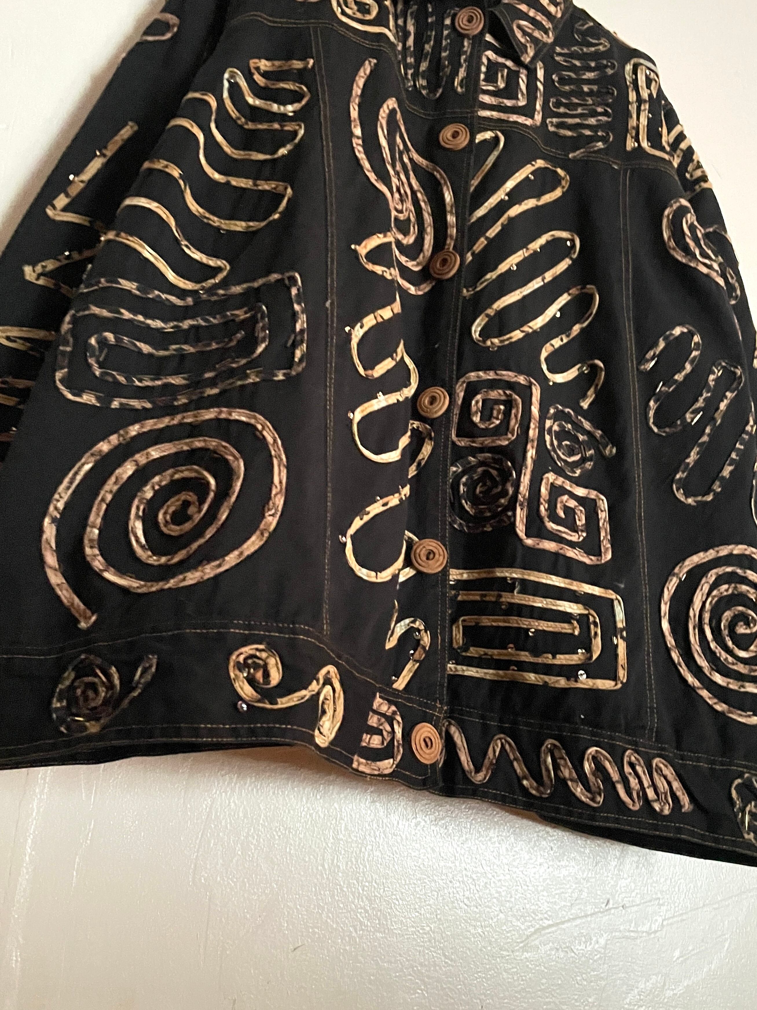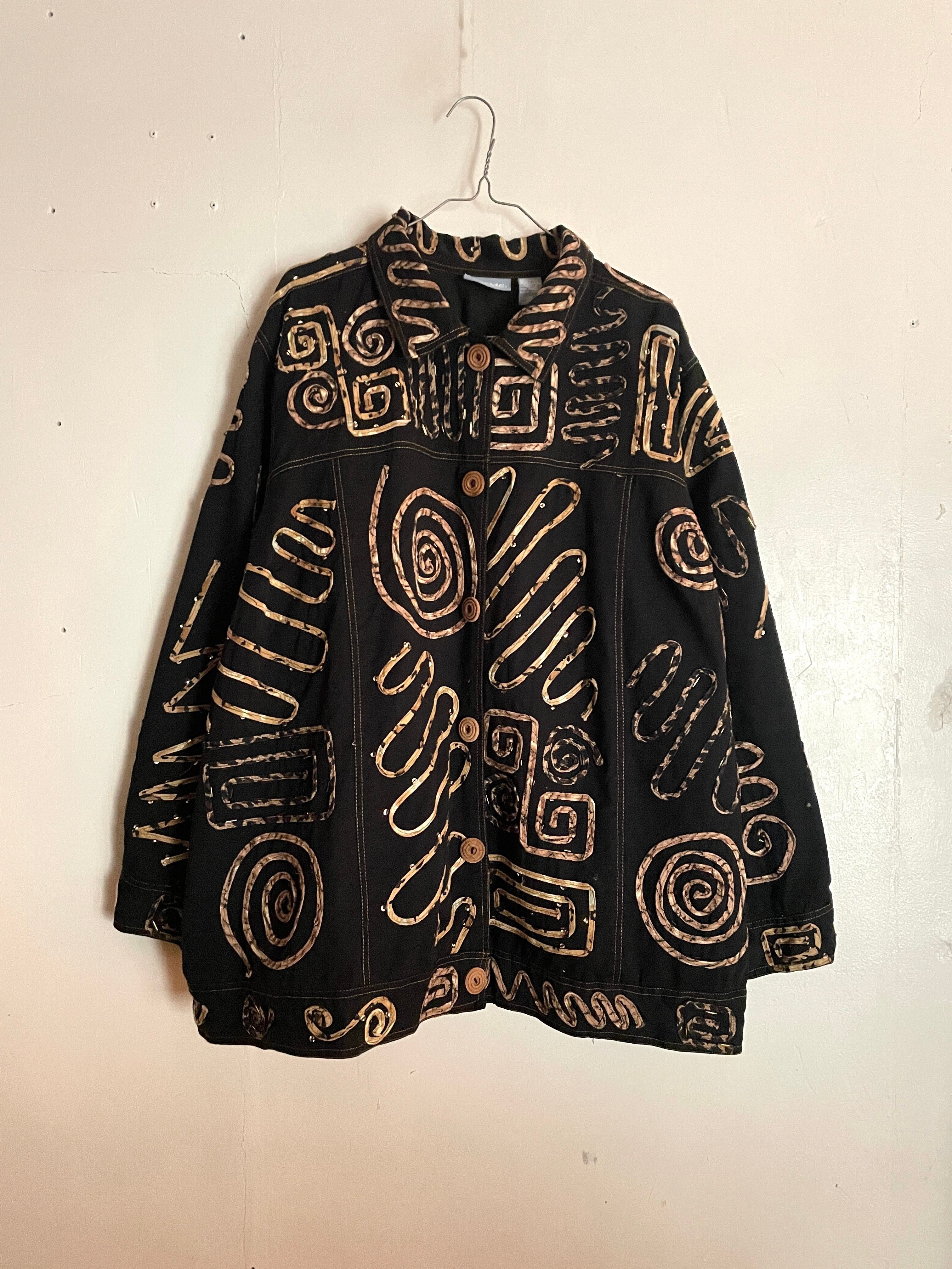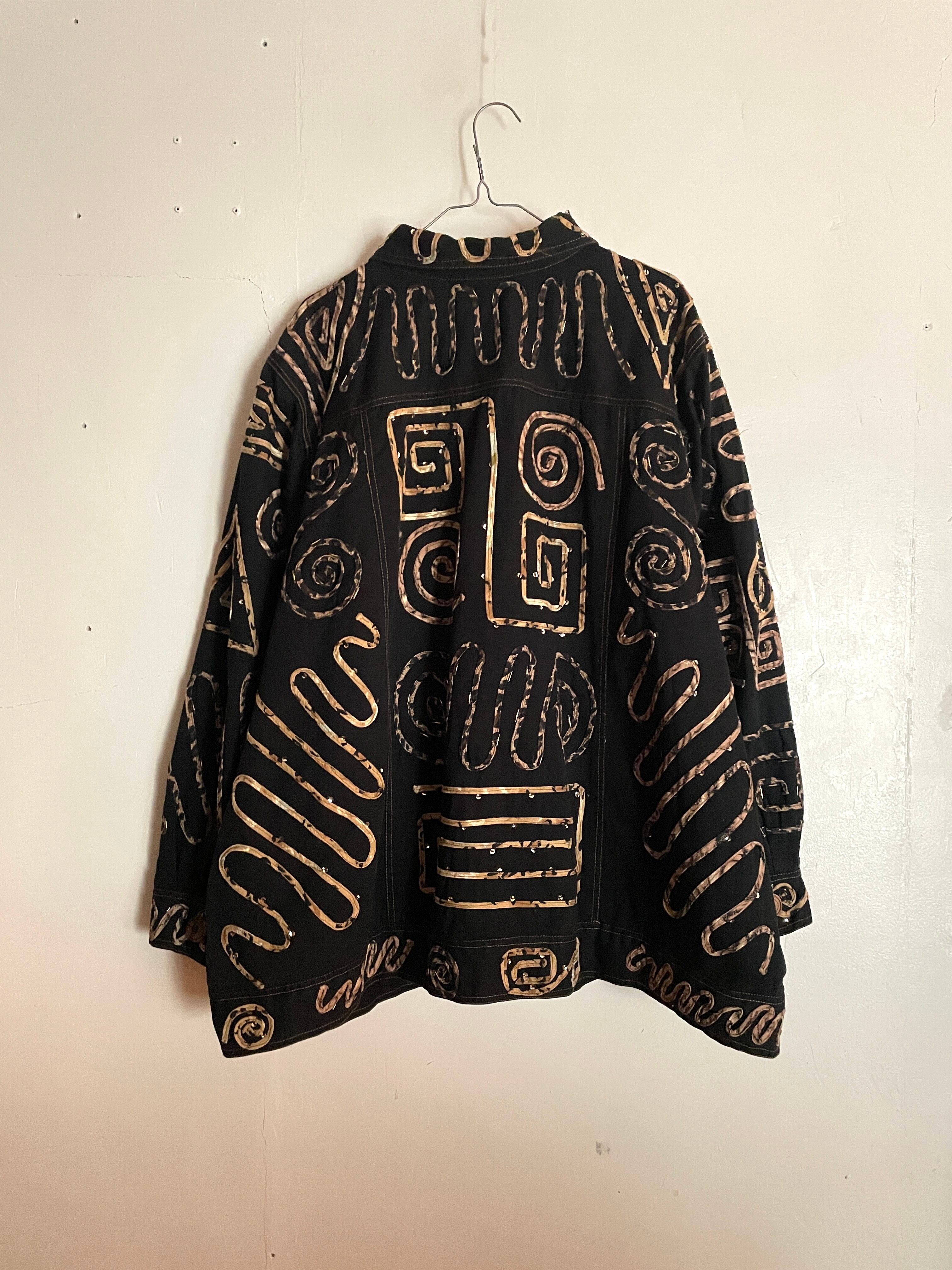 黒のコットンボディに、ランダムに縫い付けられた紐とビーズの装飾が目を惹くデザインジャケット。よく見ると柄入りの紐を縫い付けていたり、ウッドボタンを使っていたりと手の込んだ作りになっています。サイズ表記は3Xと、身幅広めのオーバーサイズ。着用モデルは女性ですが、男性にもおすすめしたい個性的な一着です。ポケットはありません。