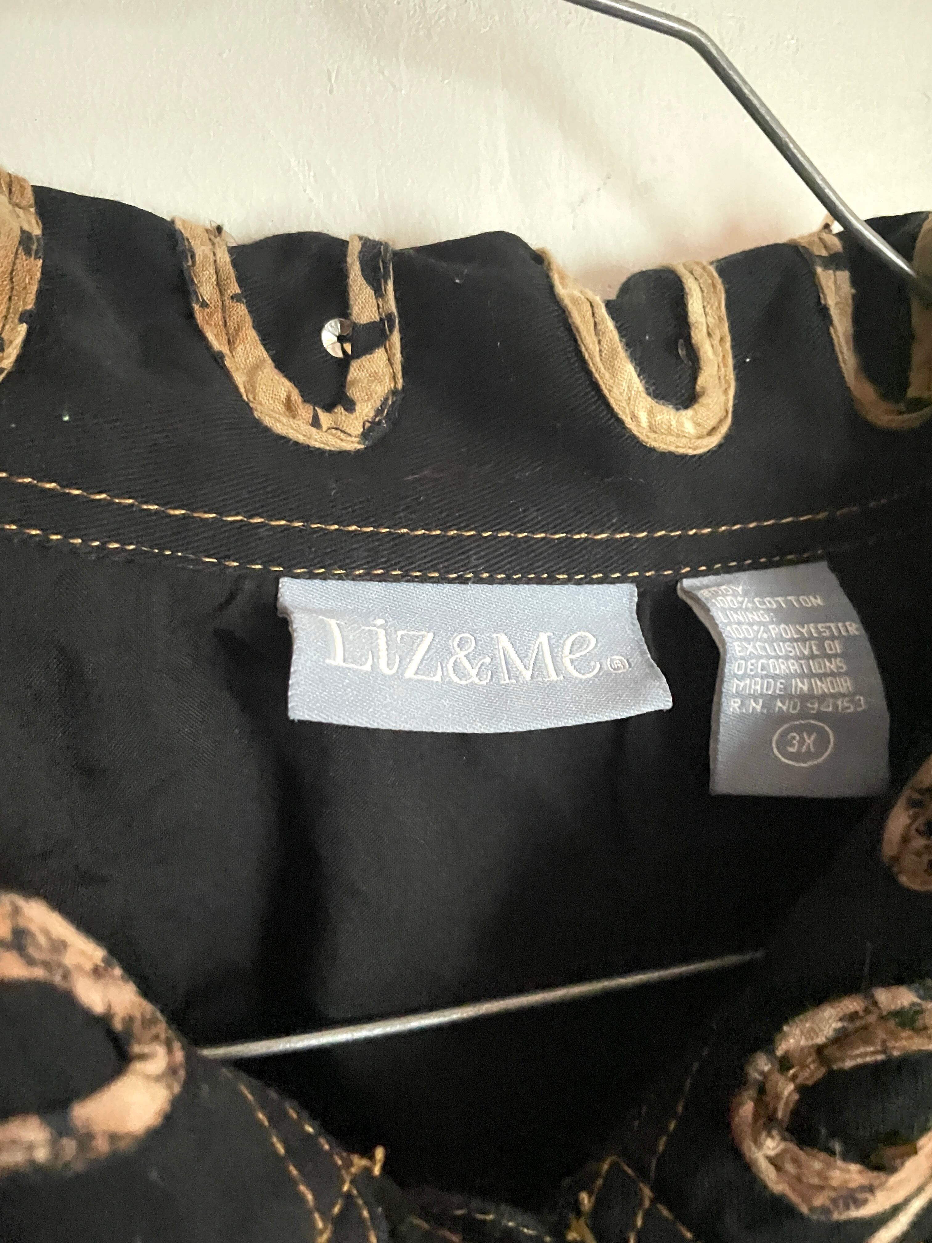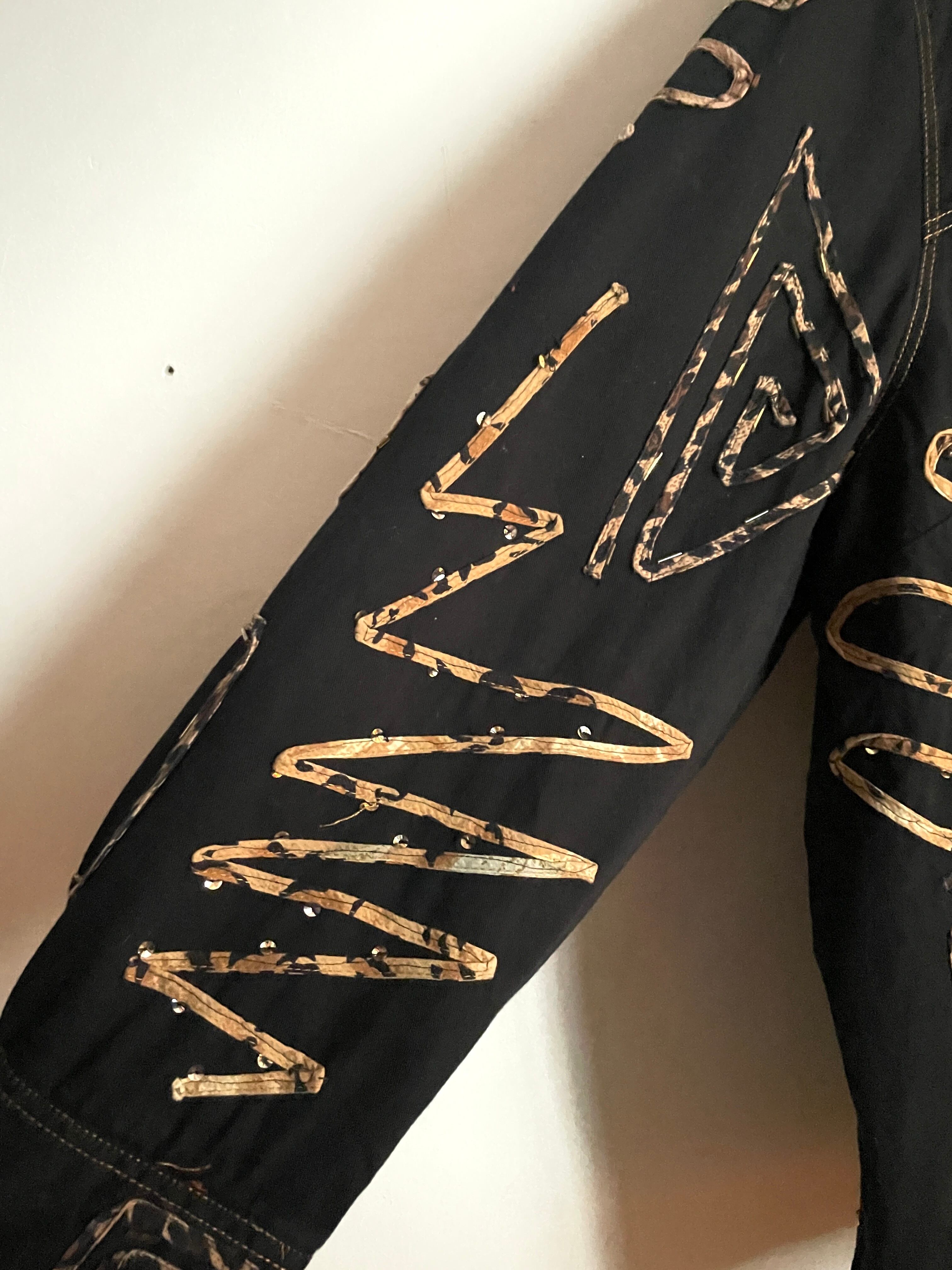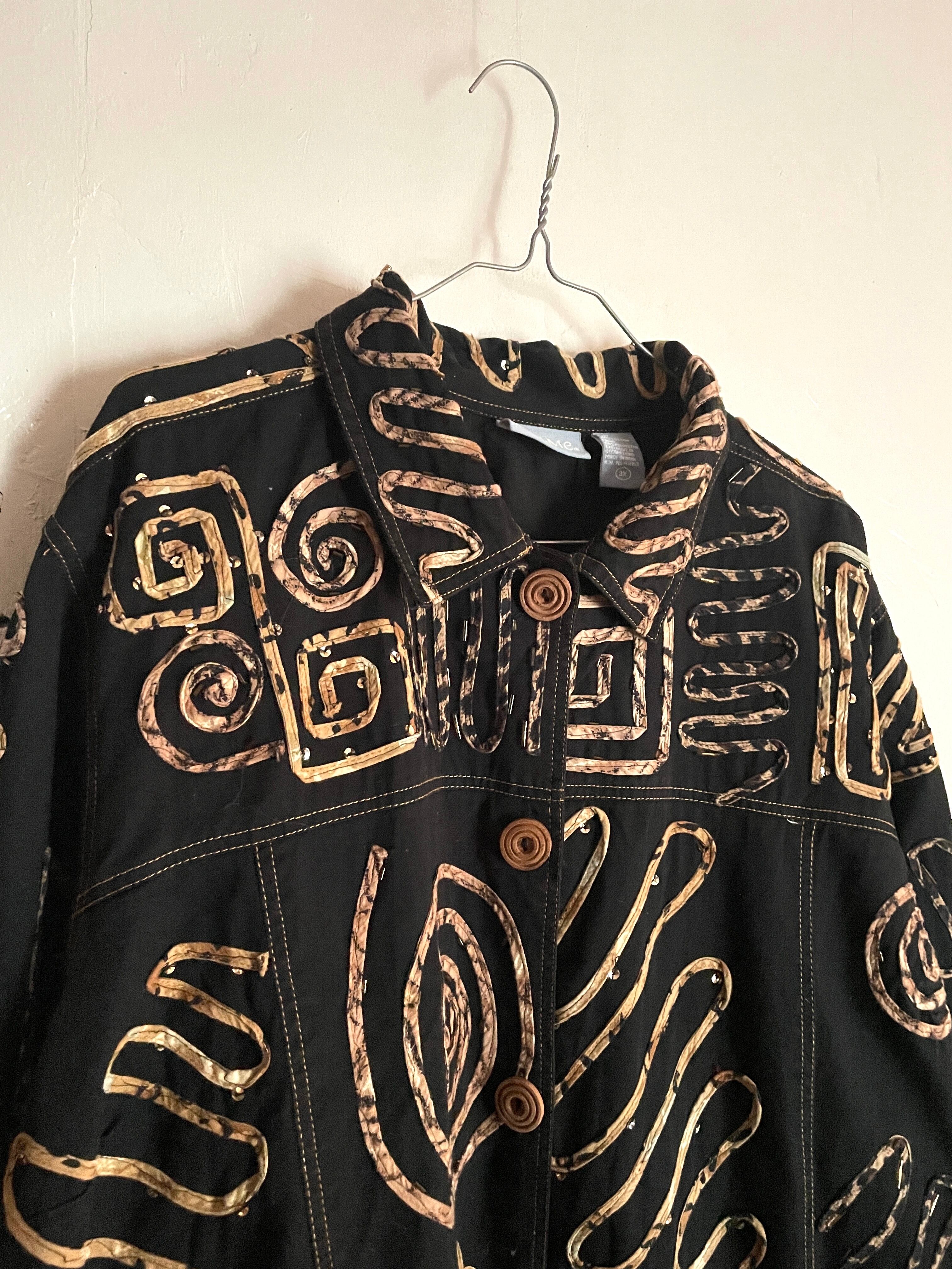 黒のコットンボディに、ランダムに縫い付けられた紐とビーズの装飾が目を惹くデザインジャケット。よく見ると柄入りの紐を縫い付けていたり、ウッドボタンを使っていたりと手の込んだ作りになっています。サイズ表記は3Xと、身幅広めのオーバーサイズ。着用モデルは女性ですが、男性にもおすすめしたい個性的な一着です。ポケットはありません。