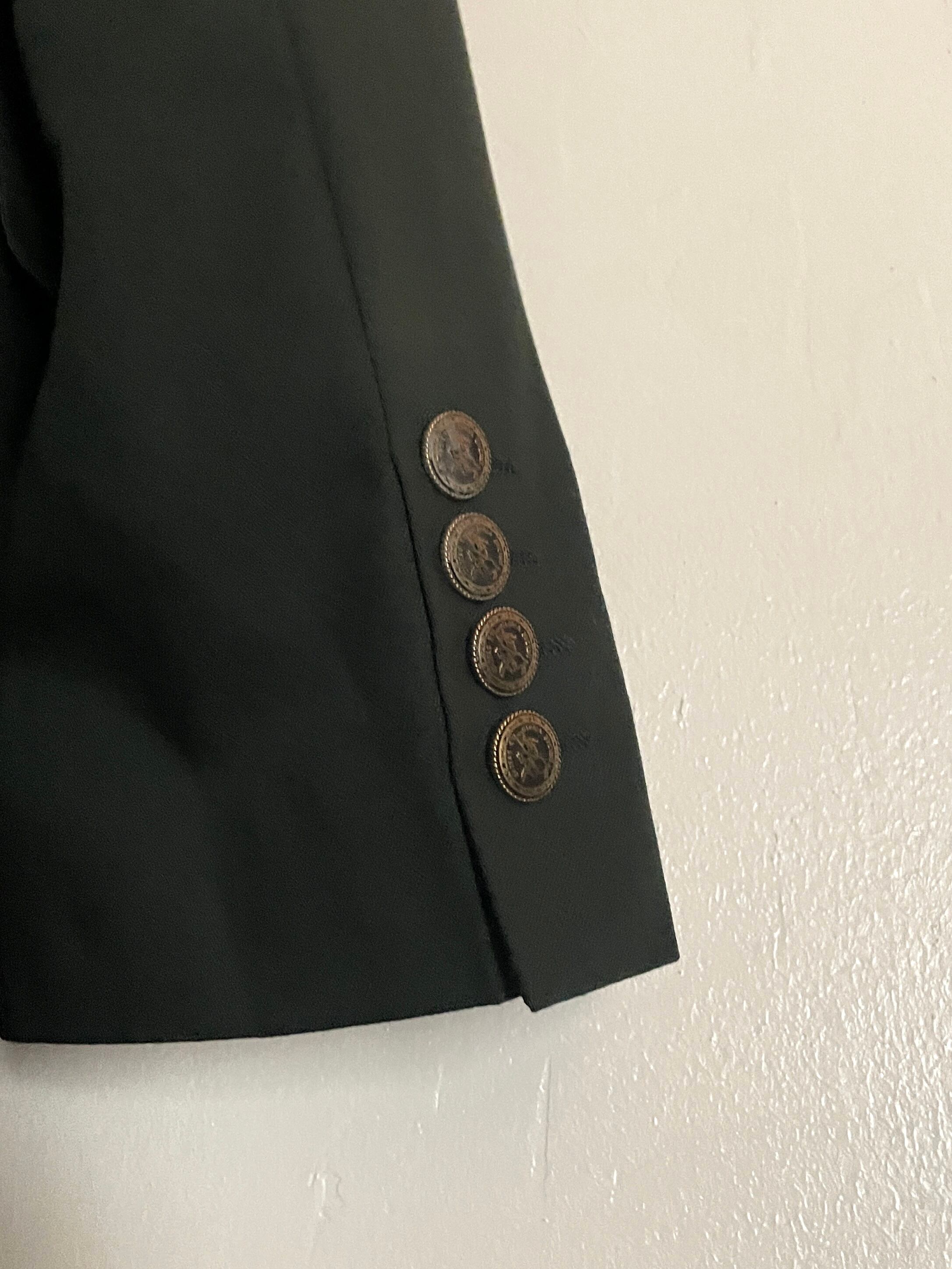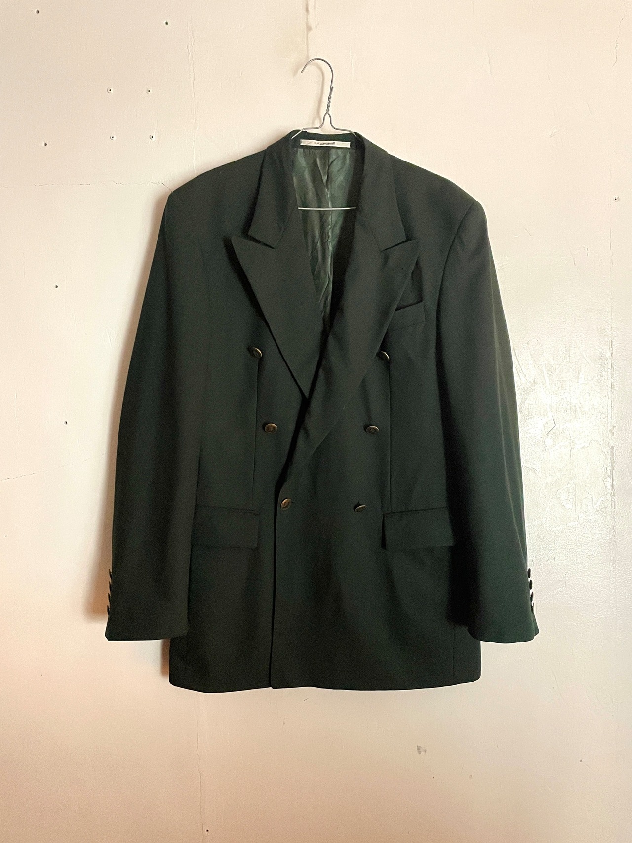 濃いめのダークグリーンで、メタルボタンが使われたダブルテーラードジャケット。ゆったり着れるオーバーサイズで綺麗に仕立てられています。肩幅も大き過ぎず、全体のバランスが良く取れた一着。柄入りの裏地もお洒落です。素材感もこれからの時期に丁度良いかと思います右袖に小さなダメージが見られます。