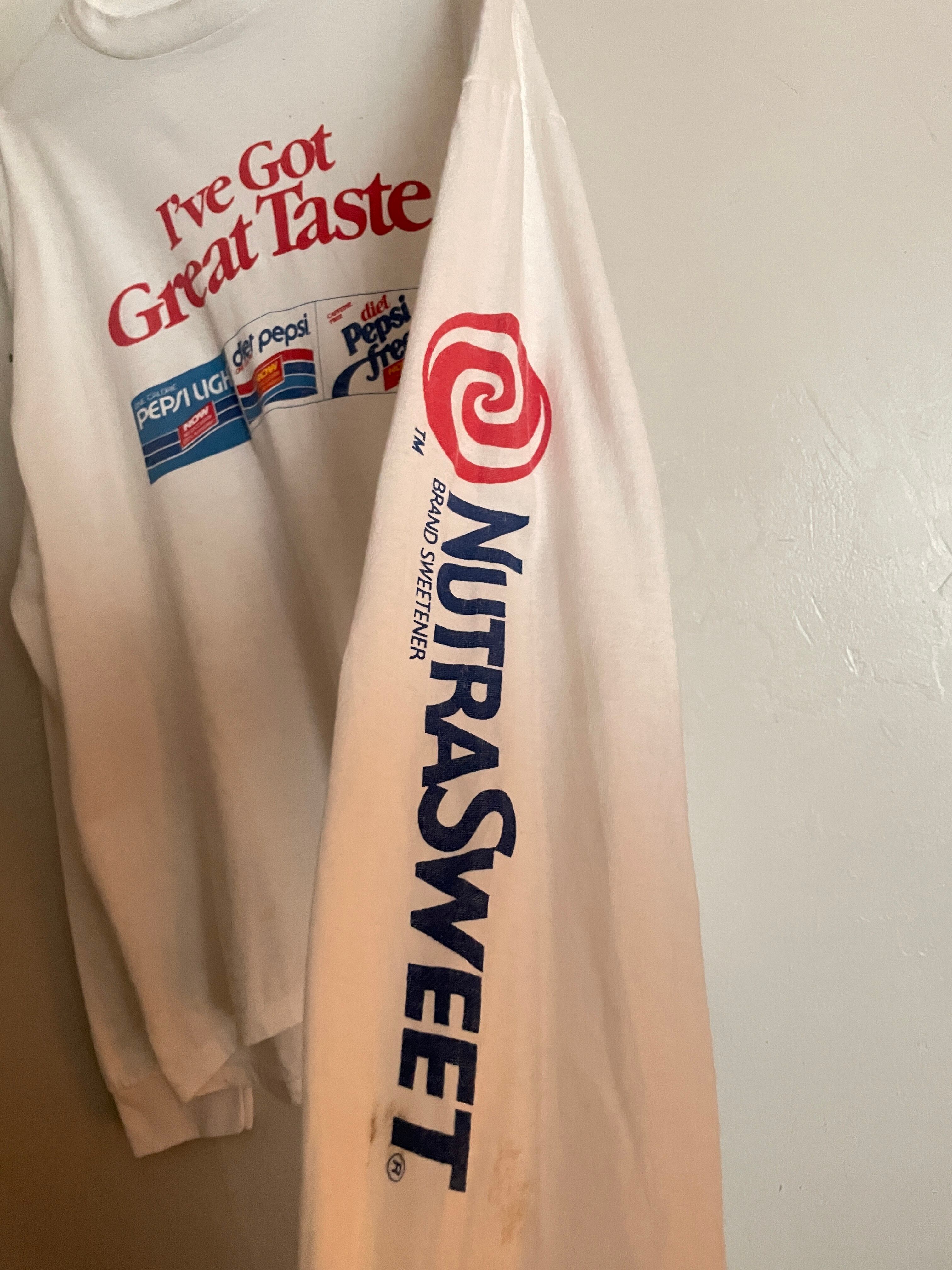 ヴィンテージTシャツでお馴染みの、USA製ファン・ティーズのボディに、ペプシのプリントが施されたロンT。左袖だけカットオフされた雰囲気大の一着。時代を感じられるフォントやロゴデザインで、オールドな雰囲気が味わえるTシャツです。袖にはダイエットペプシには入っている、甘味成分の企業”ニュトラスウィート”のロゴプリント。ゆったりとしたサイズ感で、春には確実に活躍してくれそうです。飲料系コンテンツの中でも人気の高いペプシ。着ごたえ抜群のアイテムです。左袖のカットオフ、所々に小さな汚れが見られます。