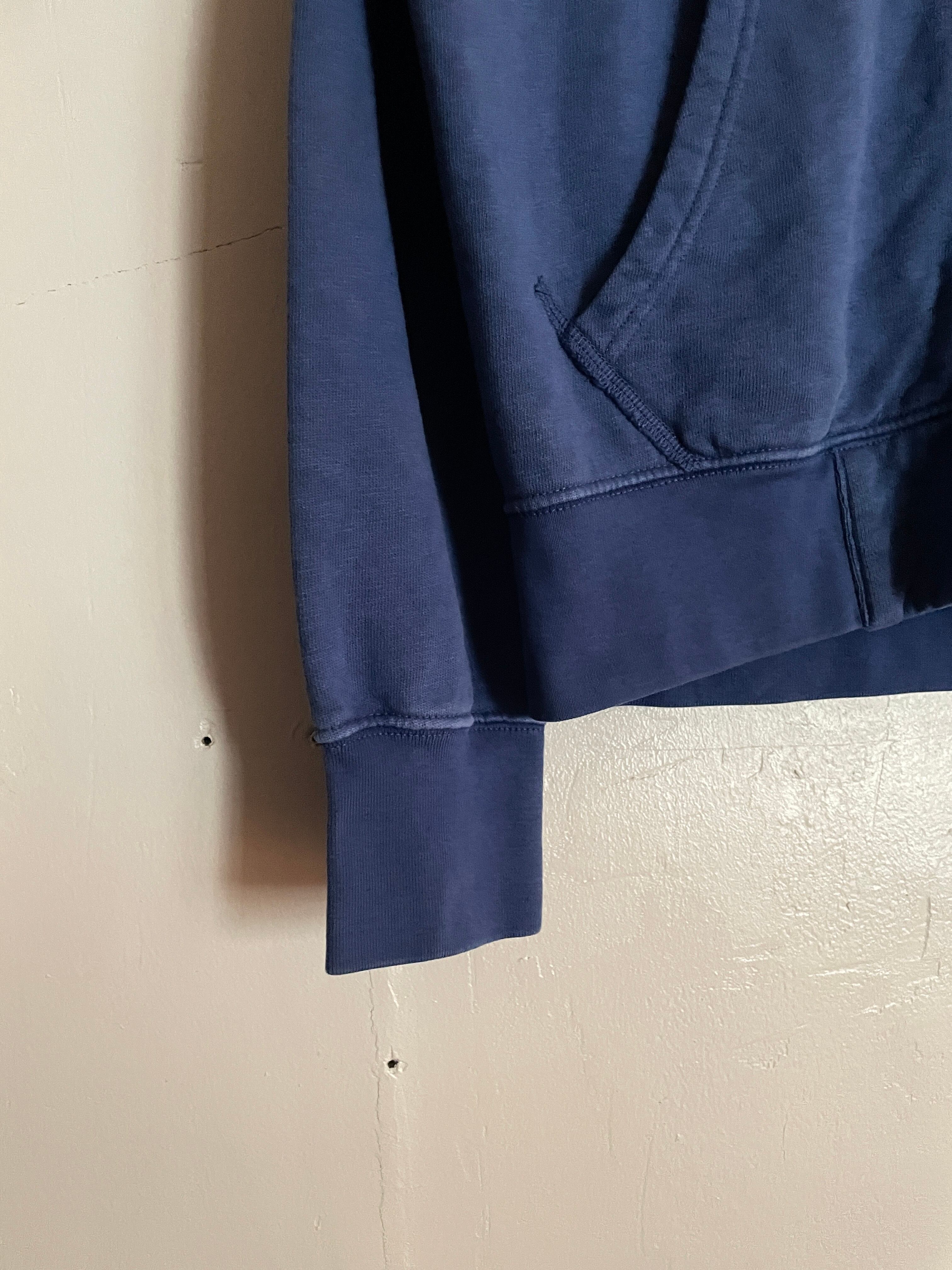 やや褪せたブルーボディに、ワンポイントでブランドロゴの刺繍が施された、ラルフローレンフルジップパーカー。レッドのラルフロゴが良い差し色になってくれています。しっかりとした厚みのあるコットンポリ素材。フードの立ちも良く、状態も◎。短丈めなシルエットで今っぽく着られそうです。ラルフのジップパーカーは高騰も激しく、人気の高いアイテムです。探していた方には是非おすすめしたいアイテムです。