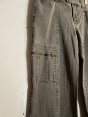 グレーカラーで、コーデュロイのような生地感のフレアカーゴデニムパンツ。Y2Kな雰囲気が感じられるディテールになってます。ポケットの位置や形などからセンスが感じられます。ストレッチが効いていて、履き心地も抜群です。ウエストボタンがスナップなのもポイント。裾にかけての綺麗なフレアシルエットで、雰囲気ありのデニムパンツです。