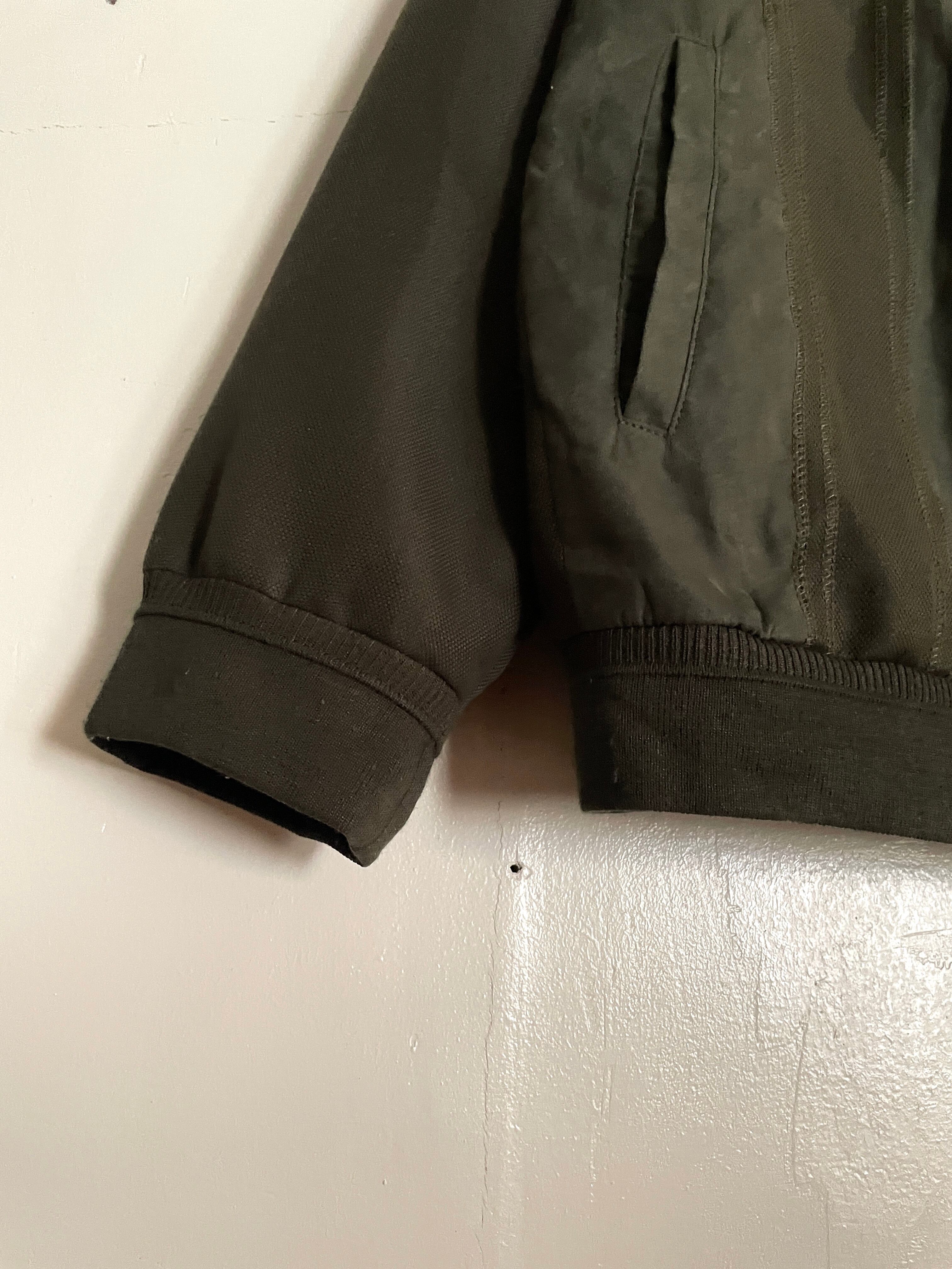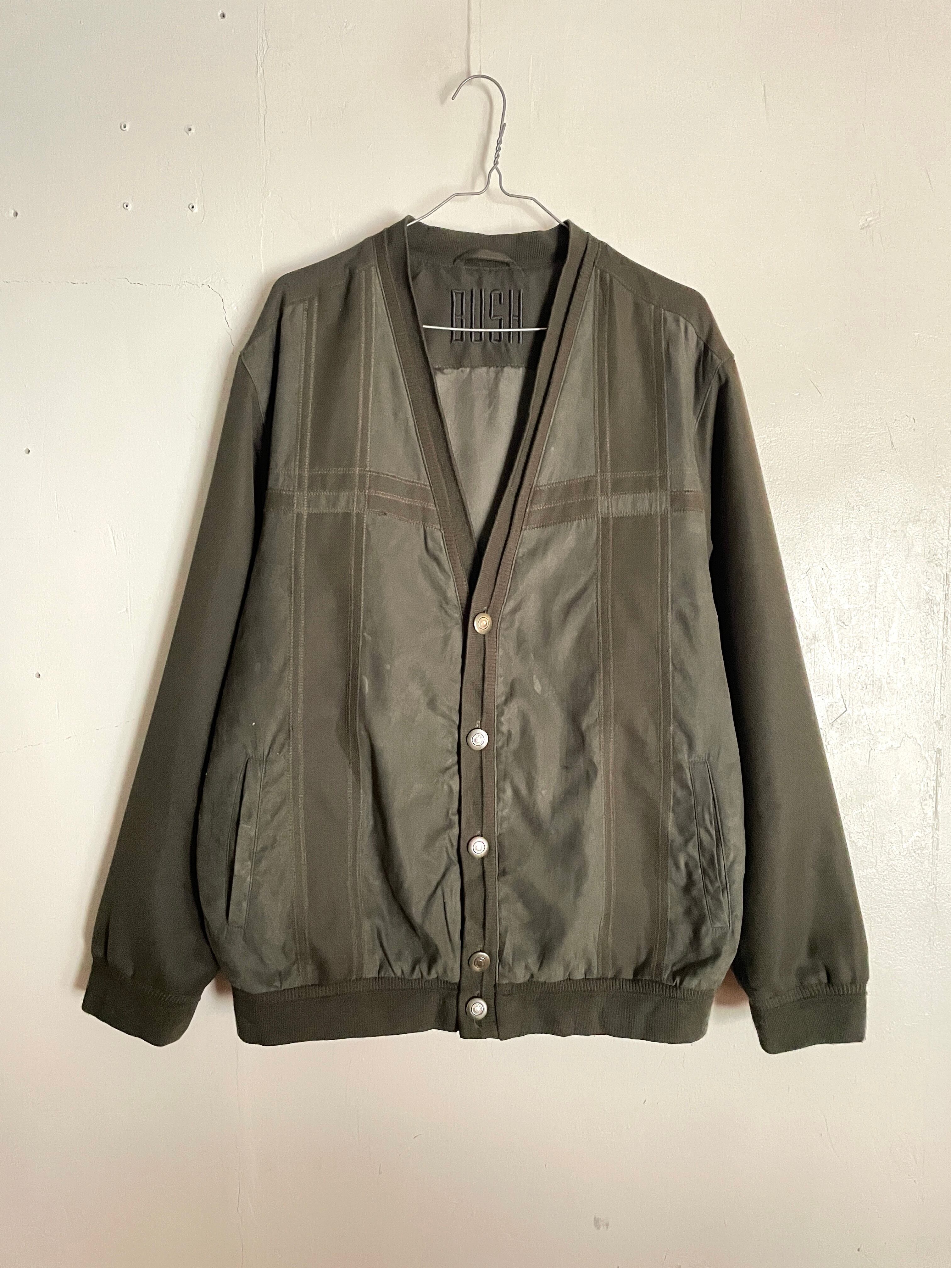 濃いめのカーキグリーンで、部分的にフェイクスエードで切り替えられたカーディガンジャケット。程良い前Vの深さで、両脇にはポケット付き、裏地も付いています。非常に軽い着心地で、カーディガンとアウターの要素をうまく組み合わせた一着。渋めな印象がかっこいいです。