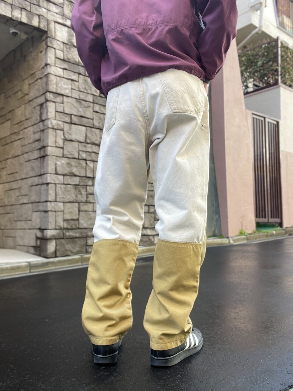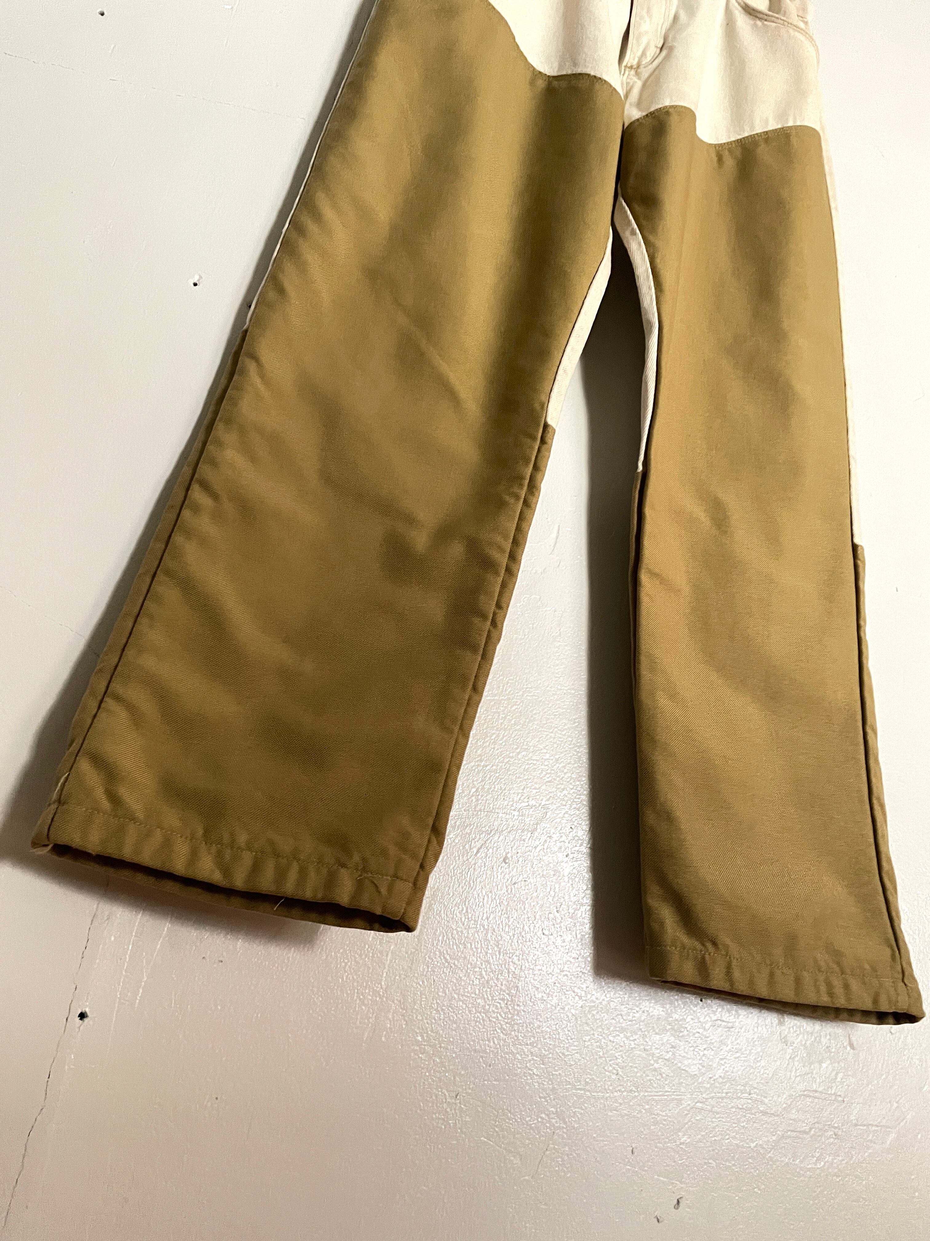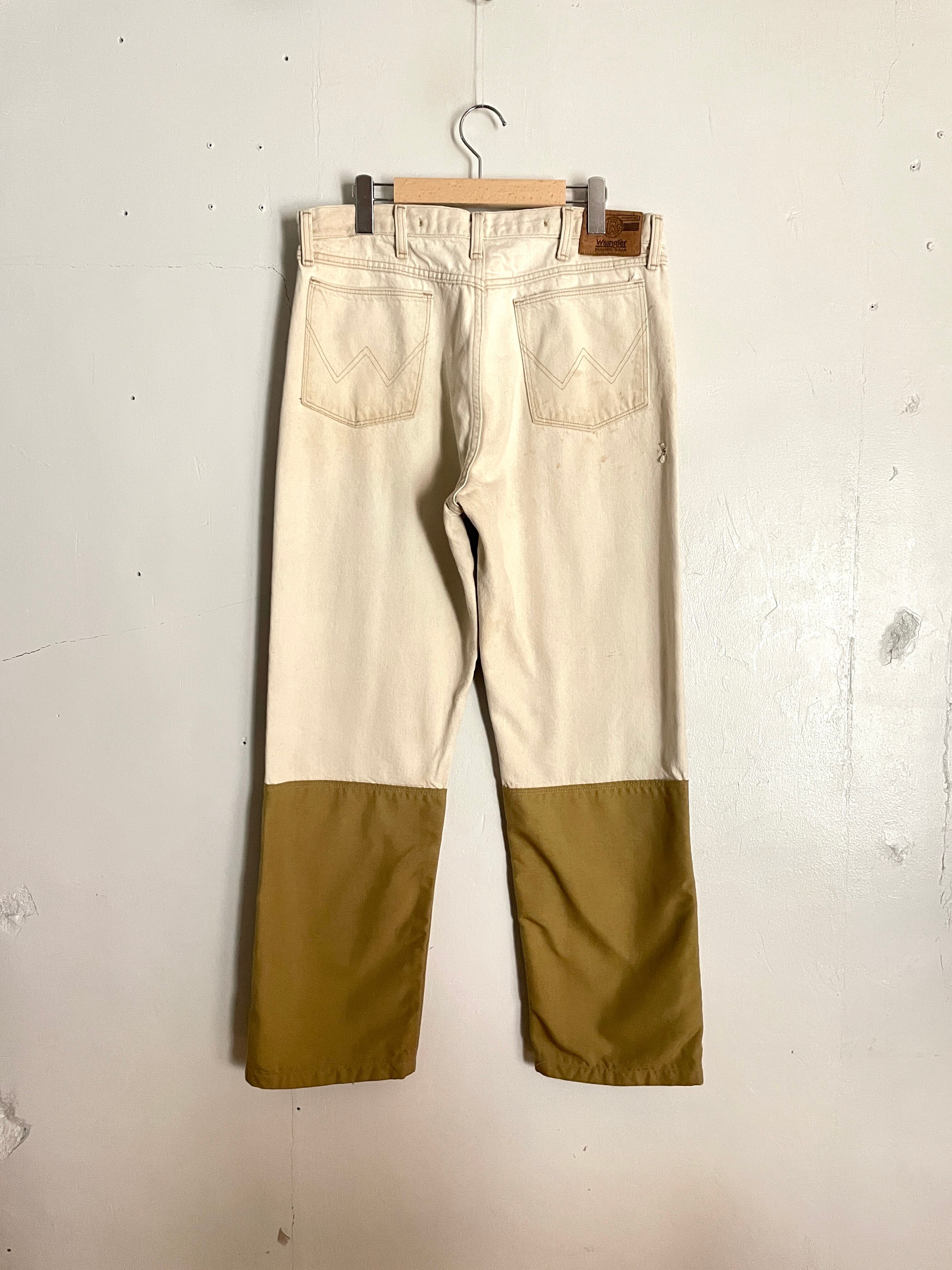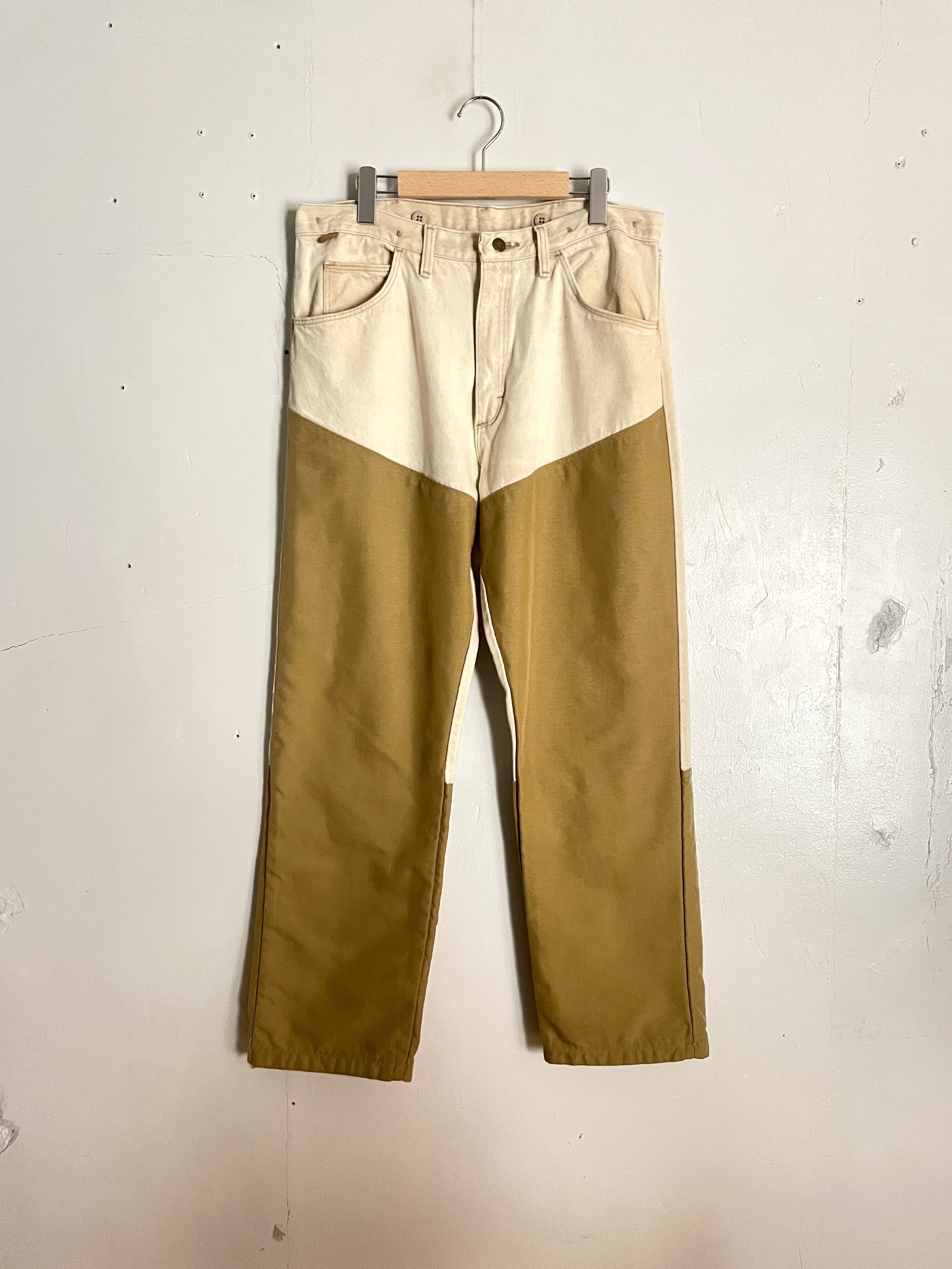 アイボリーカラーのコットン素材に、ナイロンのような素材で当て布がされたデザインパンツ。ボディブランドはラングラーです。ダブルニーのように補強する意味で付けられていると思いますが、それがうまくデザインに昇華されています。前と後ろで当て布の位置が違うのもポイント。ガシガシ履ける、タフでお洒落な一本です。