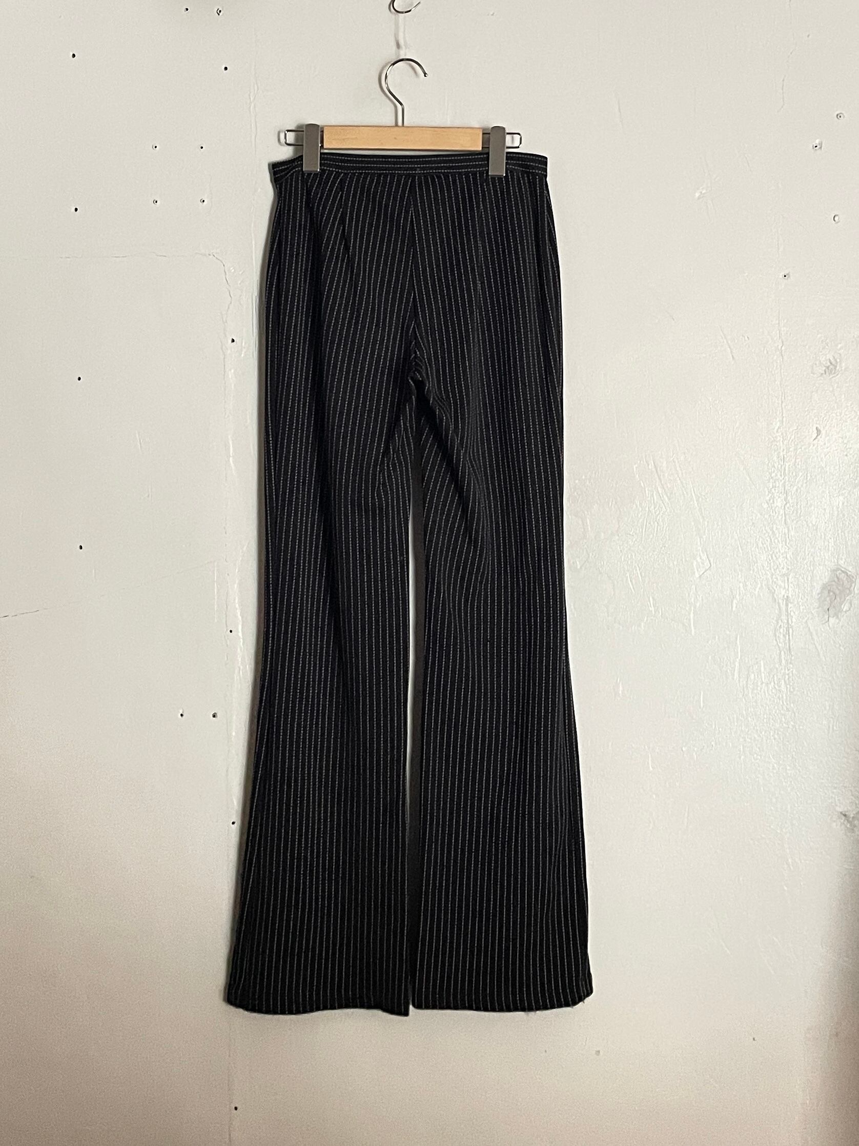 サラッとしたナイロン×ポリ素材のフレアパンツ。ブラックカラーで、縦に白のストライプデザインが施された一本。ストレッチが効いていて履きやすさ抜群。股上は浅めで、裾にかけてのフレアシルエットが絶妙に綺麗です。楽に履けて、体のラインを綺麗に出してくれるアイテムです。