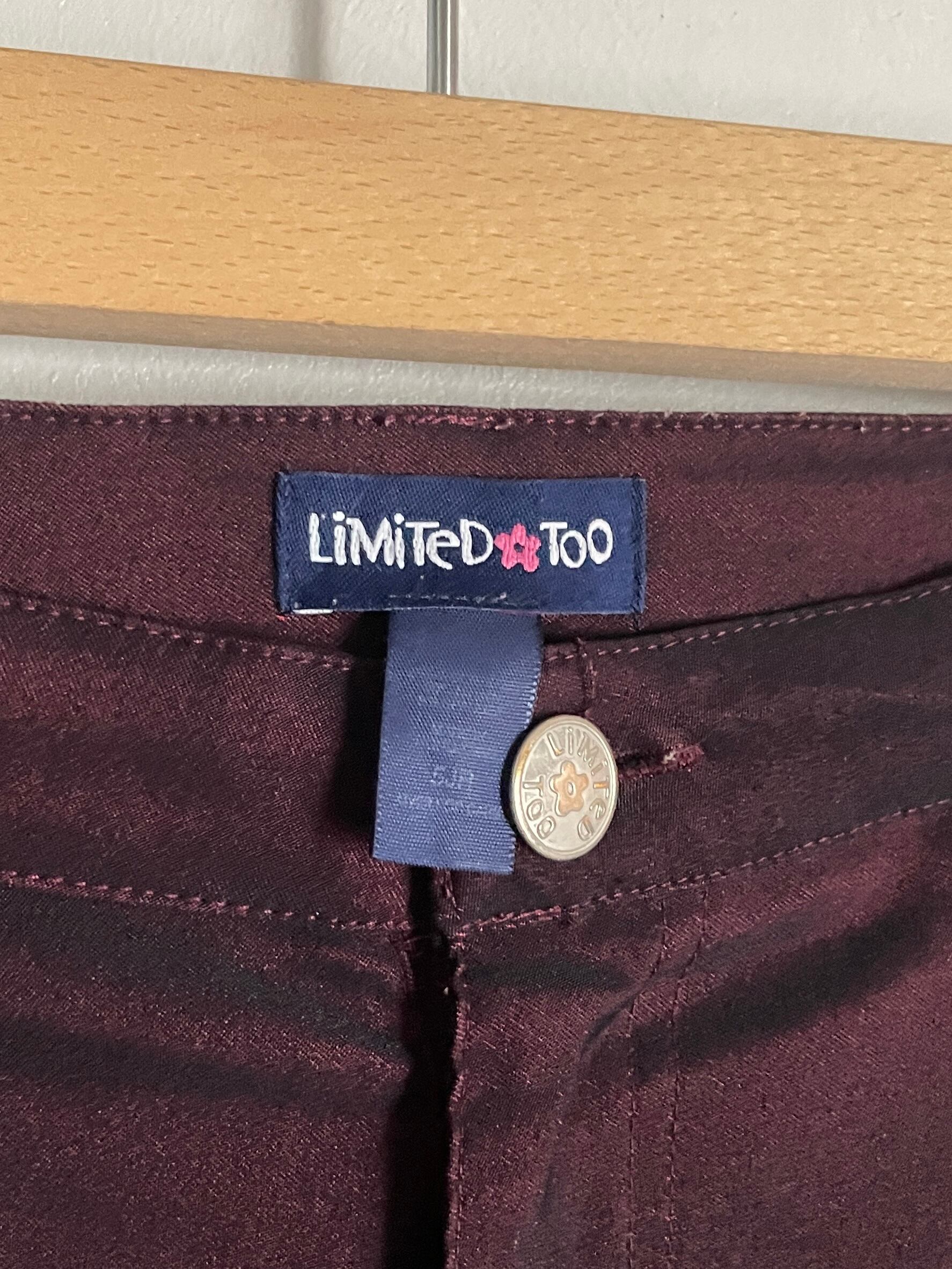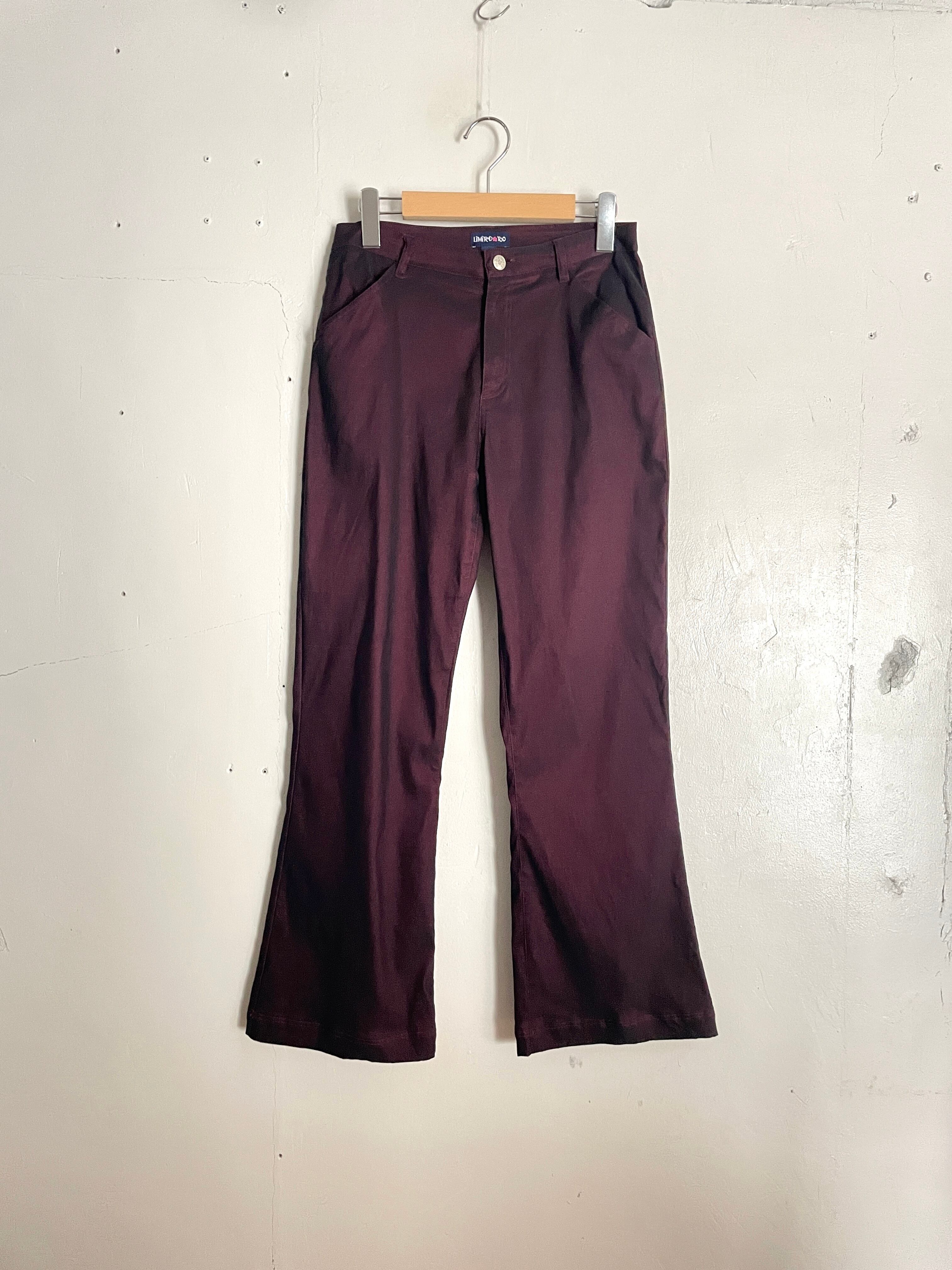 深みのあるパープルカラーで、裾が広がった綺麗なシルエットのフレアパンツ。光の当たり具合によって若干見え方が変わる、玉虫素材が独特な雰囲気です。やや股上は浅め、ストレッチが効いているため履き心地がいいです。右後ろポケットのビーズの星マークも可愛らしいお洒落な一本。