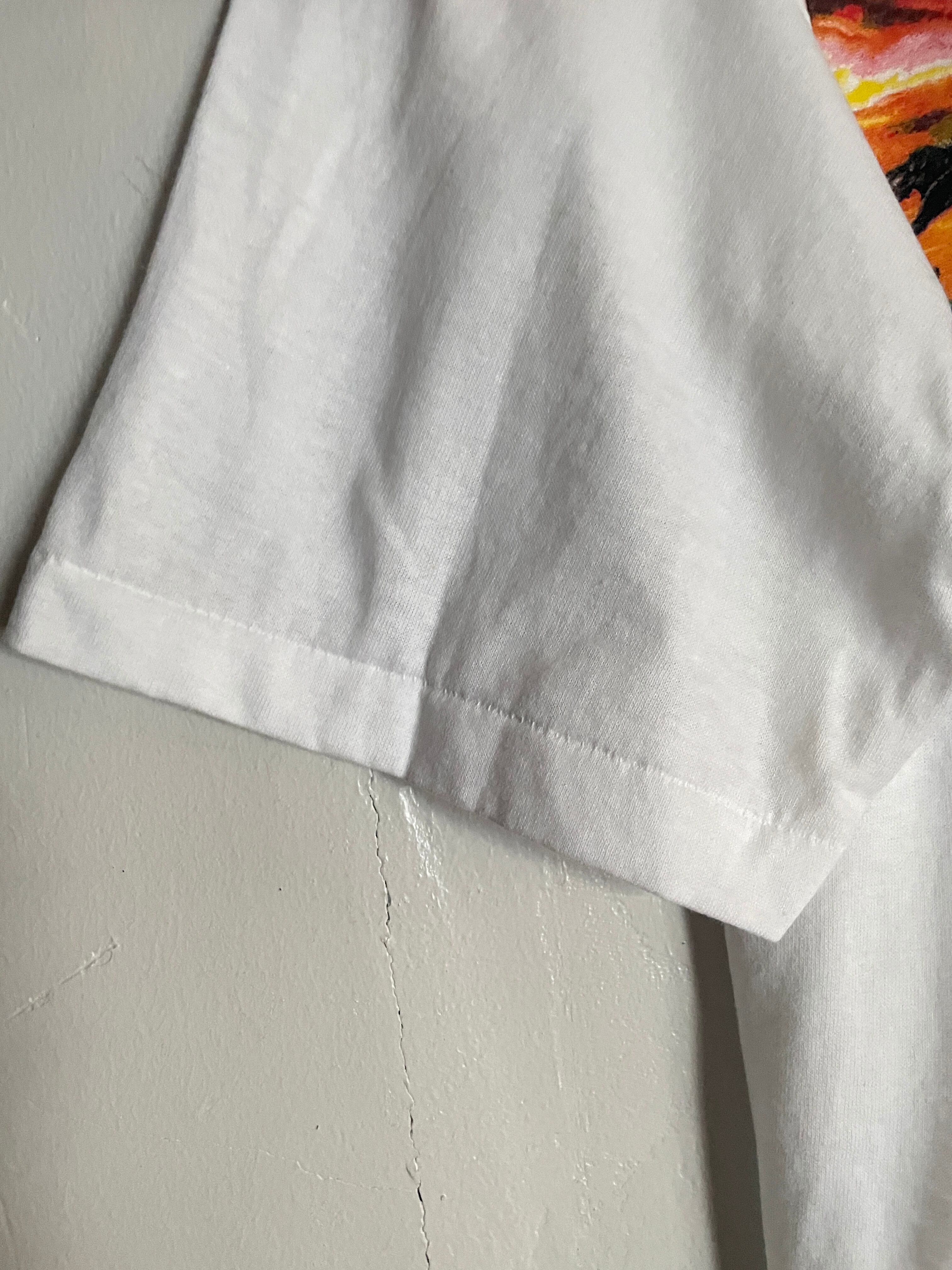 ホワイトボディに、それぞれ違った恐竜の切手がプリントされたTシャツ。ティラノサウルスだったり、ステゴサウルスだったりと、それぞれにしっかりとネームプリントが施されています。何かの記念プリントでしょうか。89年のコピーライト入りでUSA製。ゆったりとしたサイズ感で、これからの季節一枚で決まるTシャツです。
