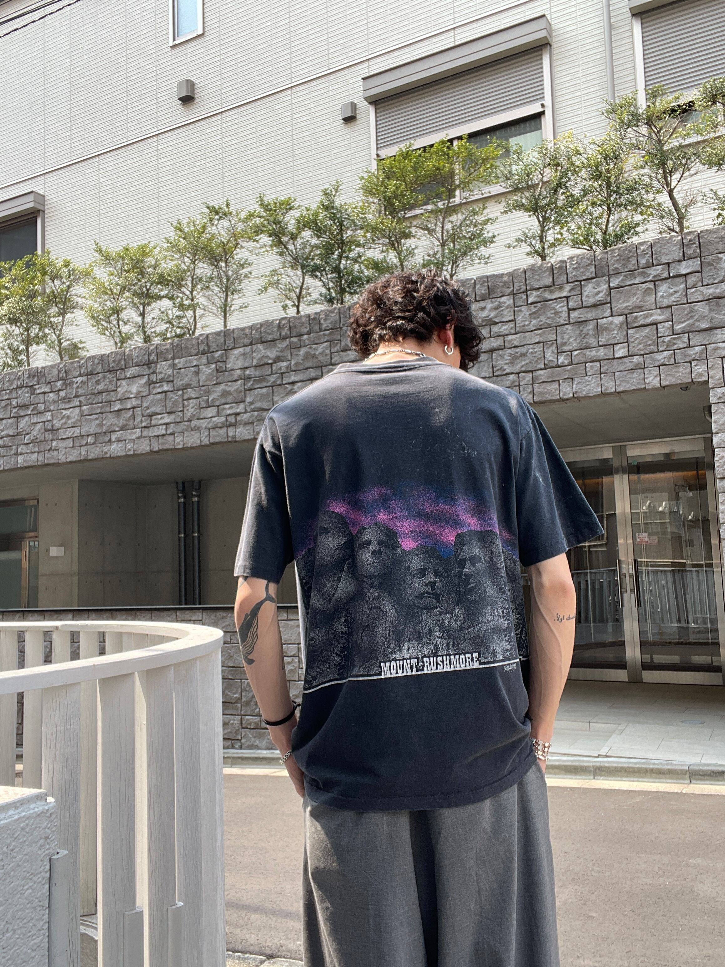 褪せたブラックボディに、アメリカサウスダコタ州にある山”ラシュモア山”が両面プリントされたTシャツ。4大大統領が立体的に掘られている事で、世界的に有名な場所となってます。ダークな雰囲気のあるプリントがかっこいいです。所々にスレ、汚れなどが見られますが、それももはやデザインのように感じられます。ゆったりとしたサイズ感で、USA製。こういったプリントの効いたTシャツは一枚でラフに着たいです。