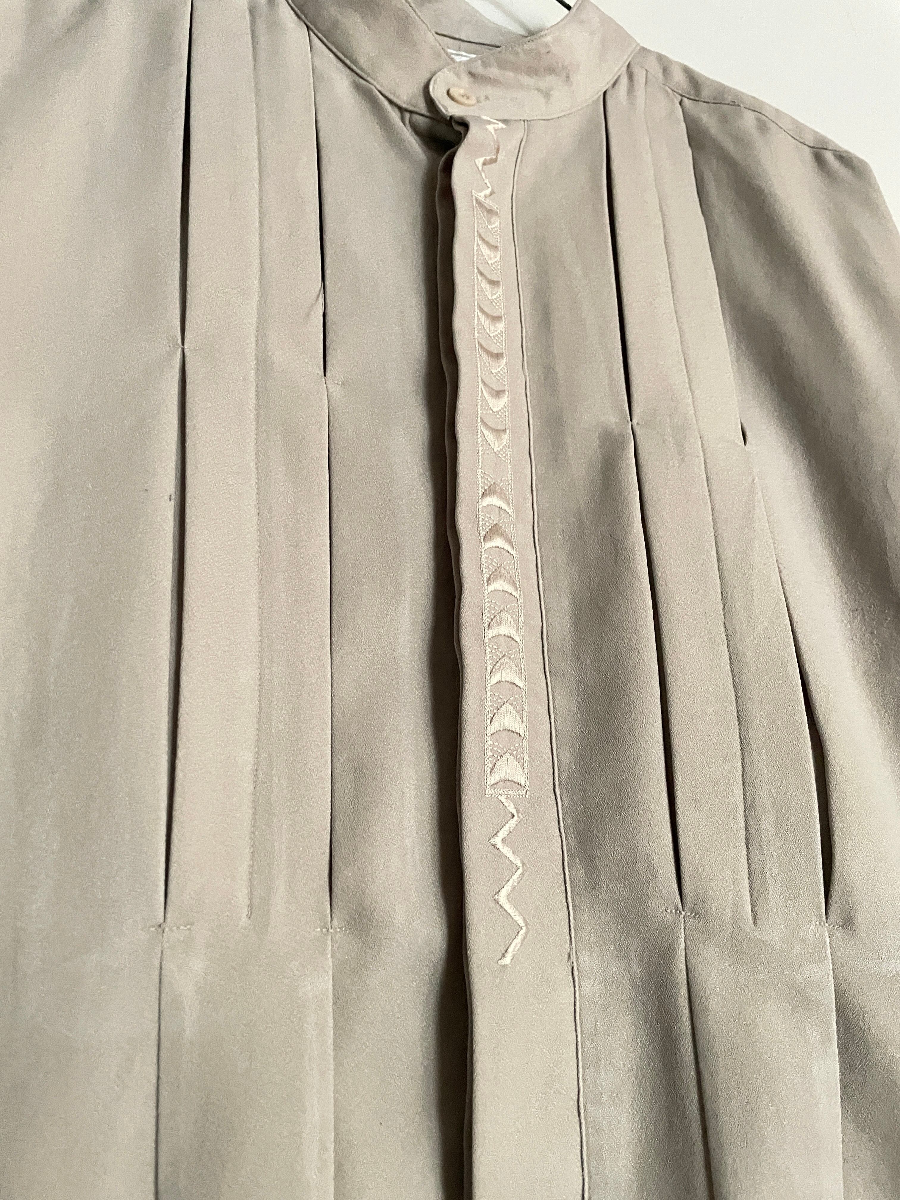 光沢感のある上品なライトベージュボディにプリーツデザインが施されたノーカラーシャツ。フロント部分にはお洒落な刺繍デザインも施されています。質の良いポリ素材で肌触りも抜群です。モードな雰囲気を感じられるシャツです。かなりゆったりと着られるサイズ感で、今の時期には一枚でラフに着られそうです。
