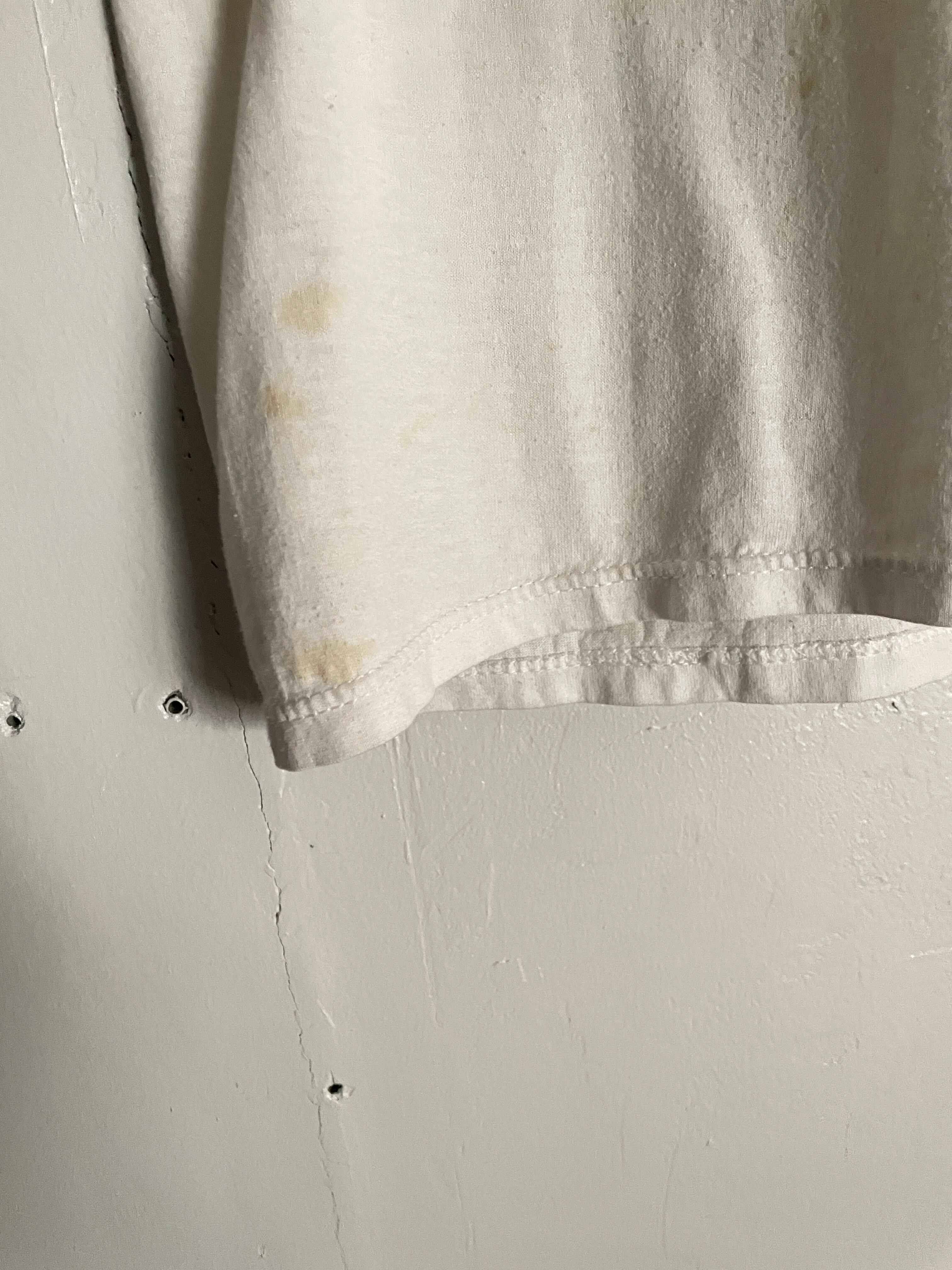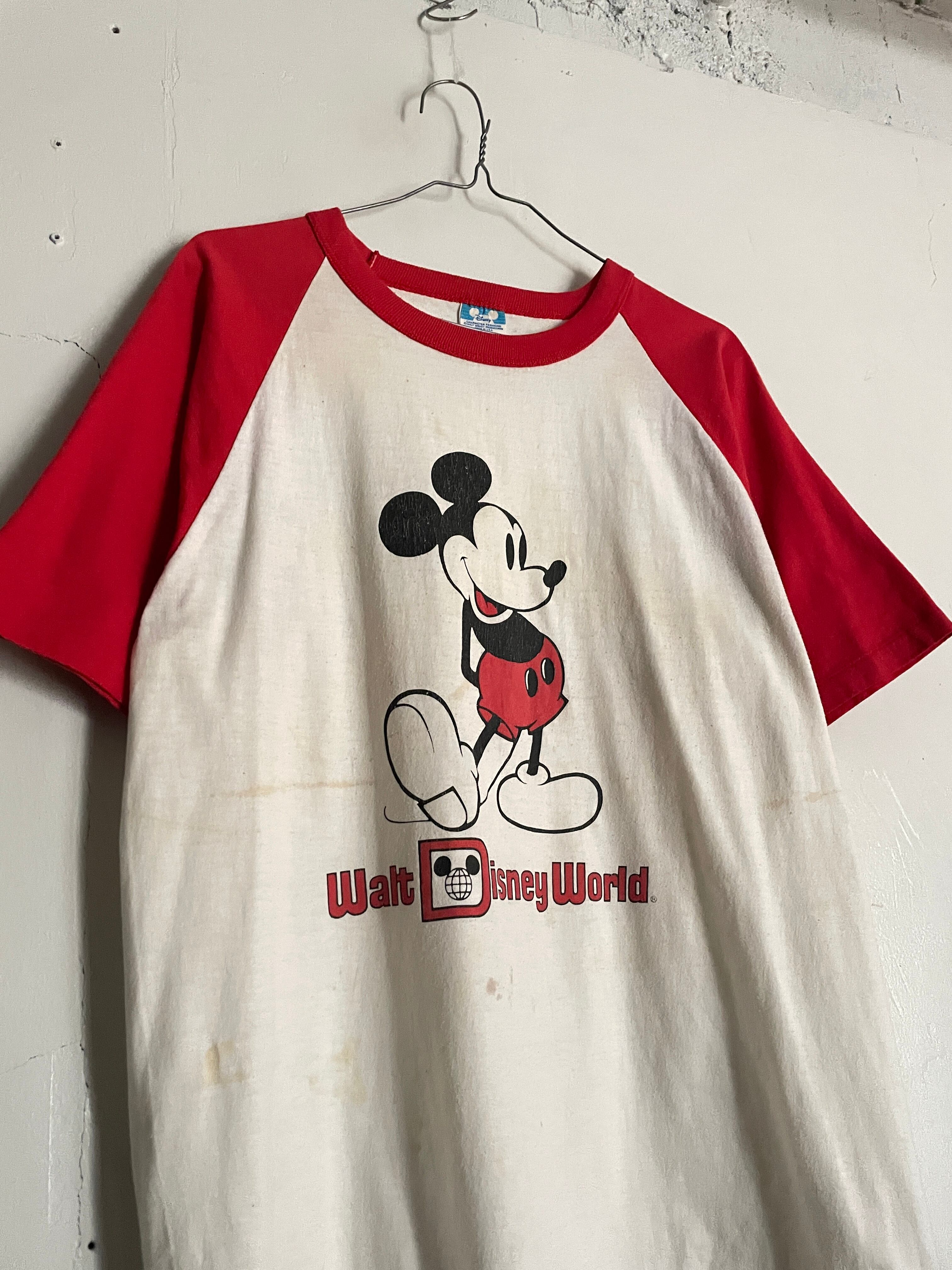 ホワイトとレッドボディに、可愛らしいミッキーがプリントされた、ラグランTシャツ。ミッキープリント下には”ウォルトディズニーワールド”のネームプリント。まさにミッキーカラーといった配色です。大き過ぎず、小さ過ぎないサイズ感で、男女共におすすめしたい一着です。しっかりとUSA製なのも魅力的です。所々に汚れなどが見られますが、もはやデザインのように思えます。