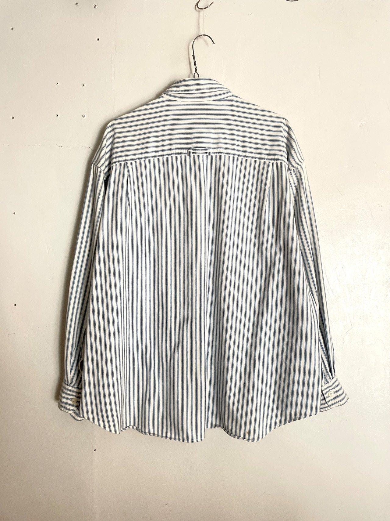 白とブルーのストライプ柄で、ポケットとヨークの切替え部分に刺繍があしらわれたエスプリの長袖シャツ。タグ部分のメッセージを見ても分かる通り、刺繍は本来は無かったものでリメイクによって付けられたデザインだと思われます。ポケット口を刺繍で留めているため、ポケットとしての役割は果たしていませんが、優しさを感じる雰囲気と明るめで爽やかな色味は、今の時期にピッタリだと思います。