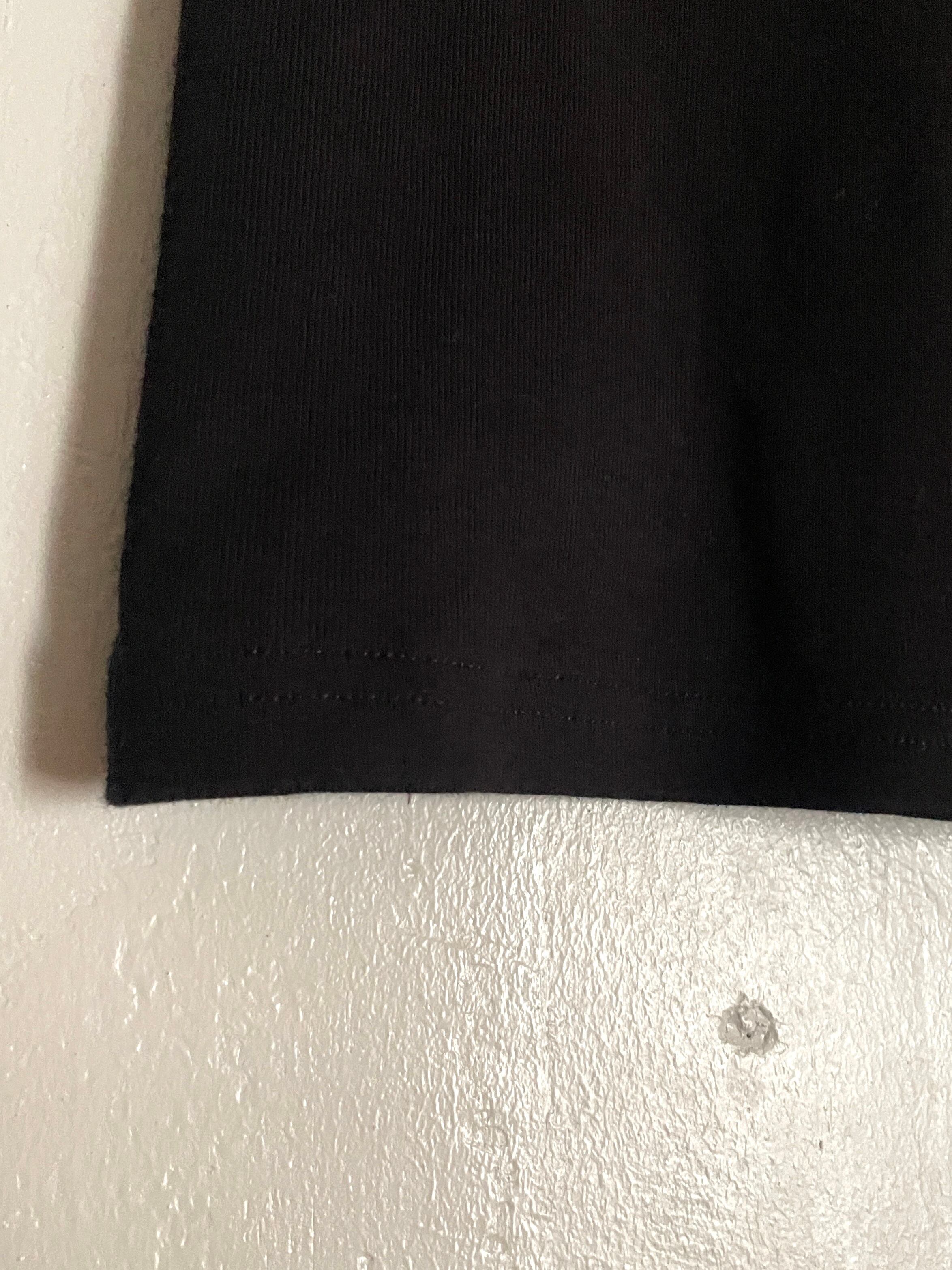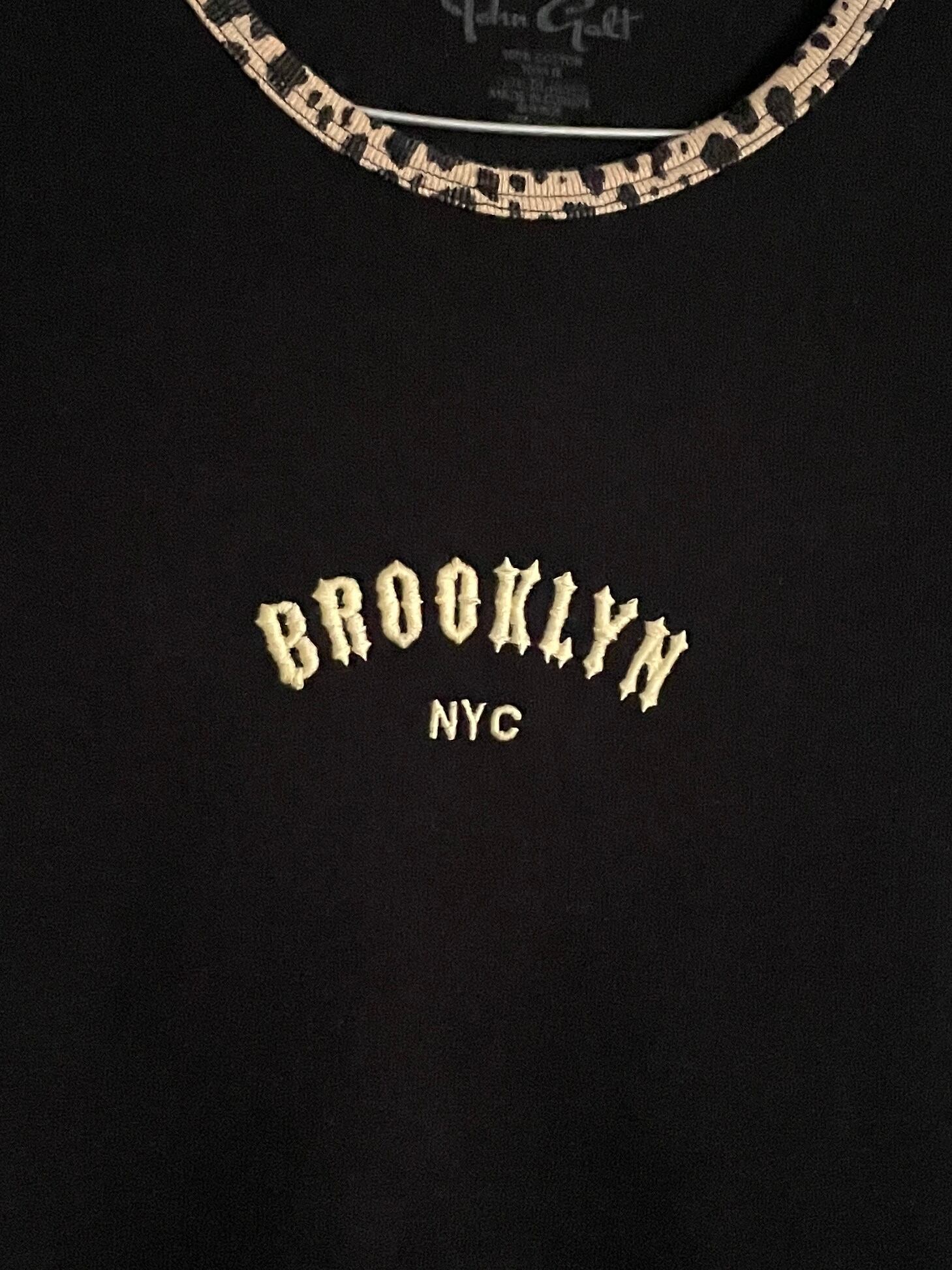黒ボディに「BROOKLYN」の刺繍、ヒョウ柄のネックリブがおしゃれなTシャツ。着丈短め、袖丈短めのピタッとサイズです。シンプルなデザインですがちょっとしたスパイスの効いた一枚。おへそがチラッと見えるくらいの丈感が、Y2Kの雰囲気でかわいいです。