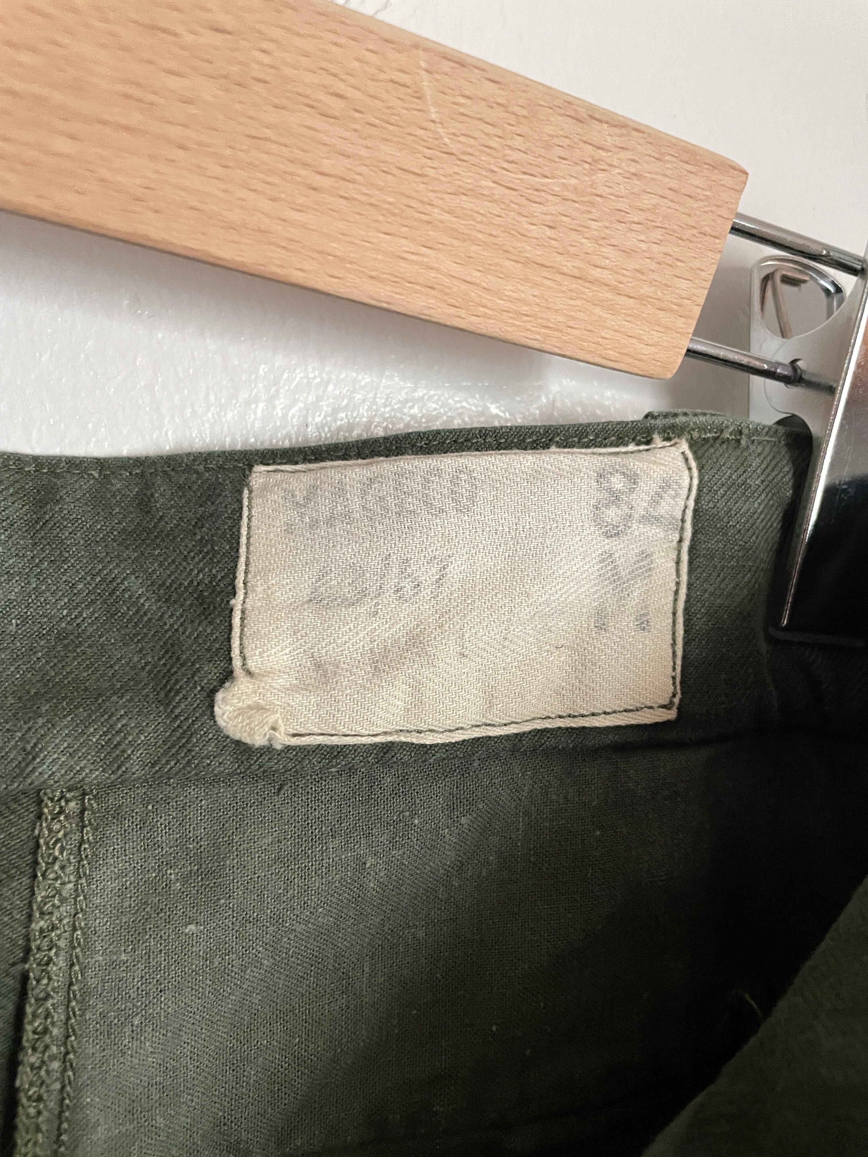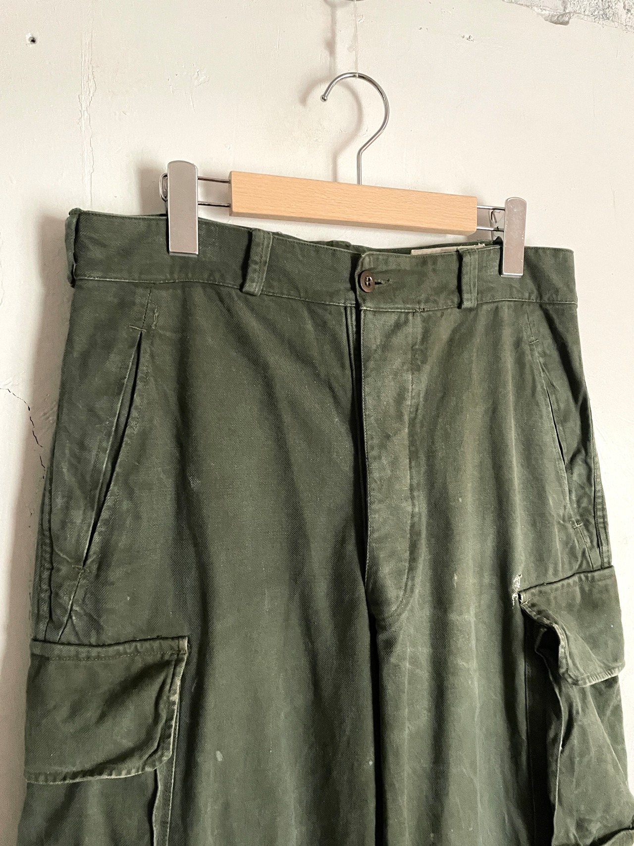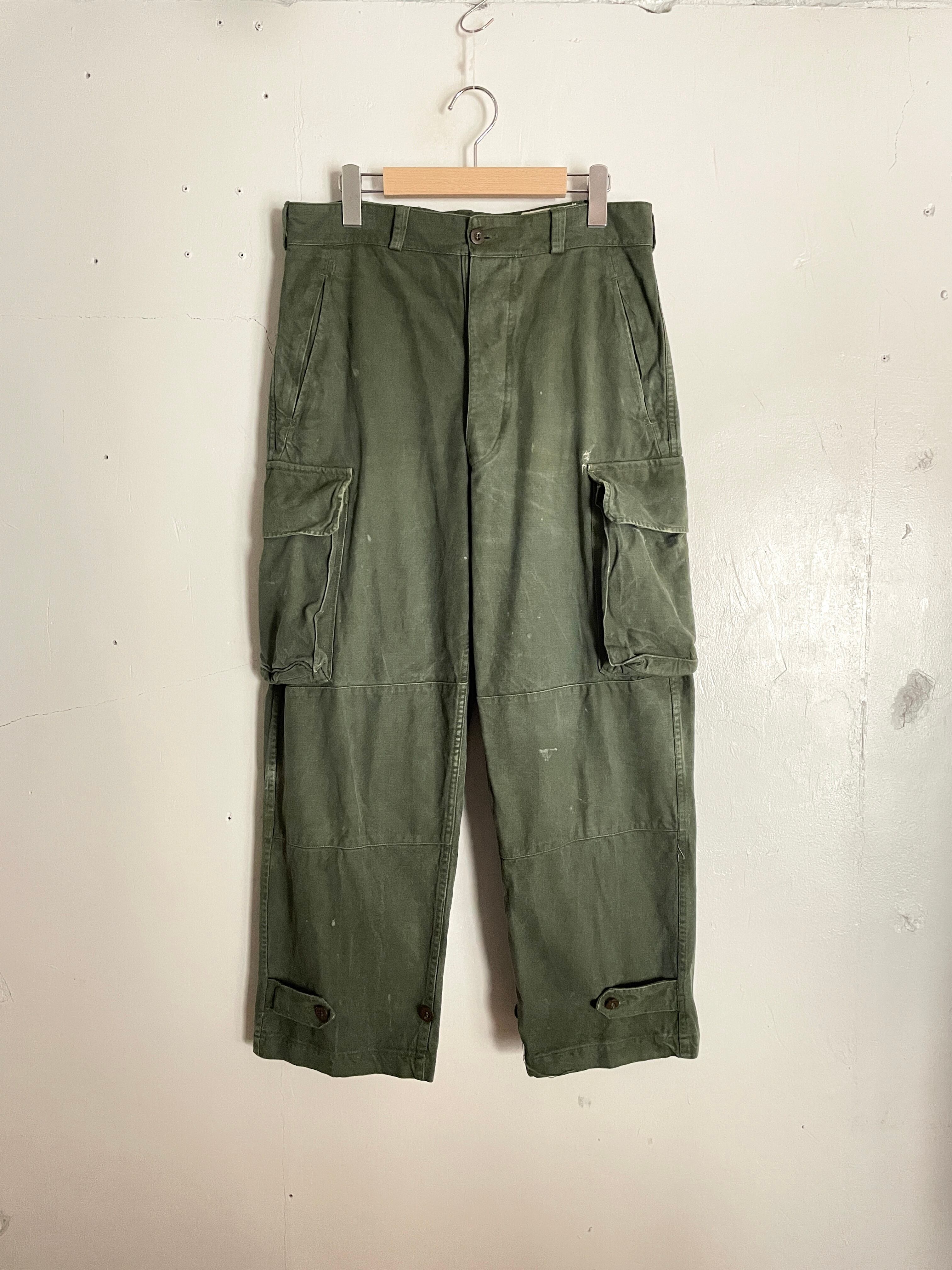 フレンチミリタリーを代表する名作、M-47カーゴパンツ。こちらは空軍仕様のモデルで、ブラウンがかった陸軍モデルに対し、カーキグリーンの色味が特徴です。また裾部分のアジャスターもこのアイテムの大きなポイント。裾に向かって真っ直ぐ落ちるシルエットが無骨ながらスタイリッシュで、やや厚手のコットンツイル素材が存在感のある一本です。タグの表記からおそらく60年代頃のものであることが考えられます。有名ブランドもサンプリングした希少なアイテムの一つ。