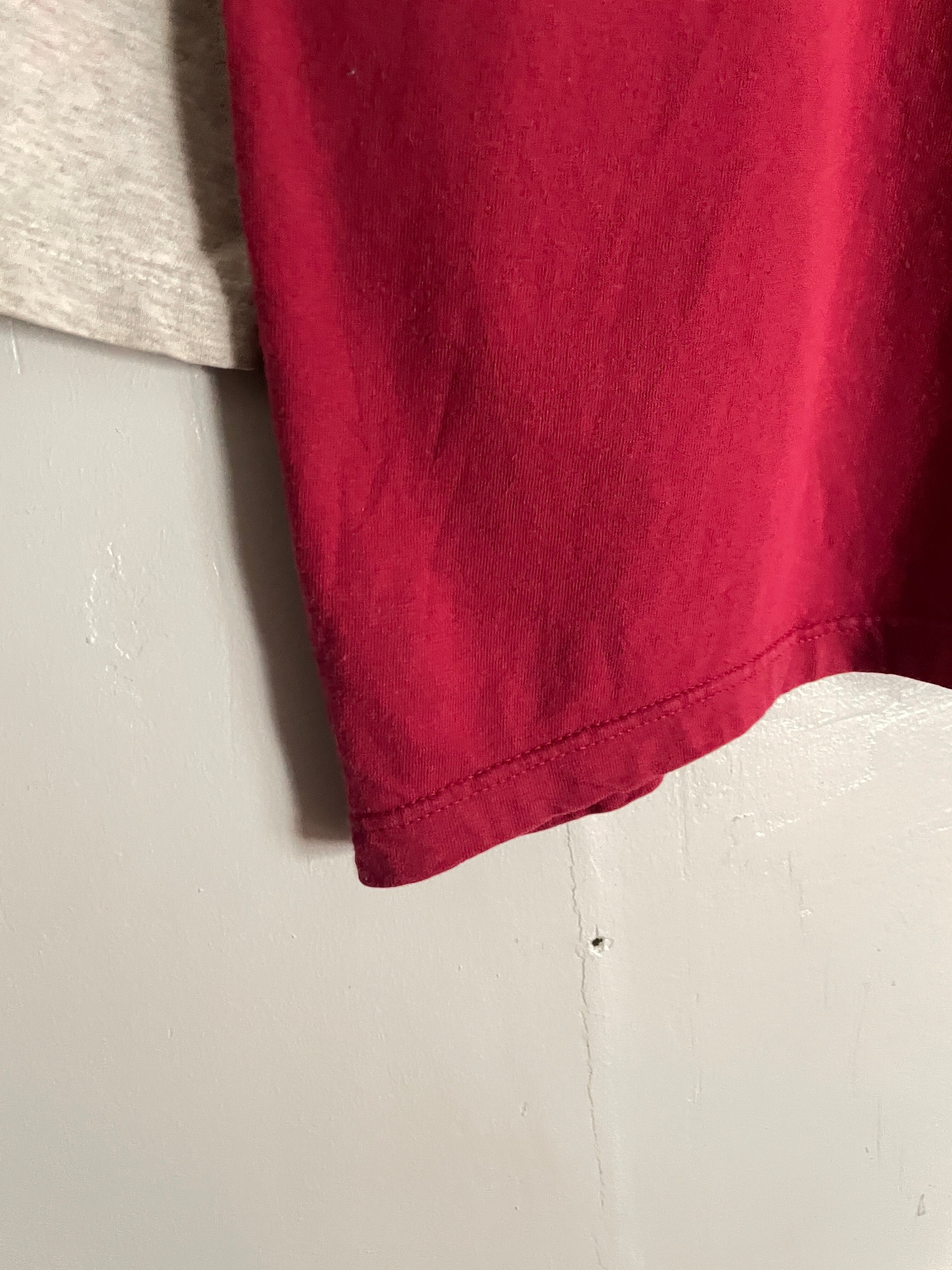 レイヤードしているようなデザインで、アームが太めな7部丈Tシャツ。ストリートな雰囲気の感じられる一着です。フロントには凹凸のある配色に良いプリントが施されています。やや褪せたレッドボディもグッドです。ゆったりとした肩が落ちるようなシルエットになっています。USA製なのもポイントが高いです。こういった変わり種のTシャツも面白いかと思います。