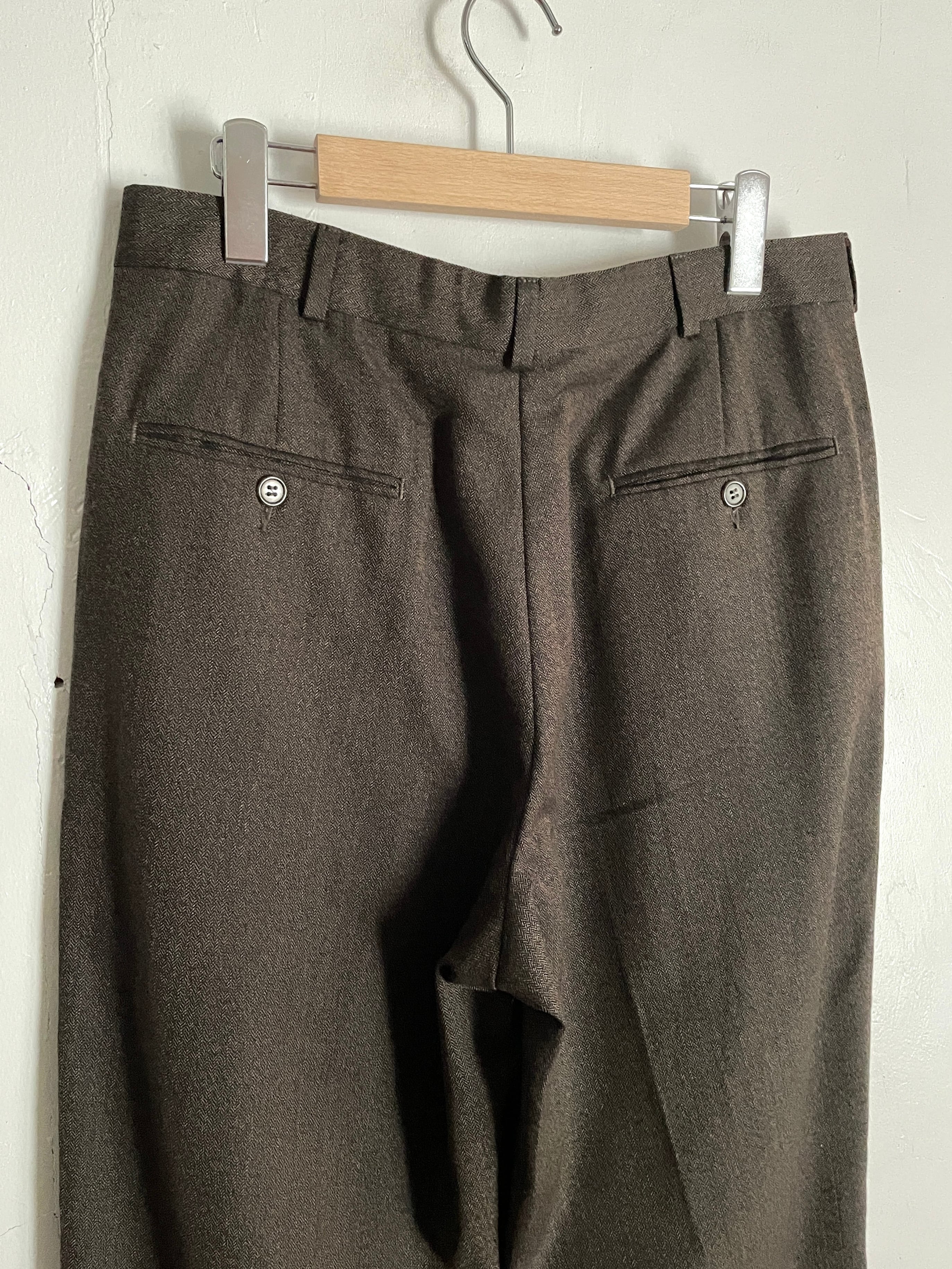 ややゆったり目の腰回りから、裾に向かって綺麗にテーパードしたタックスラックス。タグに見られる「DOCKER’S」は1986年にリーバイスの傘下ブランドとして設立されました。また「Slates」はリーバイスのスラックスだけをリリースしていたラインとして再注目を浴びています。ウエストには2タック、裾はダブル仕様、センタープリーツ入り、ポリ・ウールのしっかりめの素材が使われています。素材をよく見ると、小さめのヘリンボーン柄が使われているのもポイント。サイズバランスが非常に良く取れた、コンディションも良好な一本。