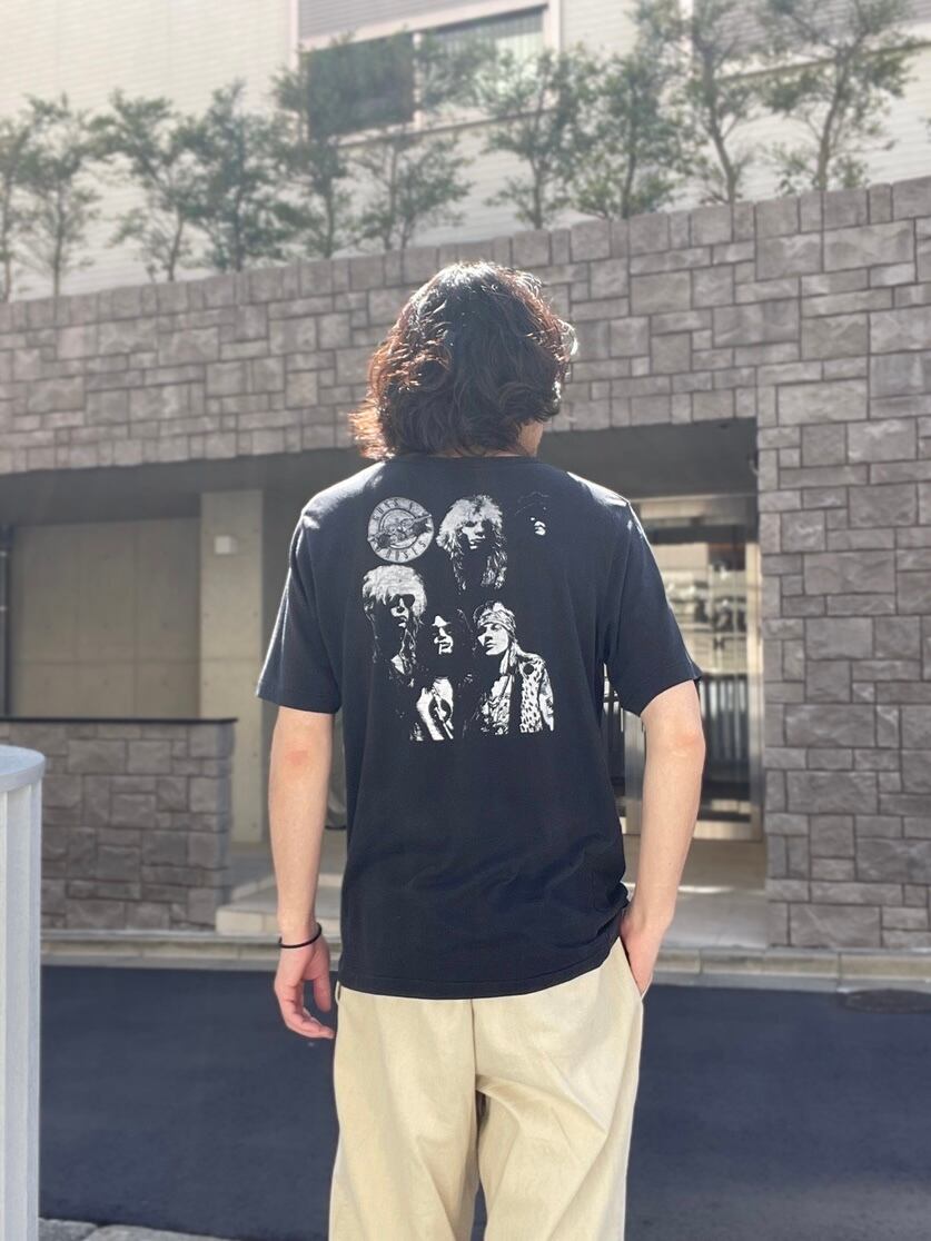 アメリカのロックバンド、ガンズ・アンド・ローゼスの両面プリントTシャツ。1985年の活動開始から、全世界でビッグセールスを連発している人気バンドです。来月には来日公演も予定されています。前のプリントは彼らのデビューアルバムのジャケット、背中はガンズのバンTでは珍しいメンバーのフォトプリントになっています。やや褪せた黒が雰囲気のある一枚。ネックにはリンガーTと同じ仕様のバインダー付き、袖口、裾はシングルステッチです。
