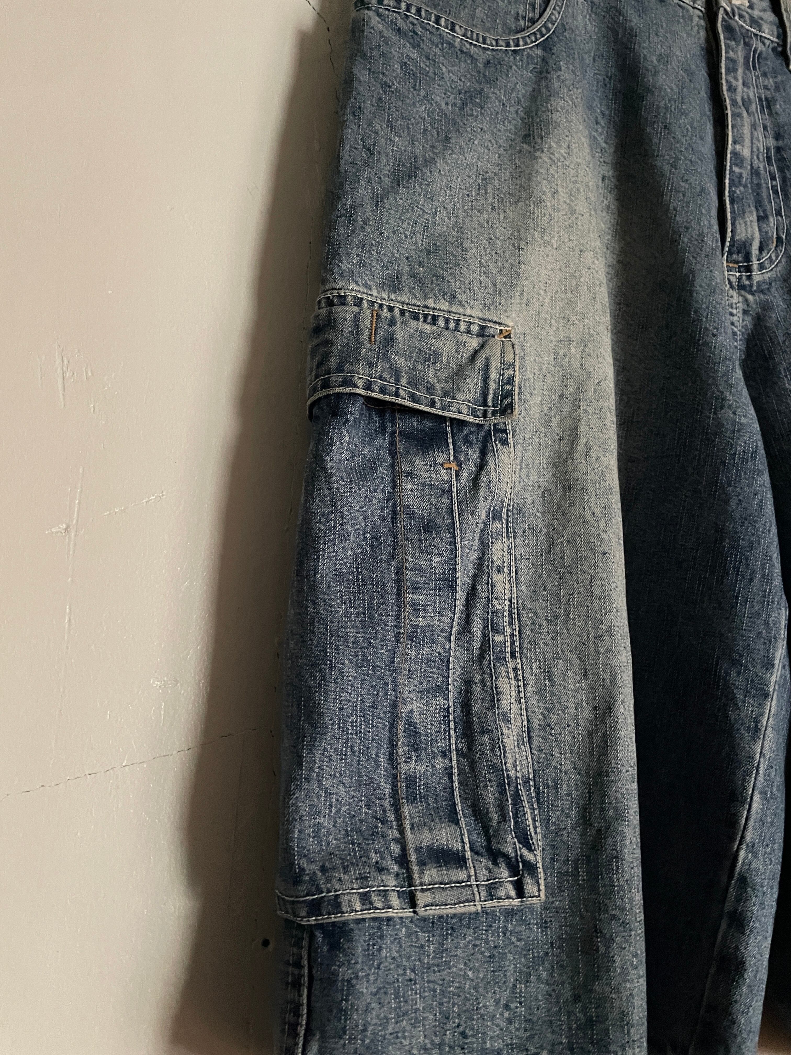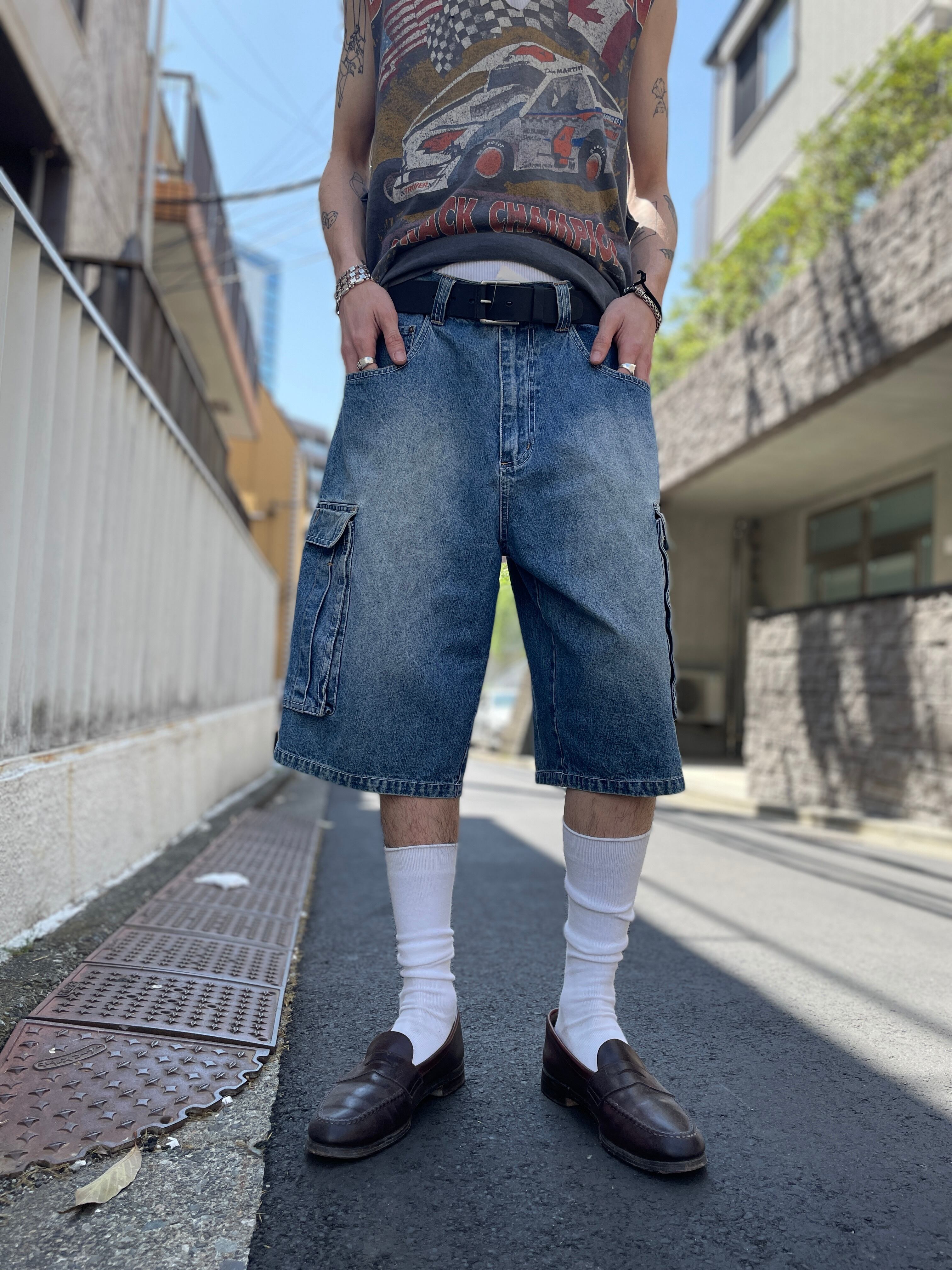 褪せた色味で、ストリートな要素が詰まった、カーゴバギーデニムショーツ。ガツンとした太さのあるワイドシルエット。ポケットが豊富なのも魅力的です。これからに時期一本は持っておきたいアイテムかと思います。こういったバギーデニムショーツを探すのはなかなか大変ですよね。シルエット、機能性が抜群なデニムショーツです。