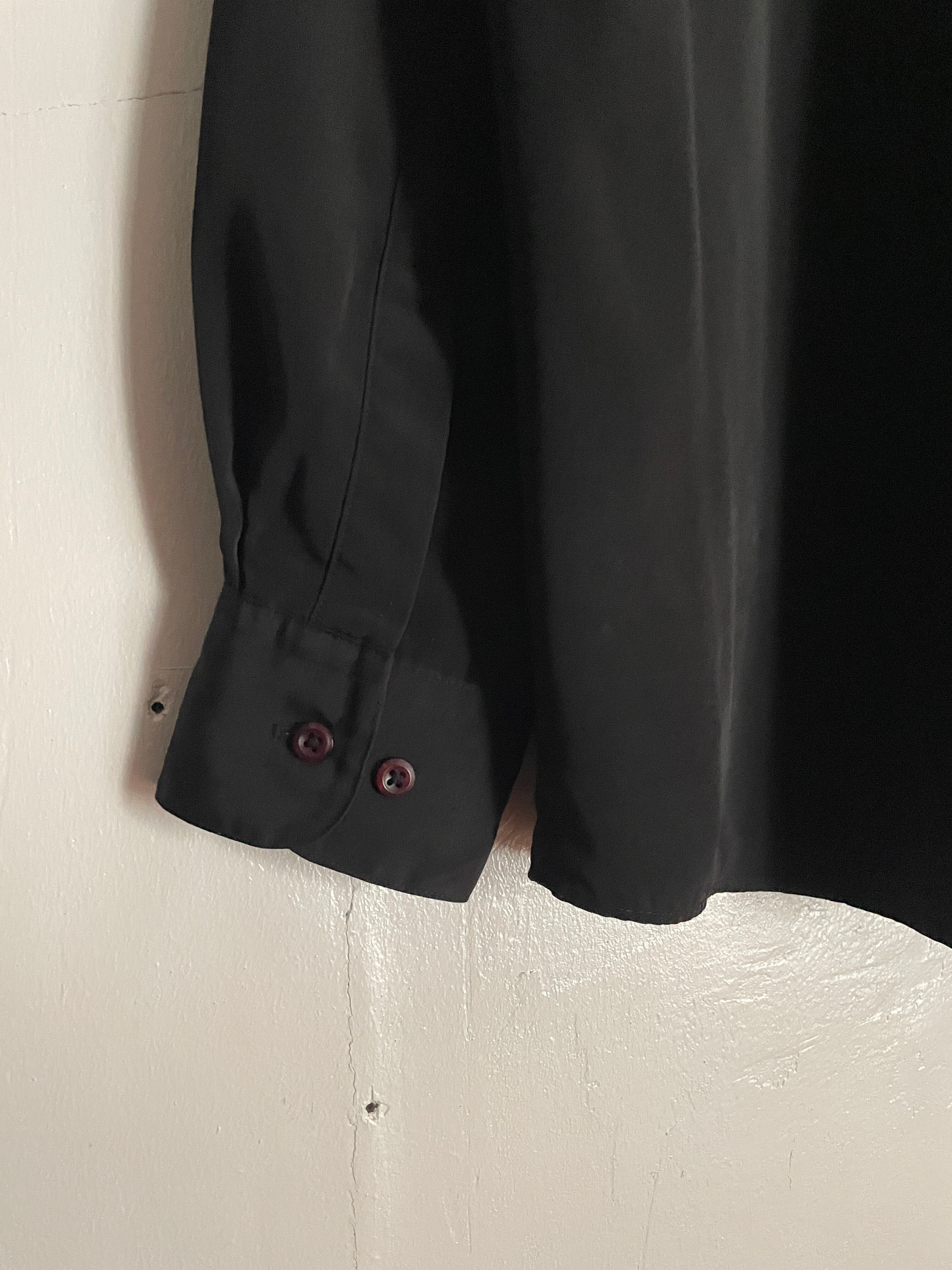 光沢のあるブラックボディで、サラッとしたポリ素材のノーカラーシャツ。無地ブラックで使いやすいシャツかと思います。シンプルながらシャツとしてのクオリティが非常に高い一着になっています。ゆったりとしたサイズ感で、今の時期には重宝するアイテムかと思います。
