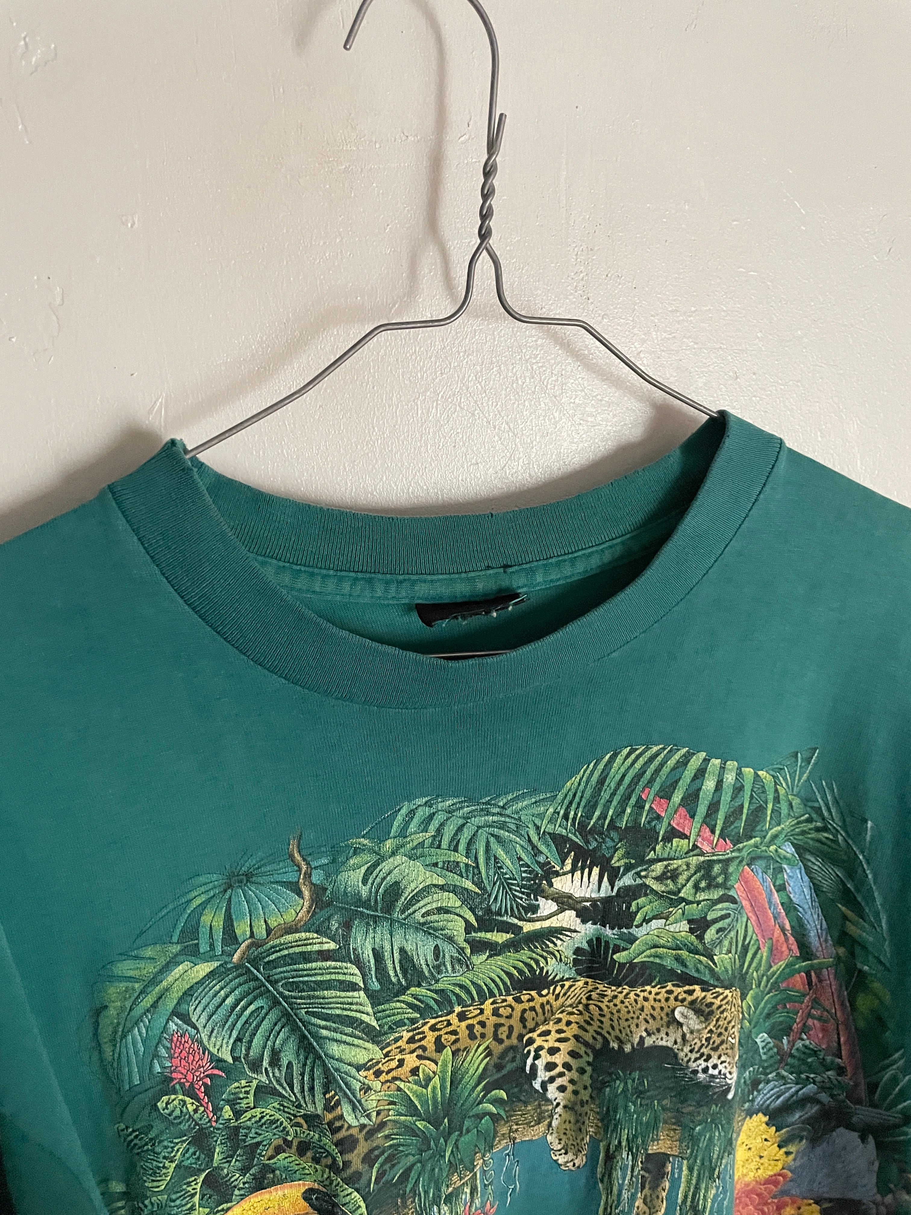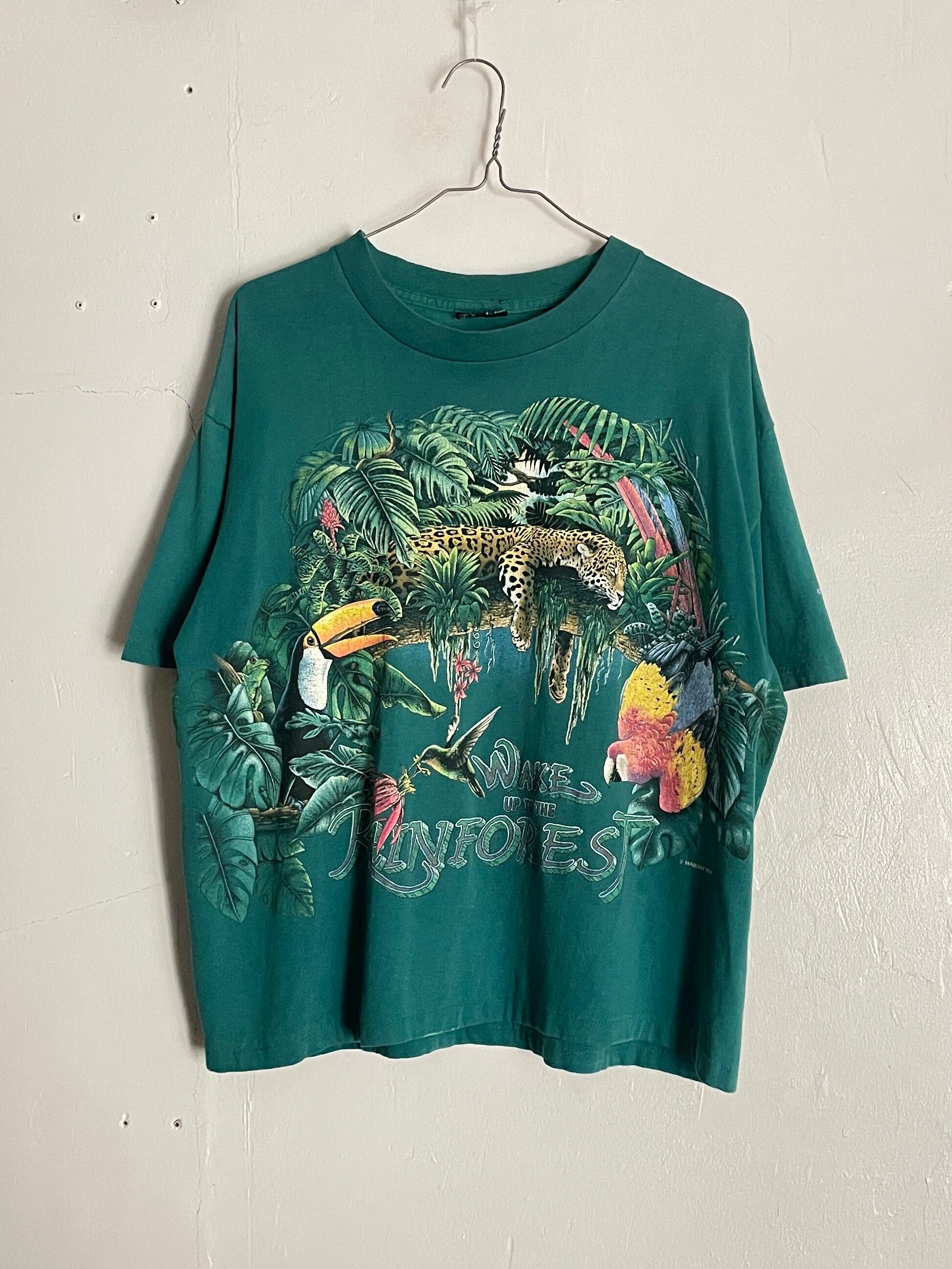 淡いグリーンボディに、アート感のあるアニマルプリントが両面に施された、Tシャツ。チーターやペリカンなど、様々な動物がリアルにプリントされています。シングルステッチで、しっかりと古いボディなのも魅力的です。古着ならではのクタっとした素材感。短丈めで身幅たっぷりの今っぽいシルエットになっています。デザイン性に長けたお洒落なTシャツです。