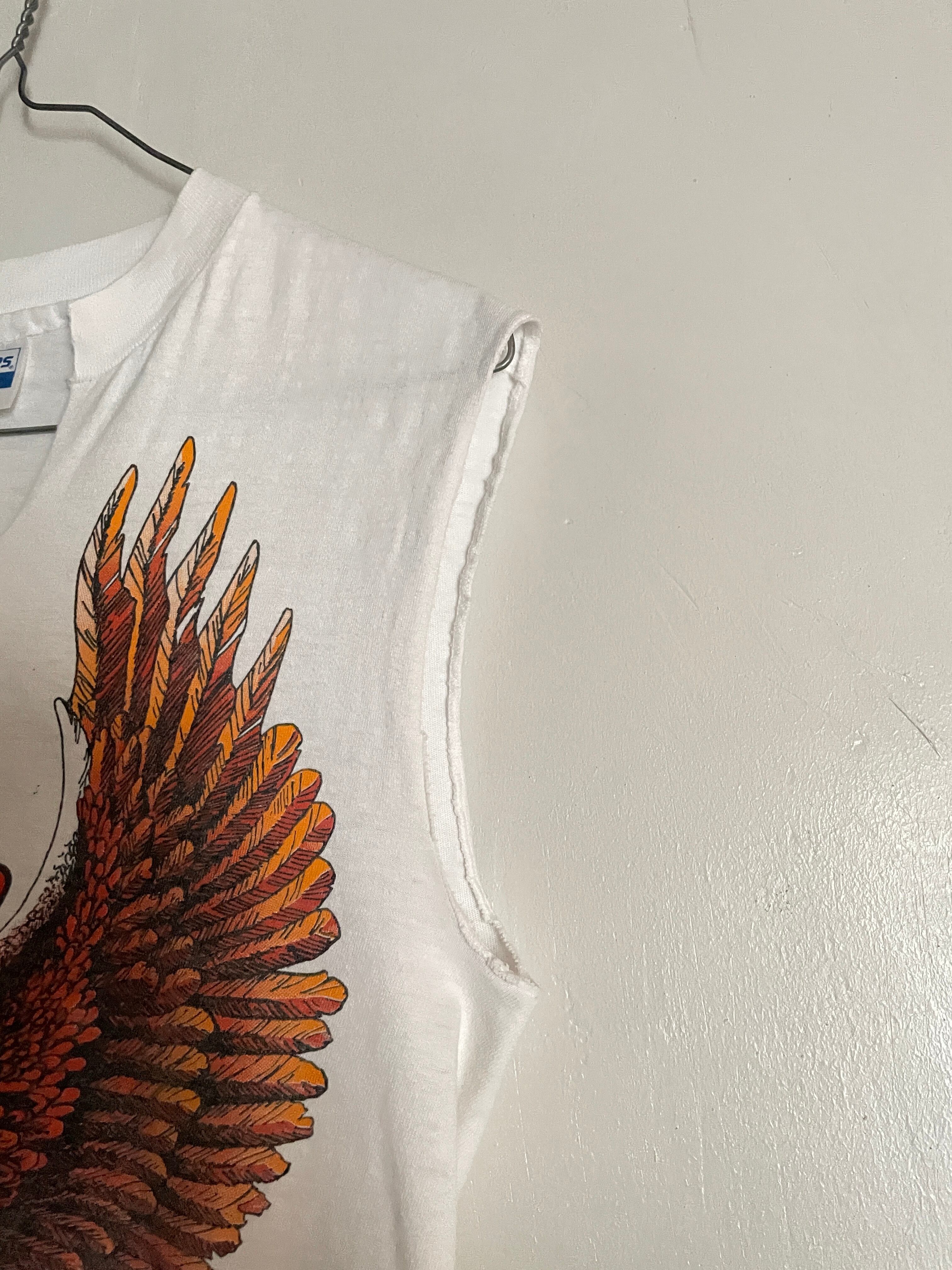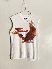 ホワイトボディに、両面プリントが施された、ハーレーダビッドソンのカットオフTシャツ。前はインパクト大のイーグルプリント。バックにはマップがプリントされています。両面共に雰囲気のあるプリントデザインになっています。ネック部分には深めの切り込みが入っていて、インナーなどチラ見せして着ても良さそうです。ボディはヘインズでUSA製。シングルステッチで、しっかりと古いボディが使われているのも嬉しいです。女性の方はもちろん、男性の方でもジャストめで着るとかっこ良く着られそうです。
