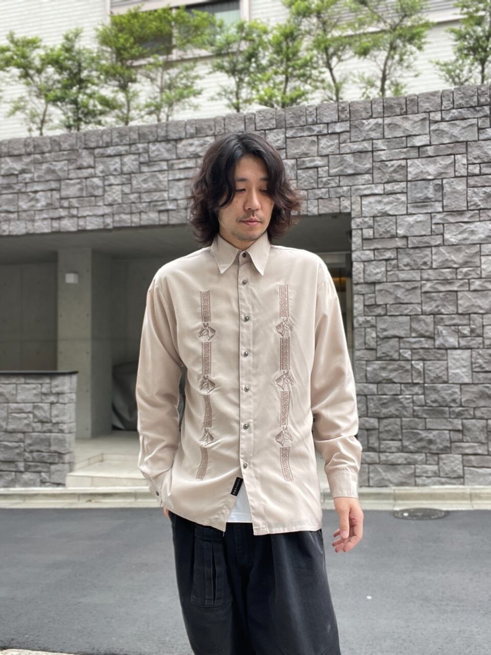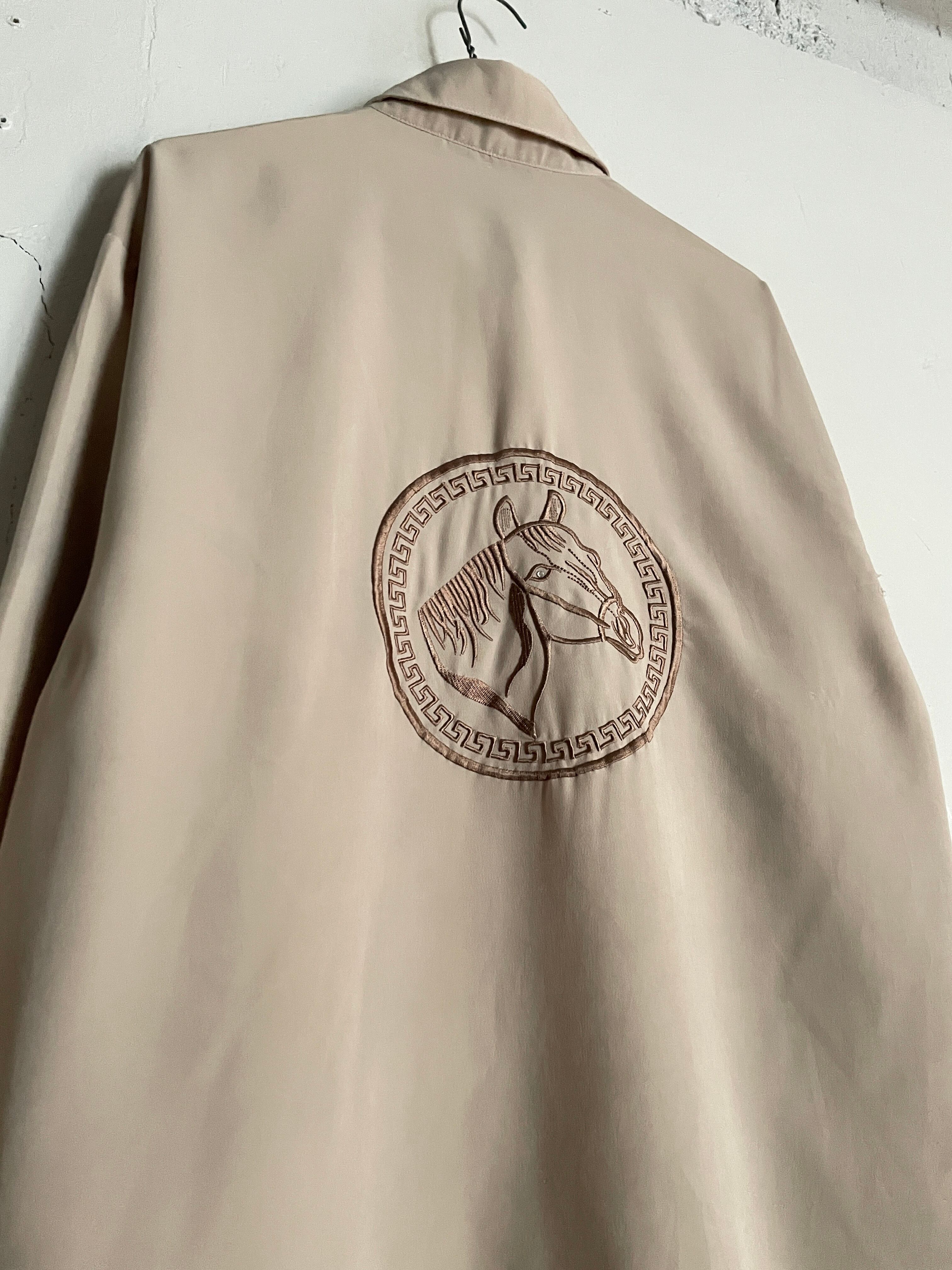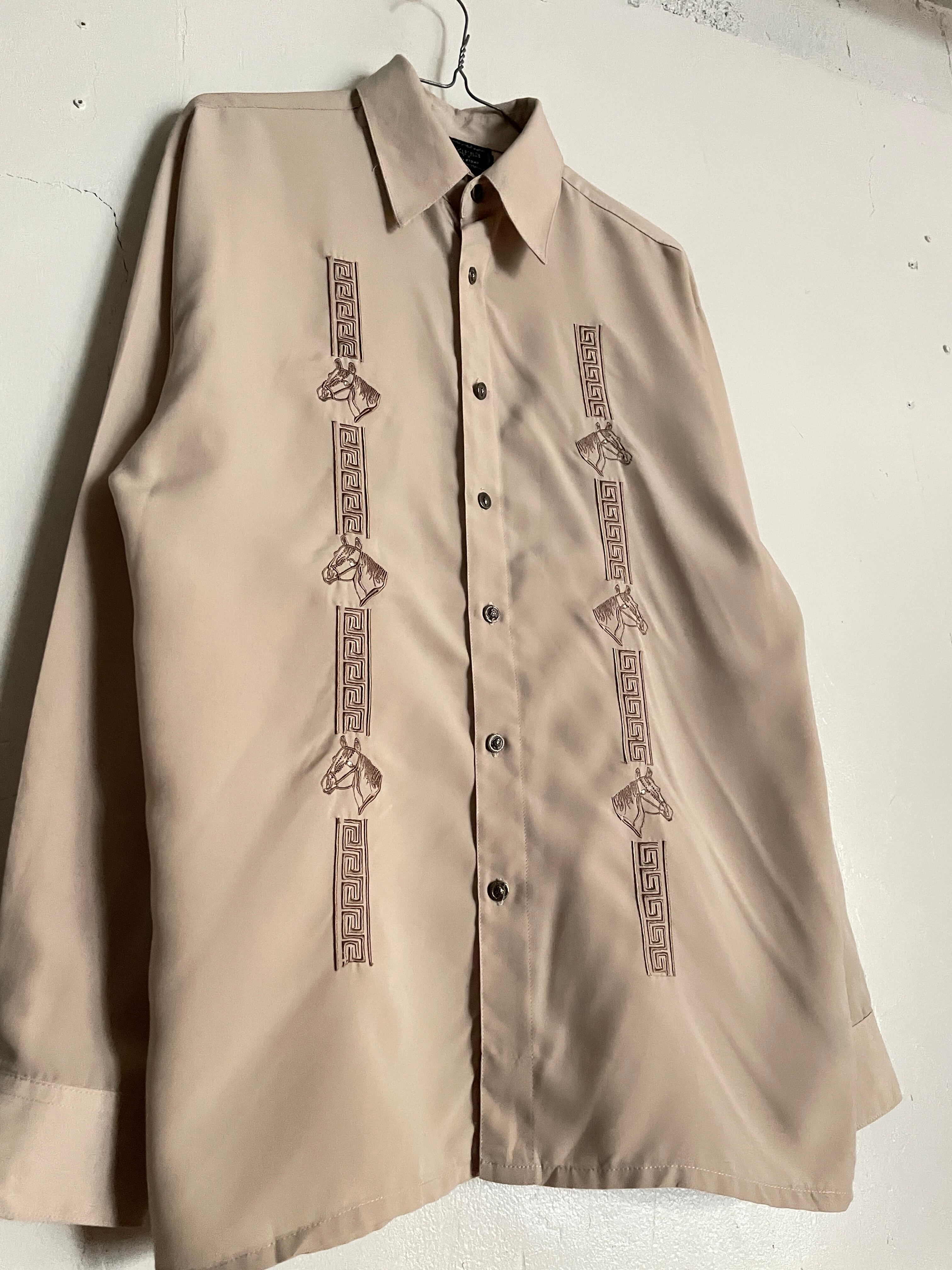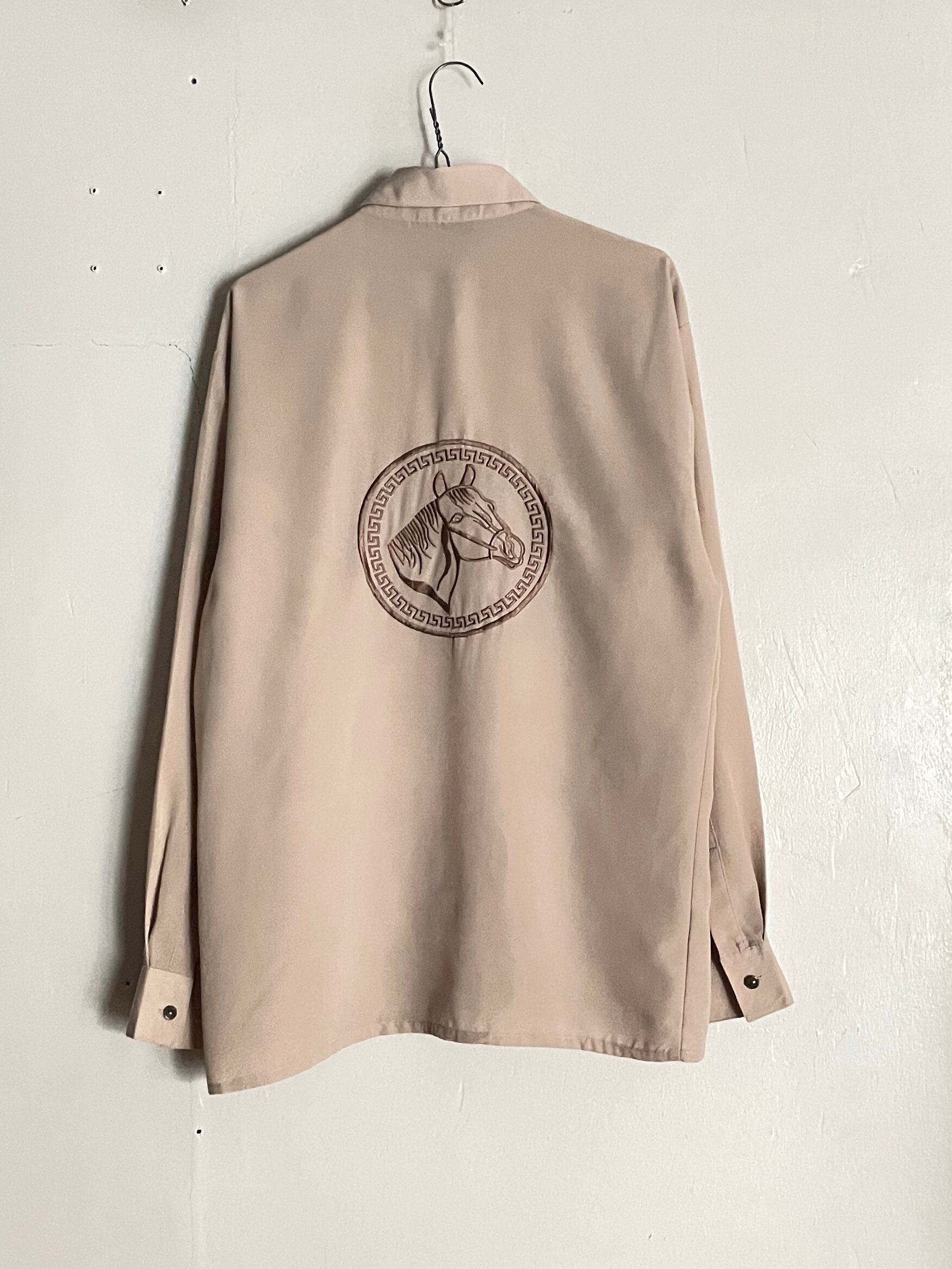 上品なライトベージュボディに、馬の刺繍が施されたシャツ。フロント部分には縦に謎な模様とコンパクトめな馬が刺繍されています。バックにはど真ん中にデカめの馬刺繍。馬の目を見るとダイヤのようにキラッと光るビーズがデザインされています。デザインのこだわりにセンスが感じられる一着です。やや透け感のあるポリ素材で、今の時期には涼しげに着られるお洒落なシャツです。