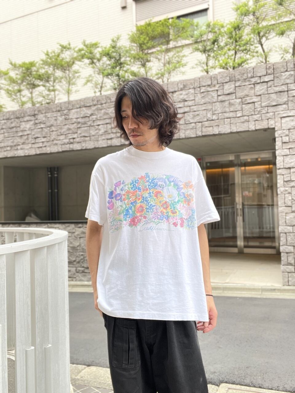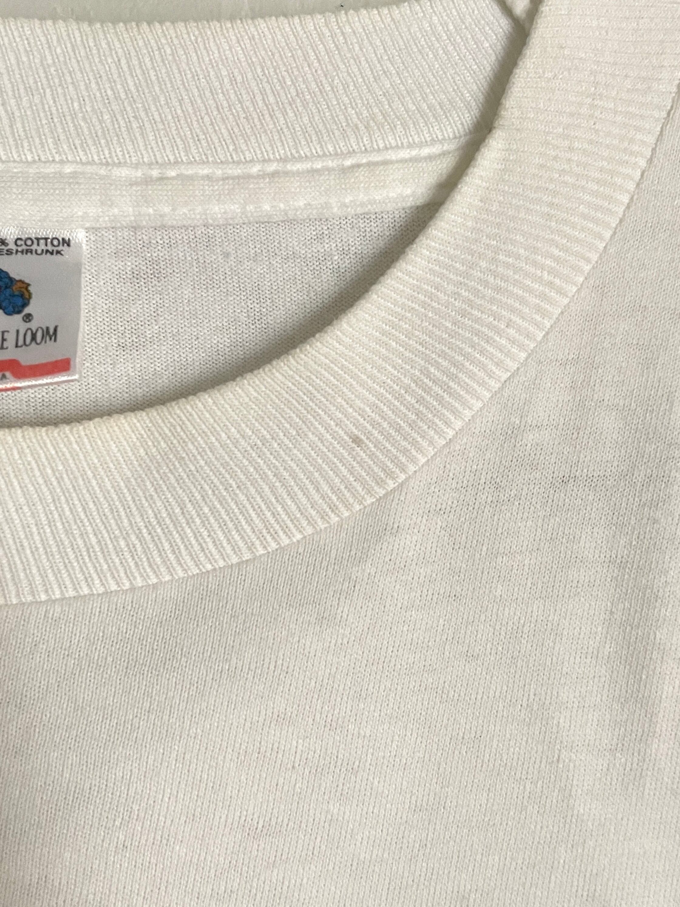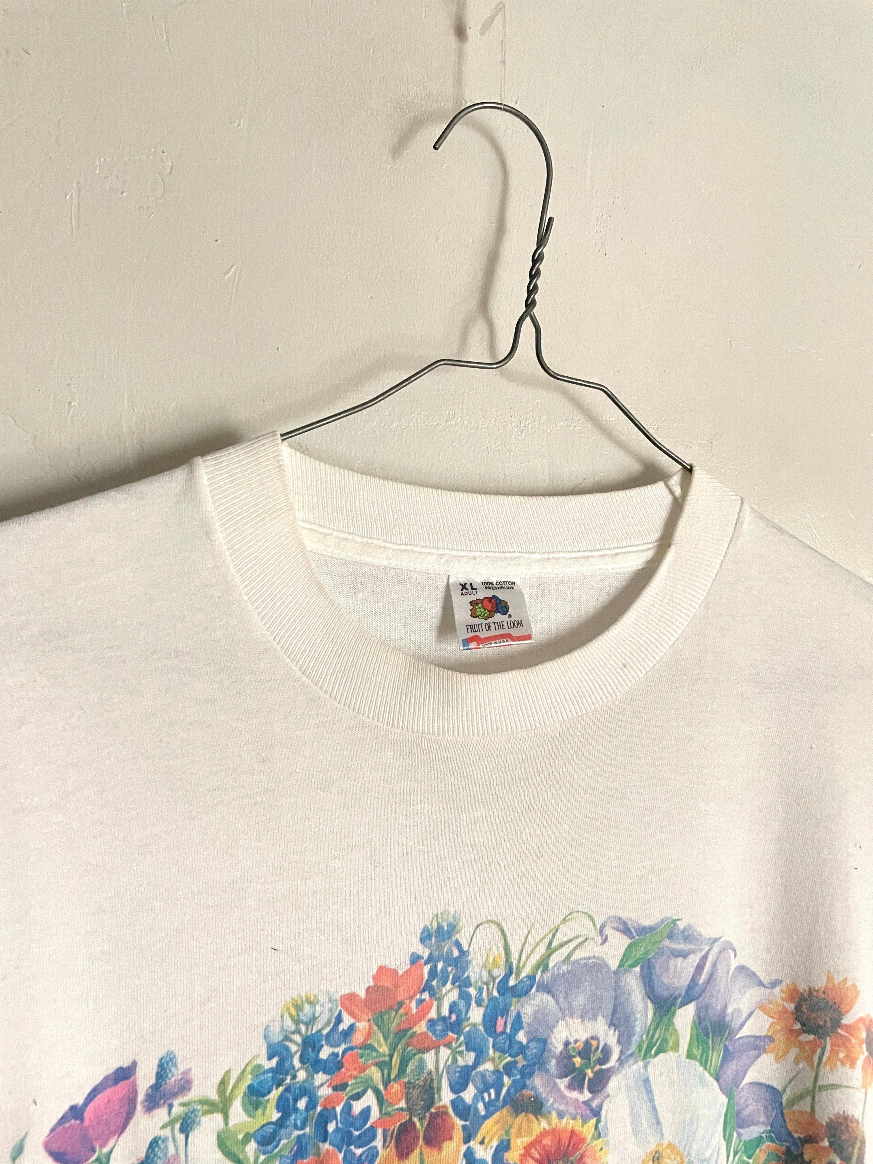 ホワイトボディに色鮮やかなお花が両面にプリントされたTシャツ。ボディはフルーツ・オブ・ザ・ルームです。1992年のコピーライト入り。袖、裾はシングルステッチです。やや褪せた色味が雰囲気のあるお洒落な一枚。今の時期にピッタリかと思います。