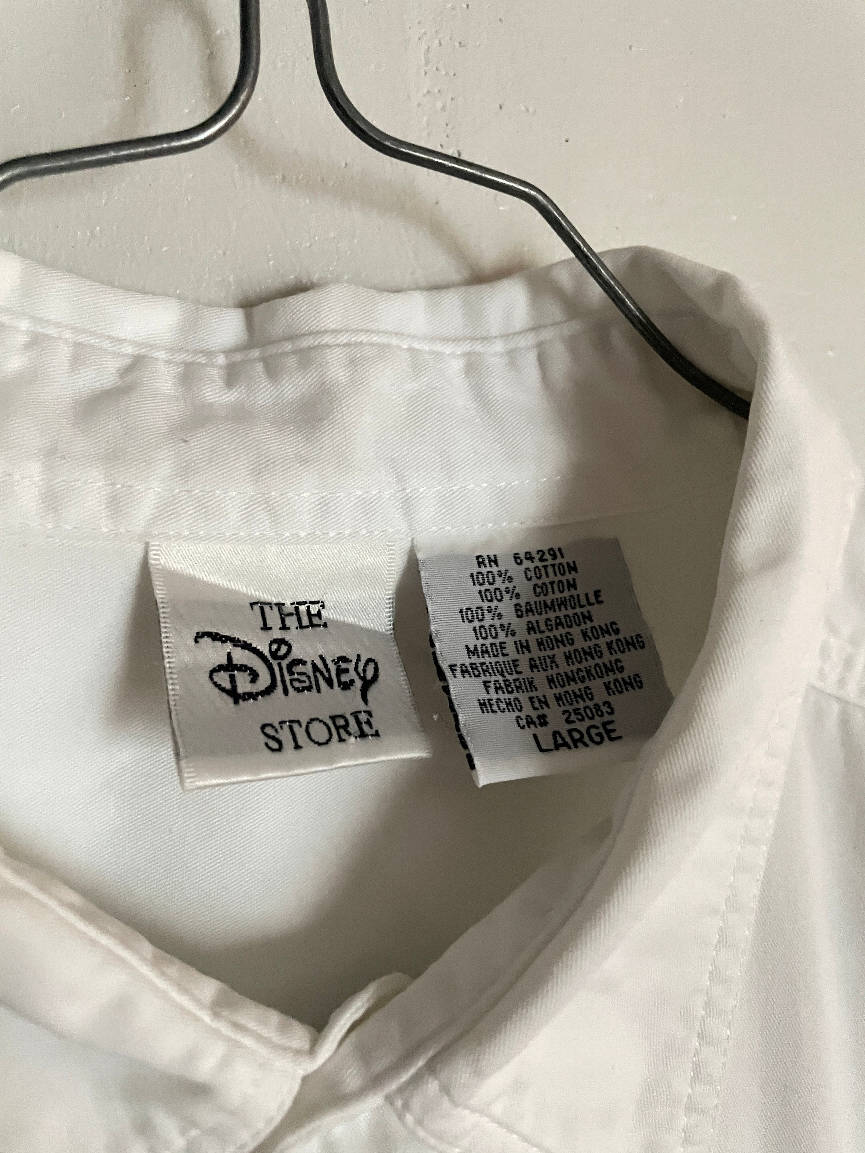 ホワイトボディに、ディズニーキャラクター達が、カウンターで楽しそうにアイスを食べている様子がワッペンによってデザインされたシャツ。ディズニーらしいポップで可愛らしいデザイン。やや光沢のあるワッペンもグッドです。ゆったりとしたサイズ感で、今の時期にはラフに着られそうです。ディズニー好きにはもちろん、そうじゃない方にもおすすめできる一着です。左袖口ボタンが少し欠けています。