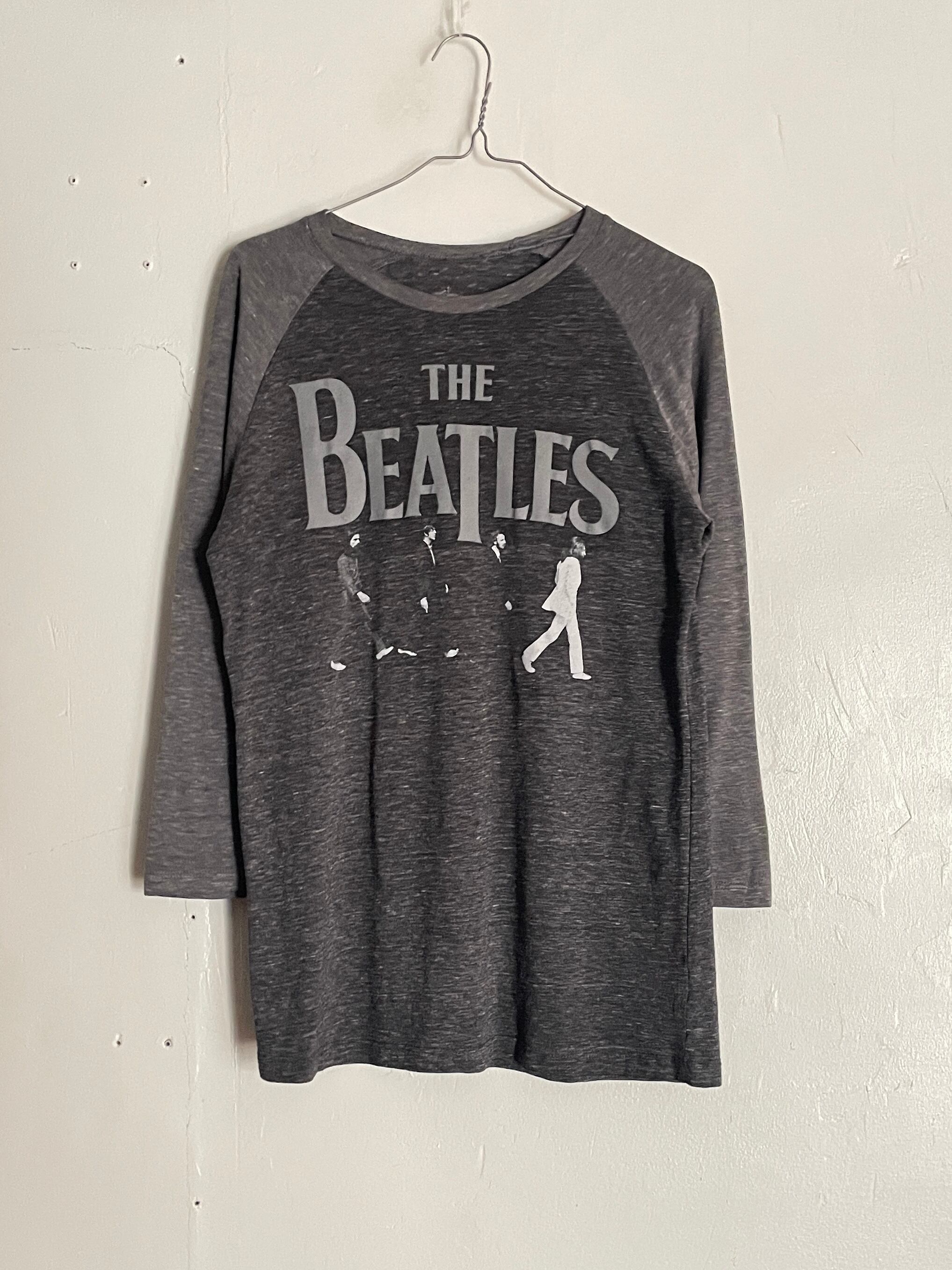 グレーボディに、イギリスのロックバンド”ビートルズ”のアビイ・ロードを歩いているプリントが施されたラグランTシャツ。バンド好きは一度は目にした事のあるプリントです。トーンの違う杢グレーのボディに、ビートルズのネームプリント、リアルなメンバープリントが施されています。軽く着やすいポリとコットン素材。古いアイテムではありませんが、ヴィンテージ感を感じさせるお洒落な一着です。