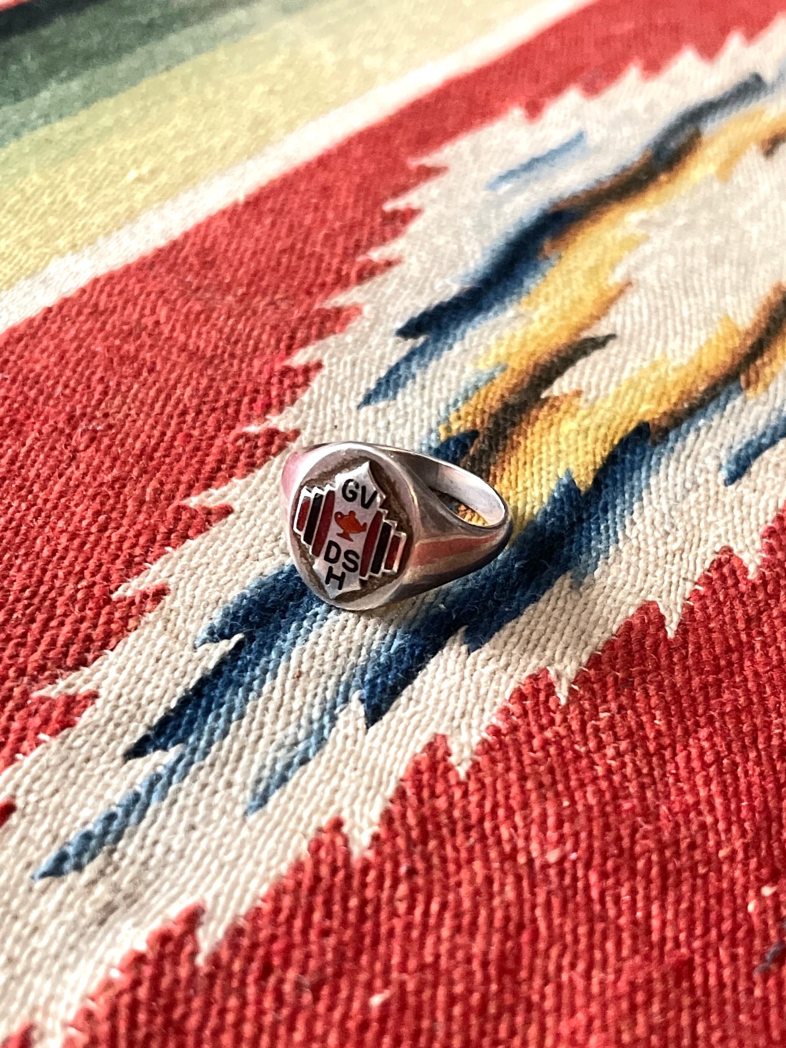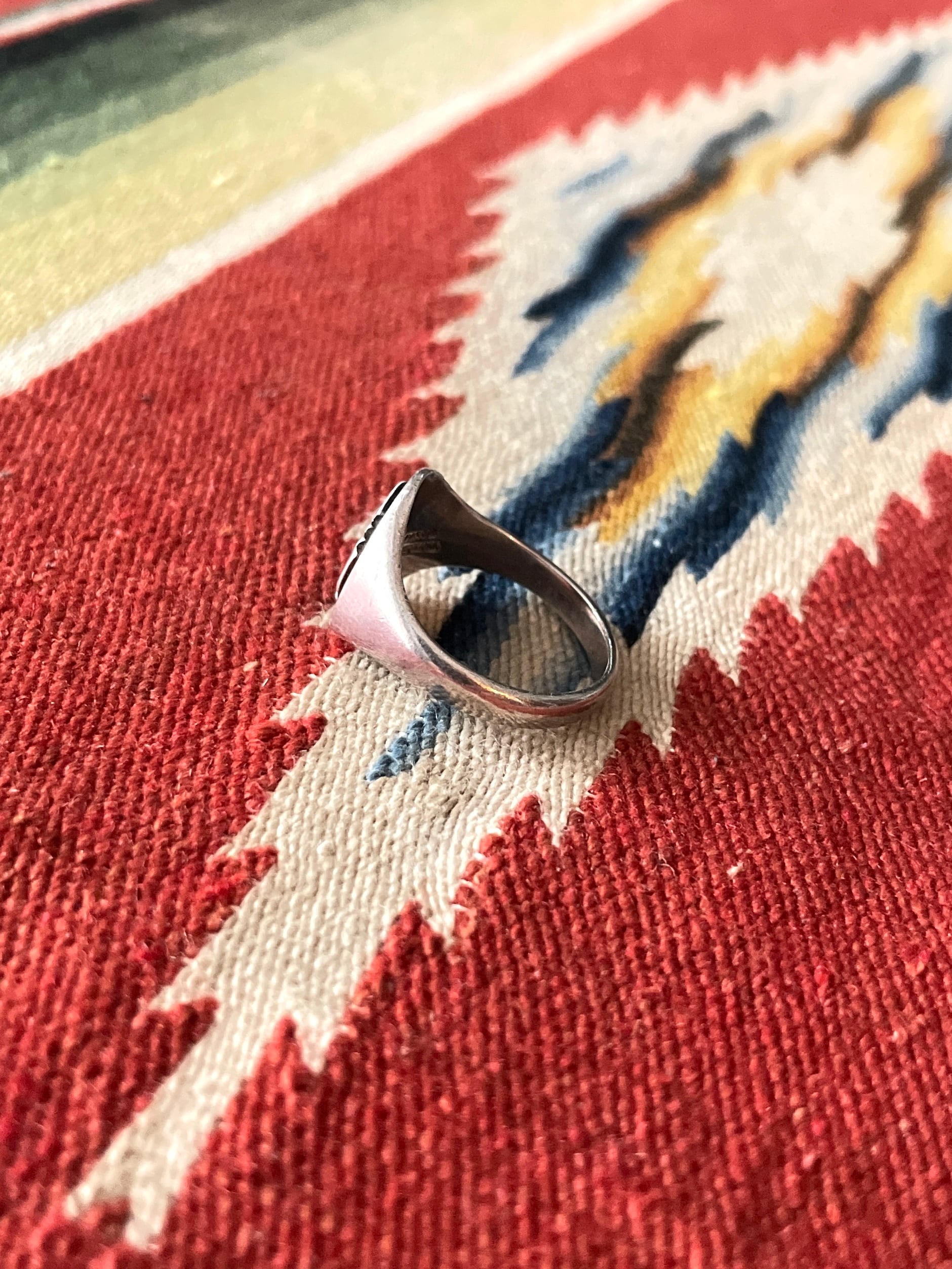 カレッジ風のモチーフデザインがお洒落なスターリングシルバーリング。内側の刻印を見ると「sterling」の文字の上に、「BIRKS」の刻印も。カナダの老舗ジュエリーメーカー、BIRKS社のもであることがわかります。赤と黒の配色はシンプルながら良いアクセントに。剥がれや欠けなどはなくコンディションは良好。いい雰囲気を感じられる希少なリングです。