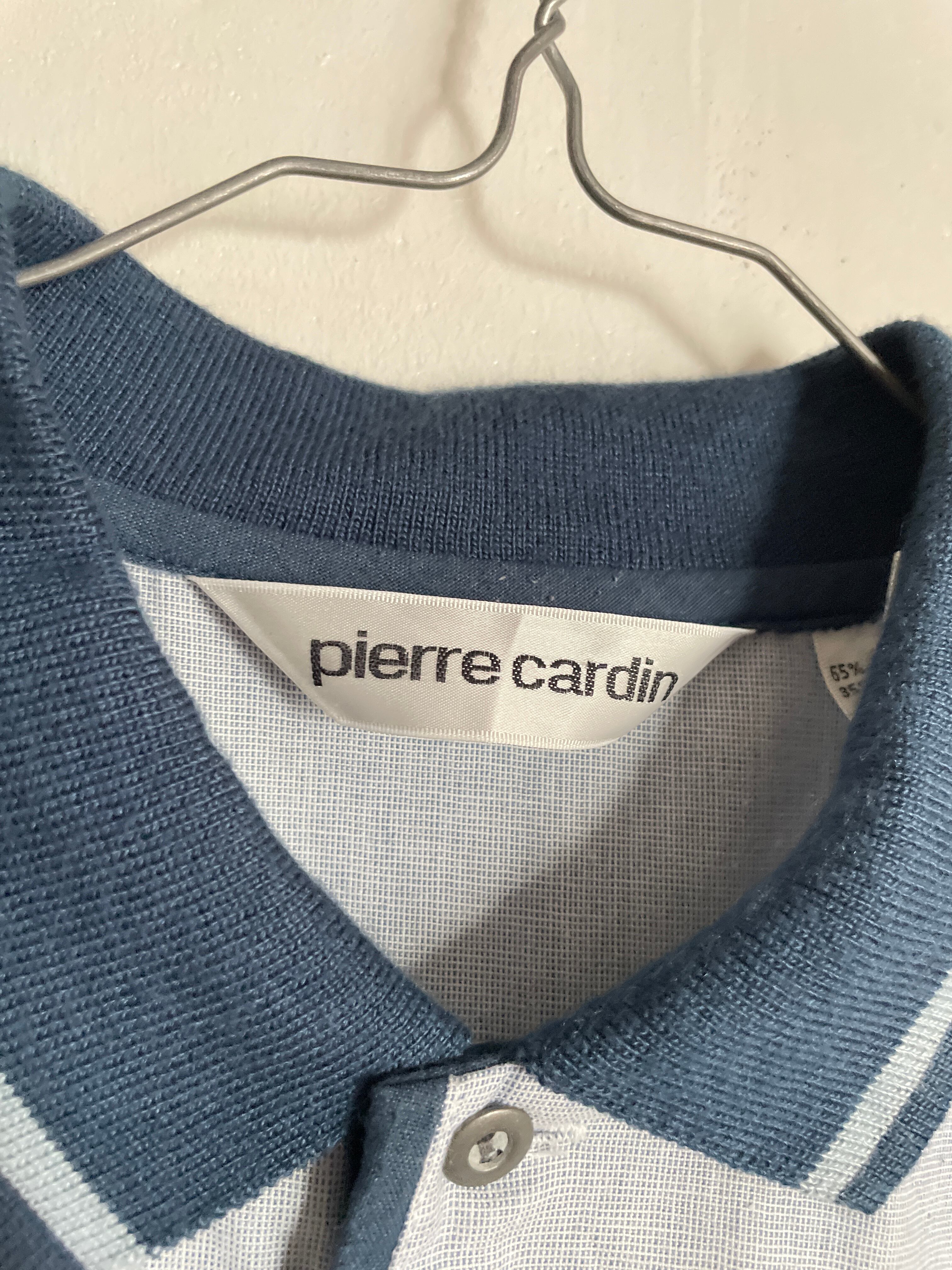 白とネイビー、サックスブルーの切り替えデザインがお洒落な、ピエール・カルダンのデザインポロシャツ。一般的なシャツ地と同じ布帛で作られています。左胸には切り替えをうまく使ったポケット付き。ネックはリブ襟、袖口、裾もリブ仕様です。爽やかで春っぽい、清潔感のある1着です。