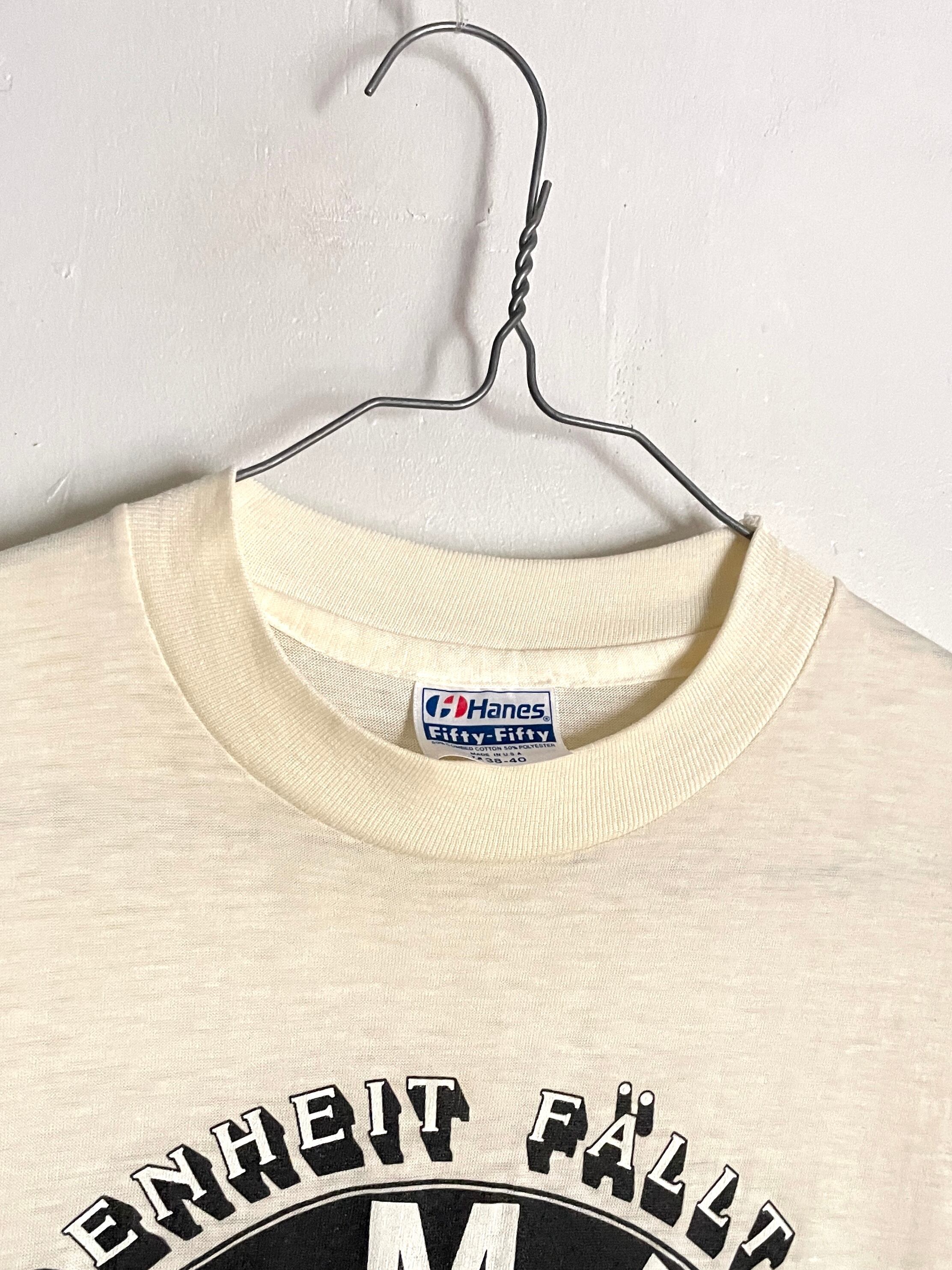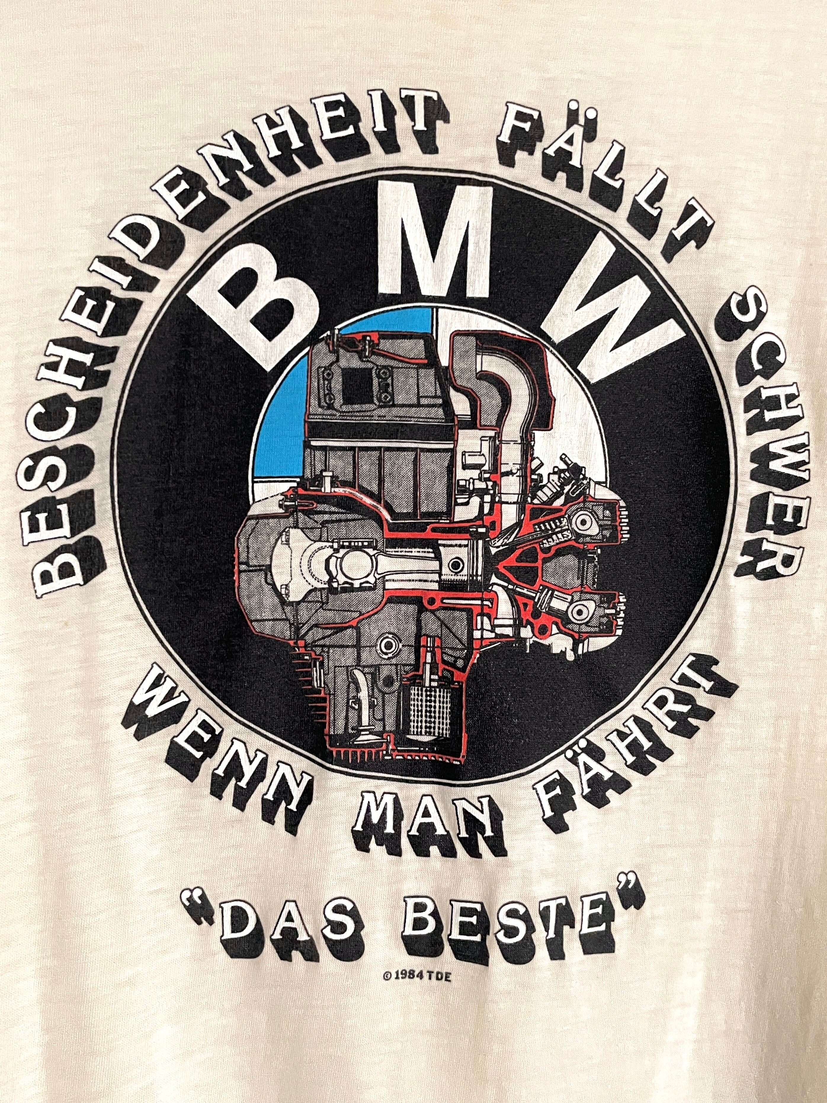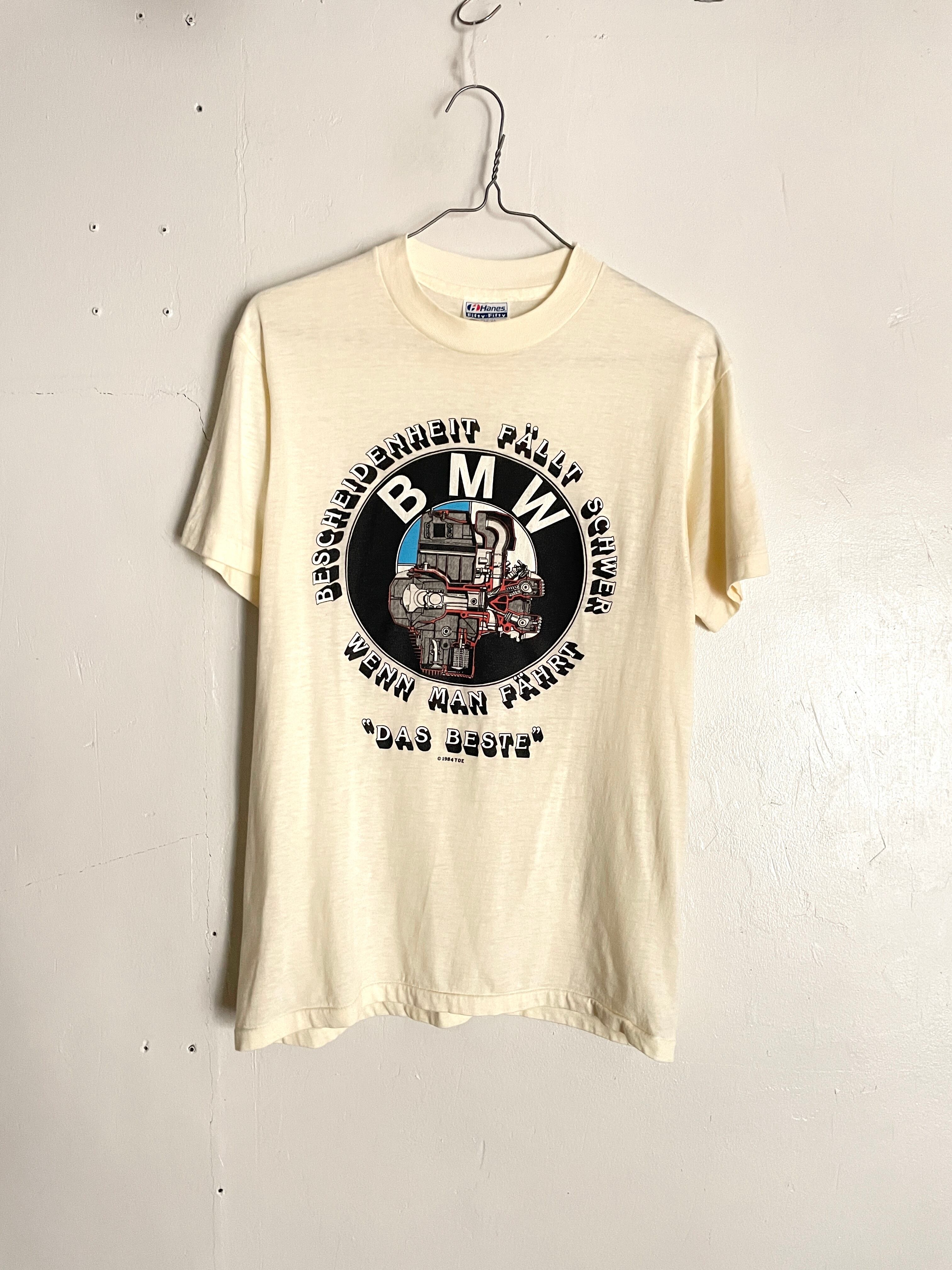 やや生成色がかったボディに、BMWのプリントがかっこいいTシャツ。ボディは80年代のヘインズで、1984年のコピーライト入りです。コットン・ポリのやや透け感のある素材で、80s特有のややタイト目なシルエットが特徴。男性、女性どちらにもおすすめなアメリカ製のヴィンテージTシャツです。