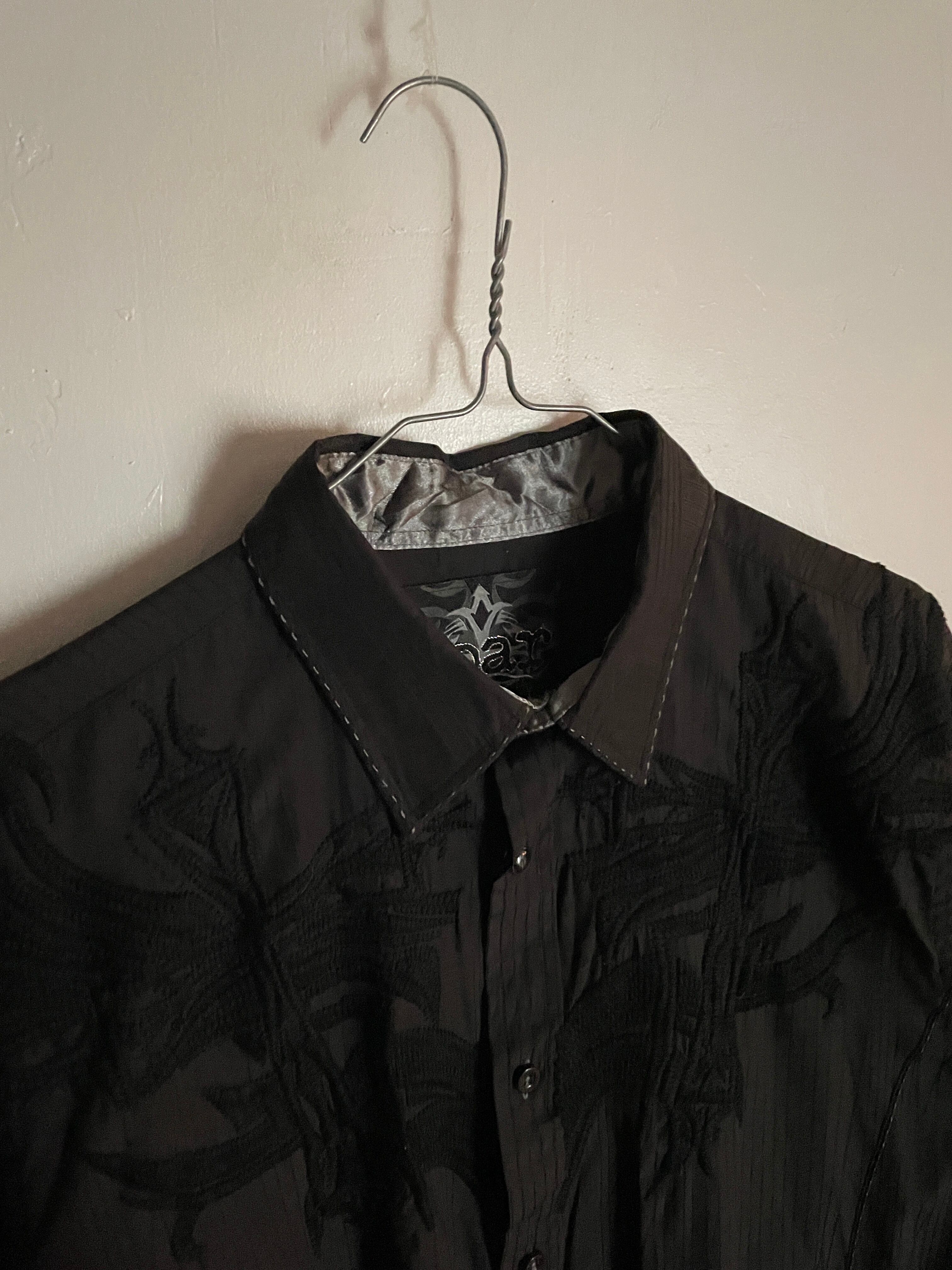 ブラックボディに、ブラックの刺繍が前後に施されたシャツ。Y2Kな雰囲気を感じられる雰囲気のあるデザインになっています。凹凸のある細かな刺繍デザイン。ブラック×ブラックなのがクールです。着丈長めの縦長シルエット。サラッとしたコットンポリ素材。今の時期にはぴったりなシャツかと思います。