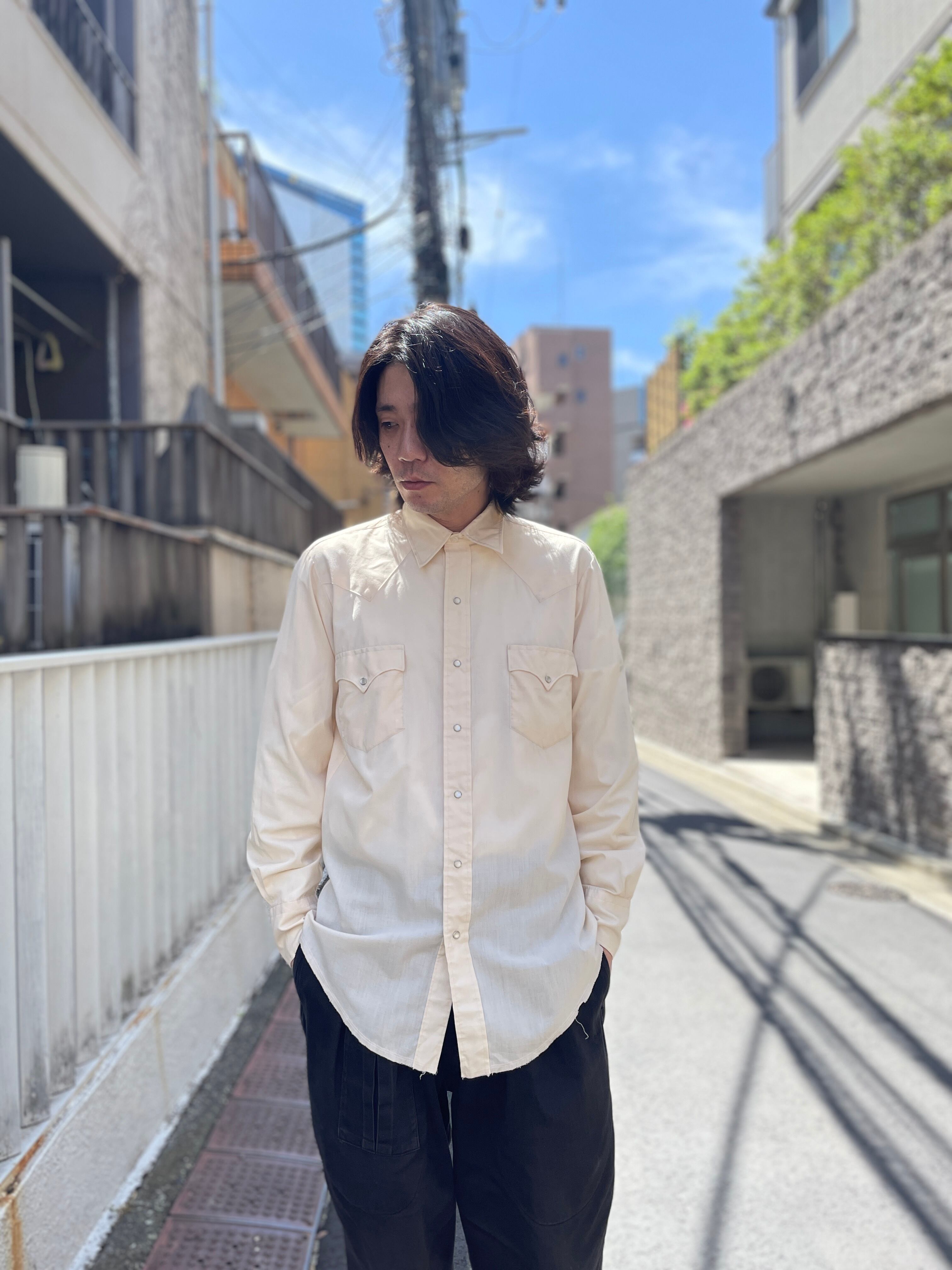 やや透け感のあるアイボリーボディの、ウエスタンシャツ。サラッとした上品な軽い質感。70年代を感じさせる、ウエスタンシャツ特有のショルダーヨーク、フラップポケットなどが魅力的です。シンプルですが、シャツとしてのクオリティが非常に高い1着かと思います。一枚ではもちろん、インナーとしても活躍してくれるアイテムです。