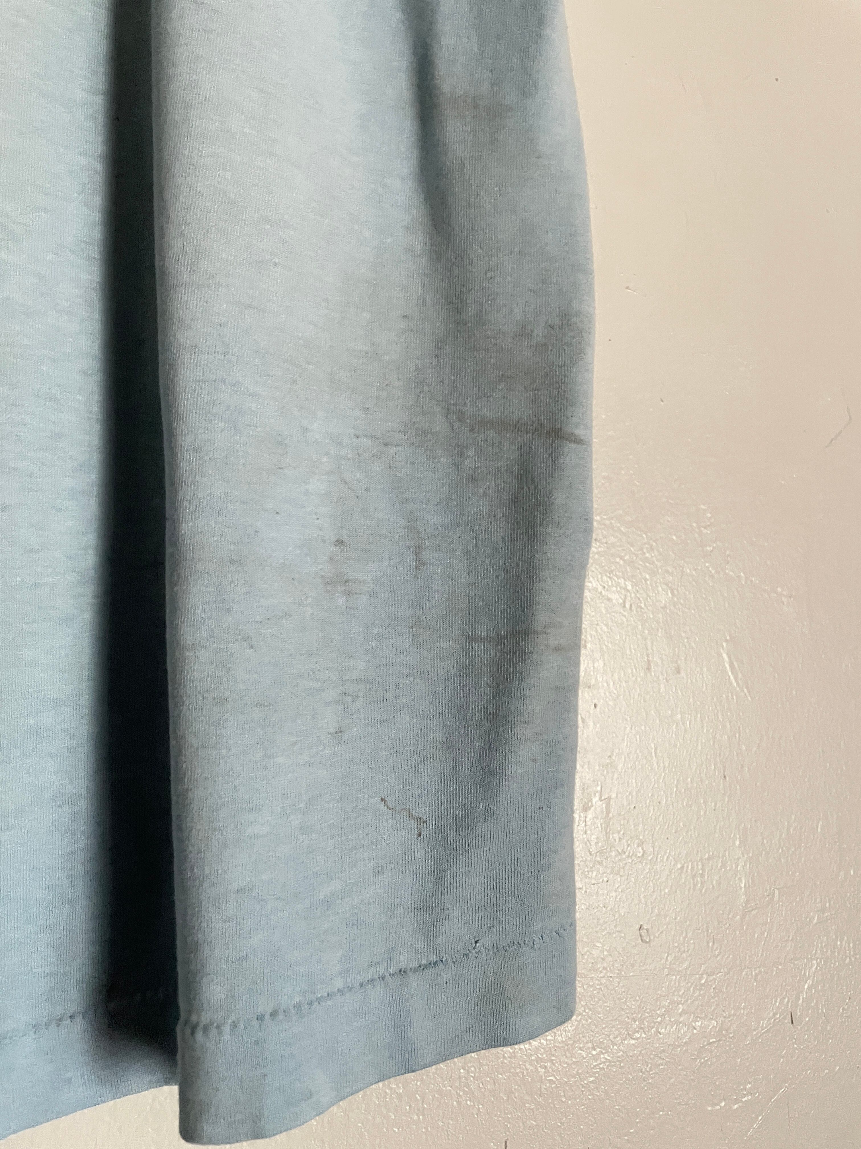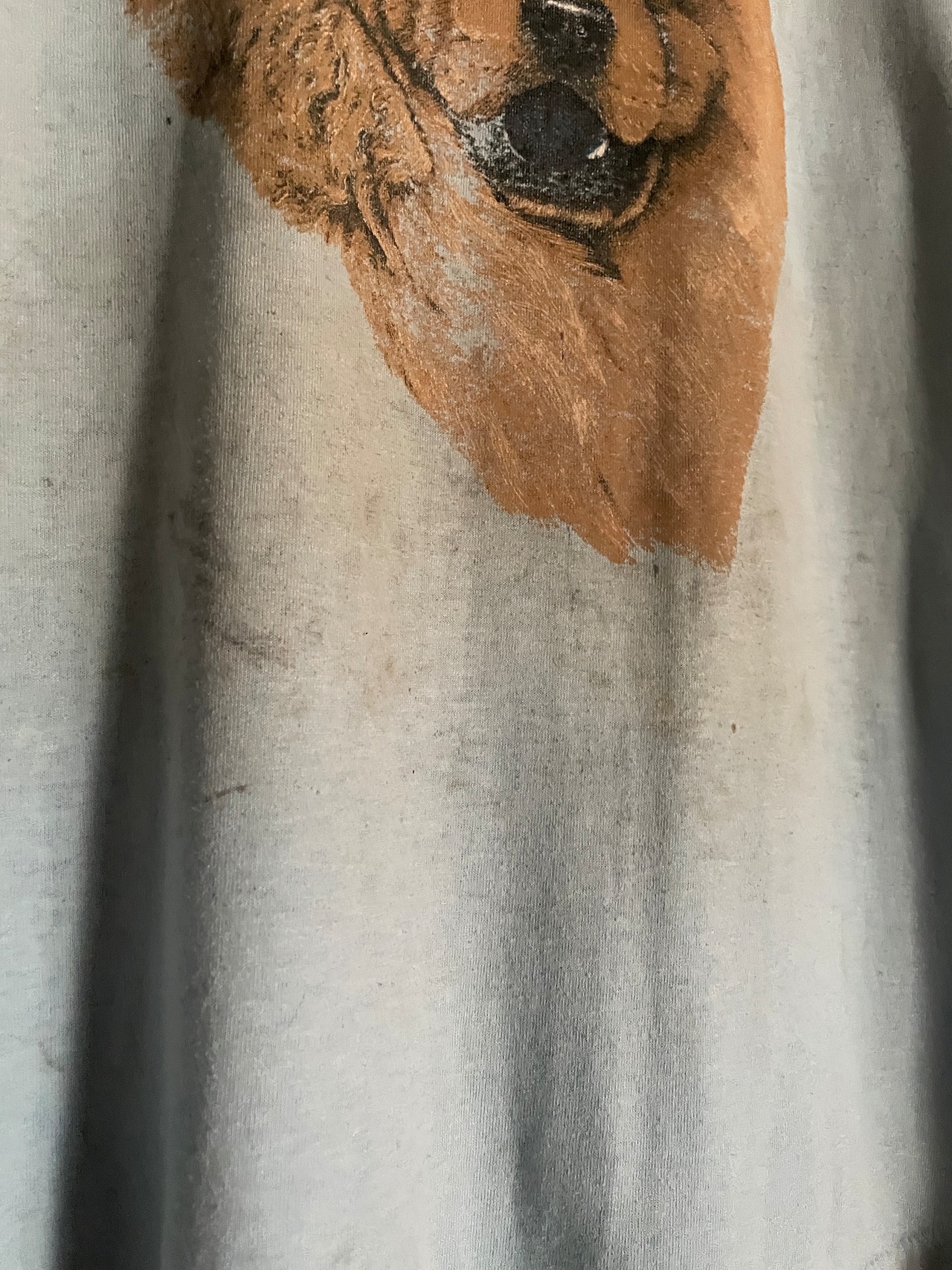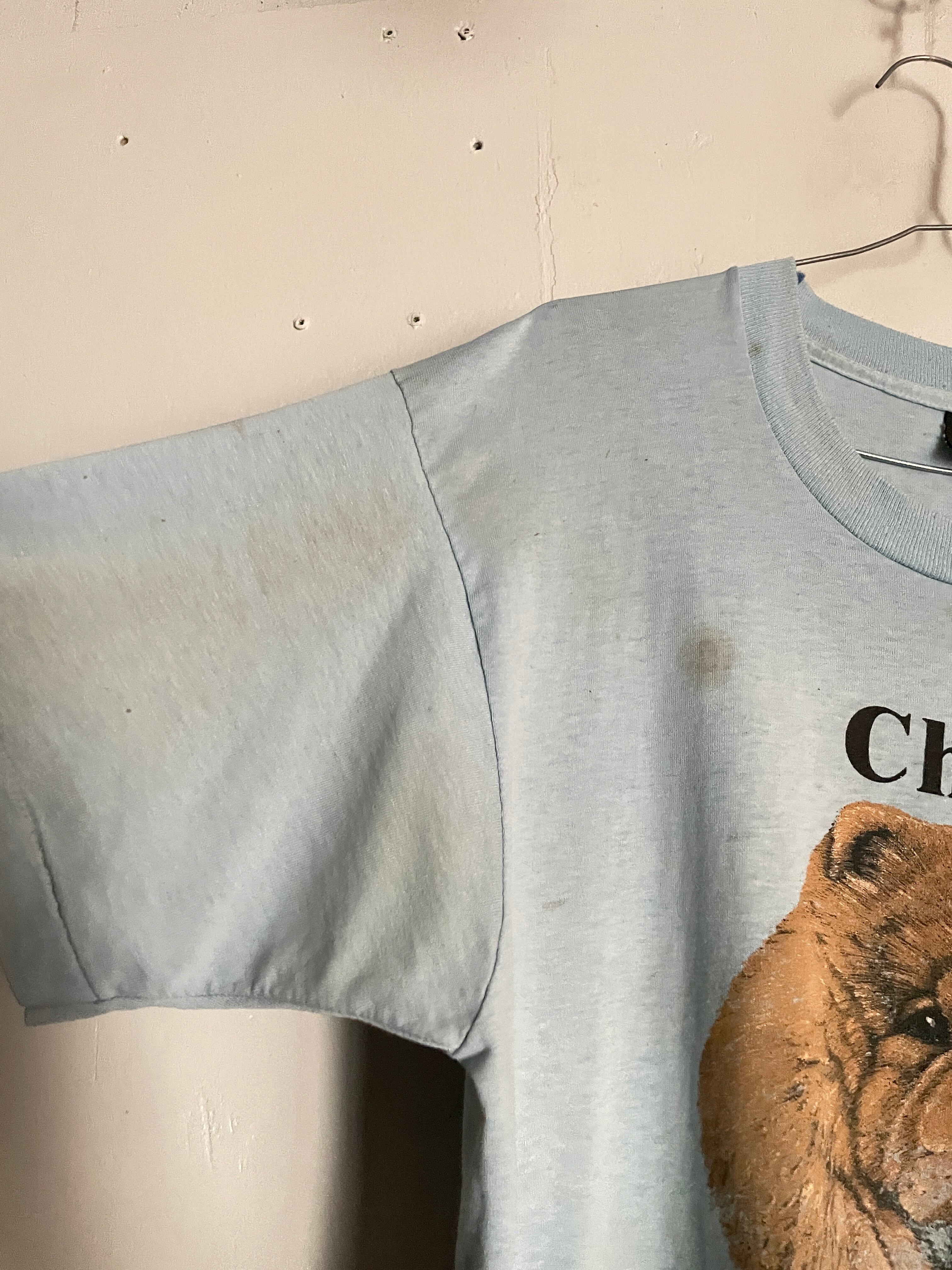 鮮やかなライトブルーボディに、可愛らしいドッグプリントが施されたTシャツ。アート感のあるタッチのドッグプリント。”Chow"とは食事や食べ物を指すカジュアルな表現で使われる言葉のようです。全体的に汚れなどが見られますが、それも含めて雰囲気ありの1着です。しっかりとUSA製でシングルステッチ。ヴィンテージ感漂うTシャツです。