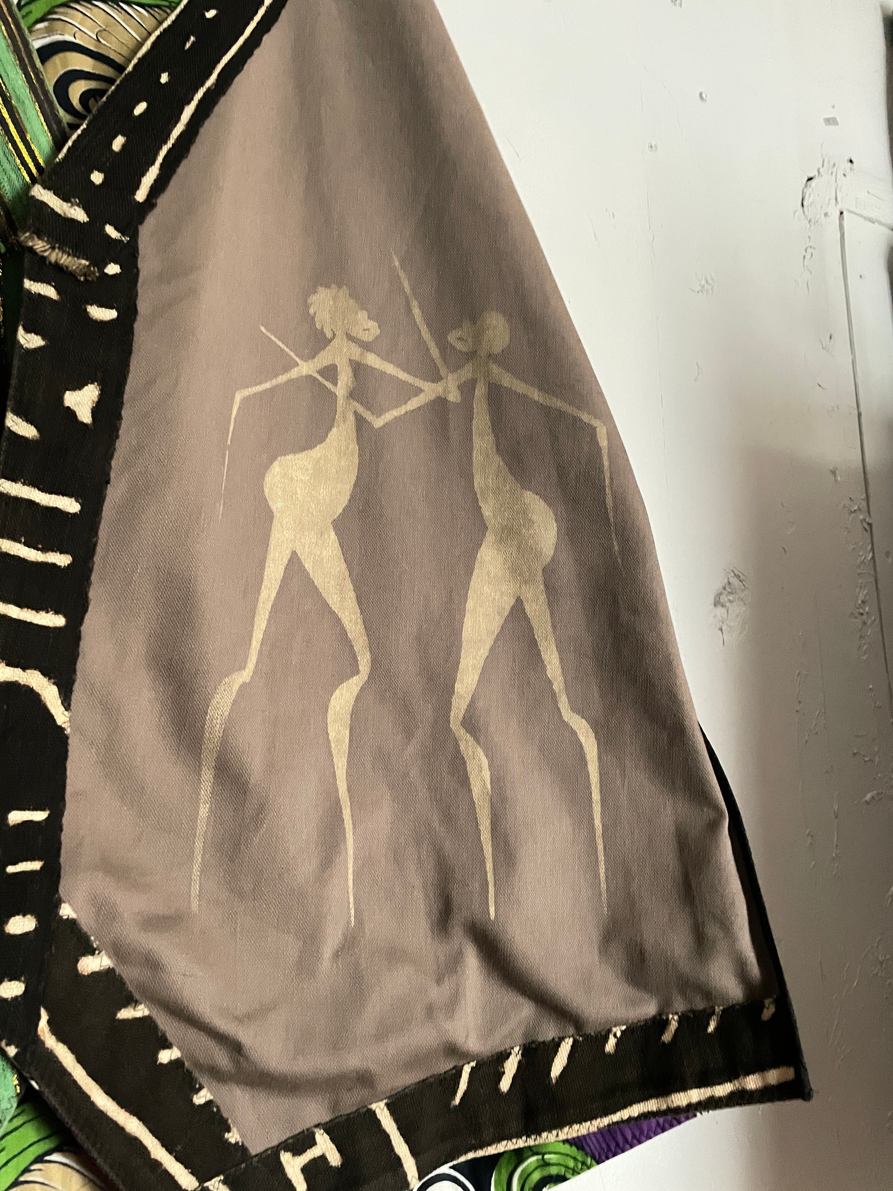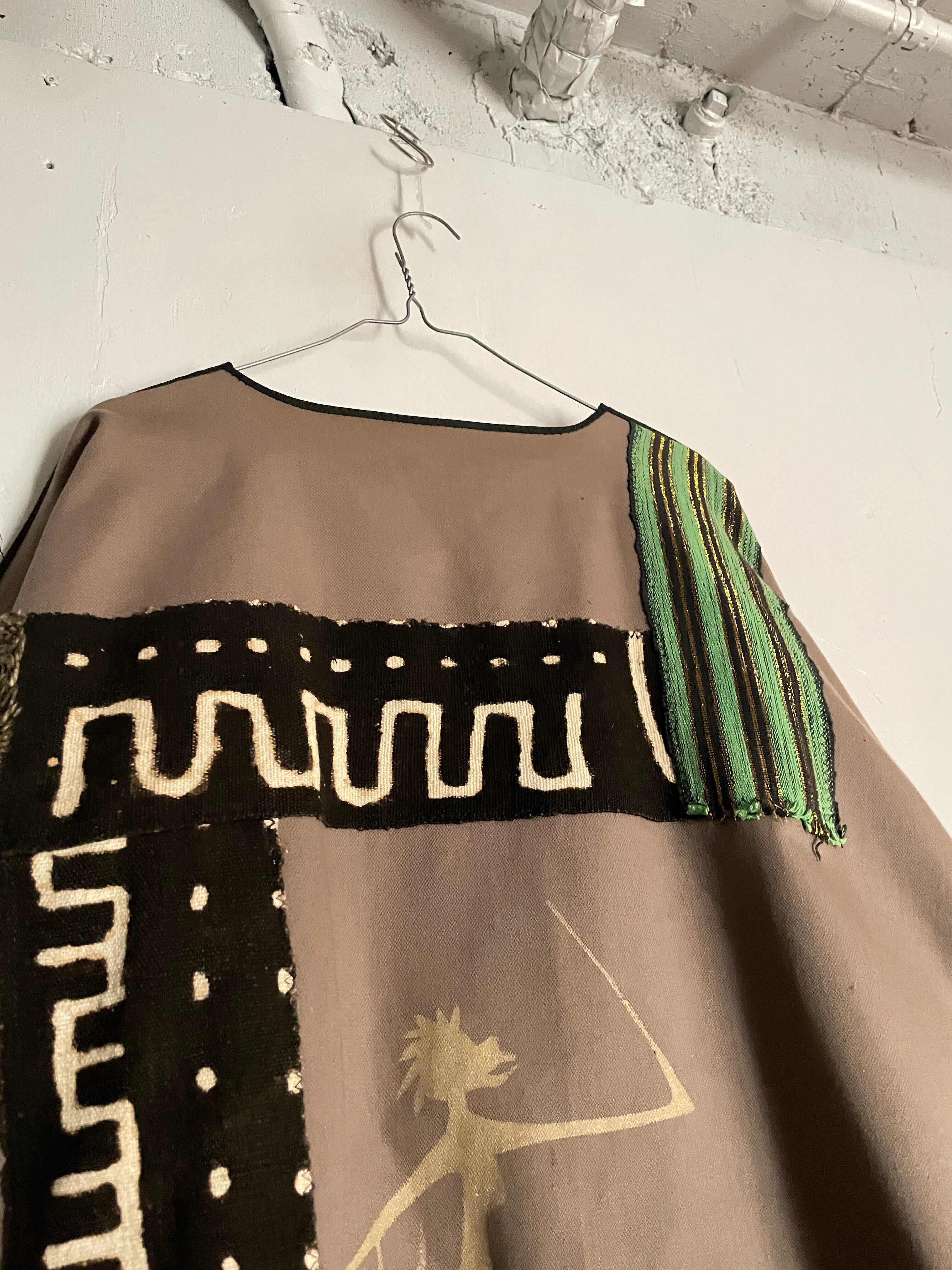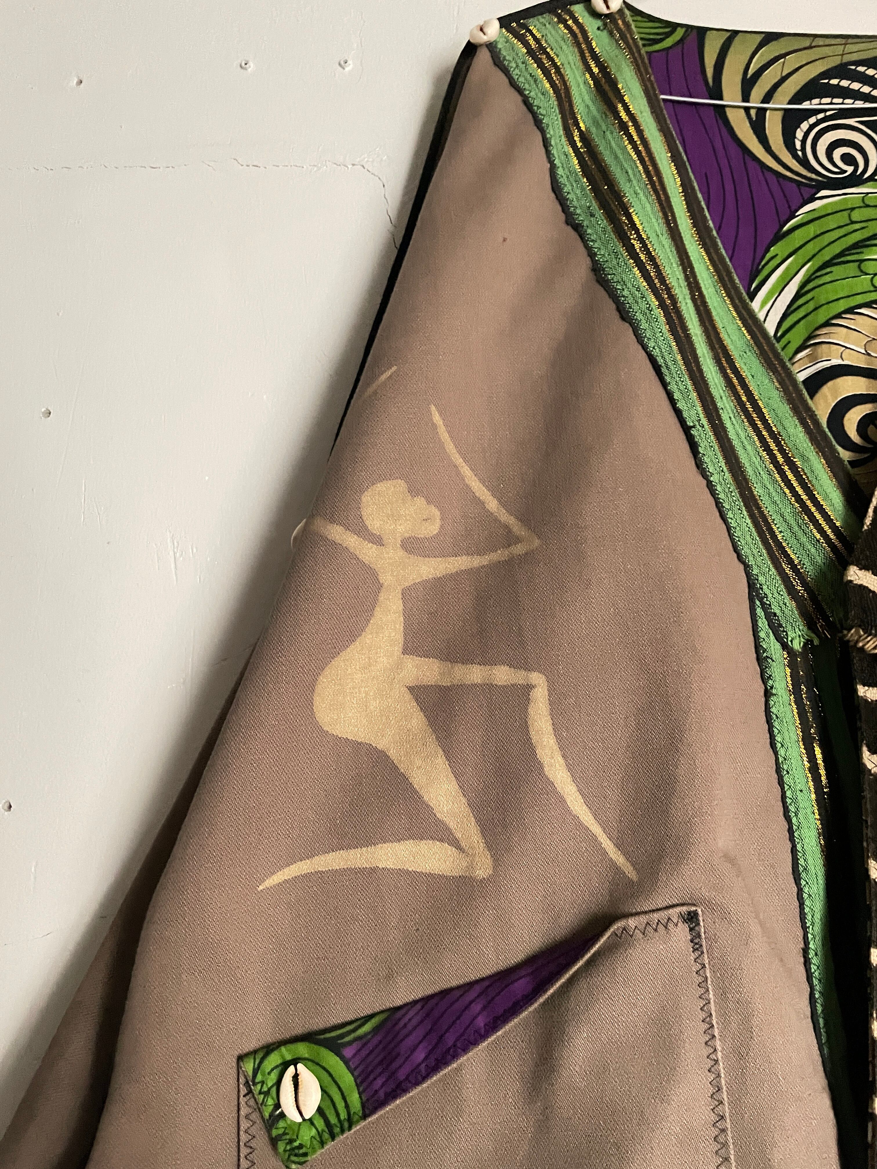 民族調なプリント、別布で取り付けられた柄デザイン、所々の貝殻など、デザイン性抜群の羽織りリバーシブルジャケット。裏表で全く違ったデザインになっていて、気分によって使い分けられる便利な1着。肩から袖口にかけて、極端に細くなっているのも面白いです。ゆったりとしたサイズ感で、間違いなくファッションの主役になってくれる雰囲気大のアイテムです。