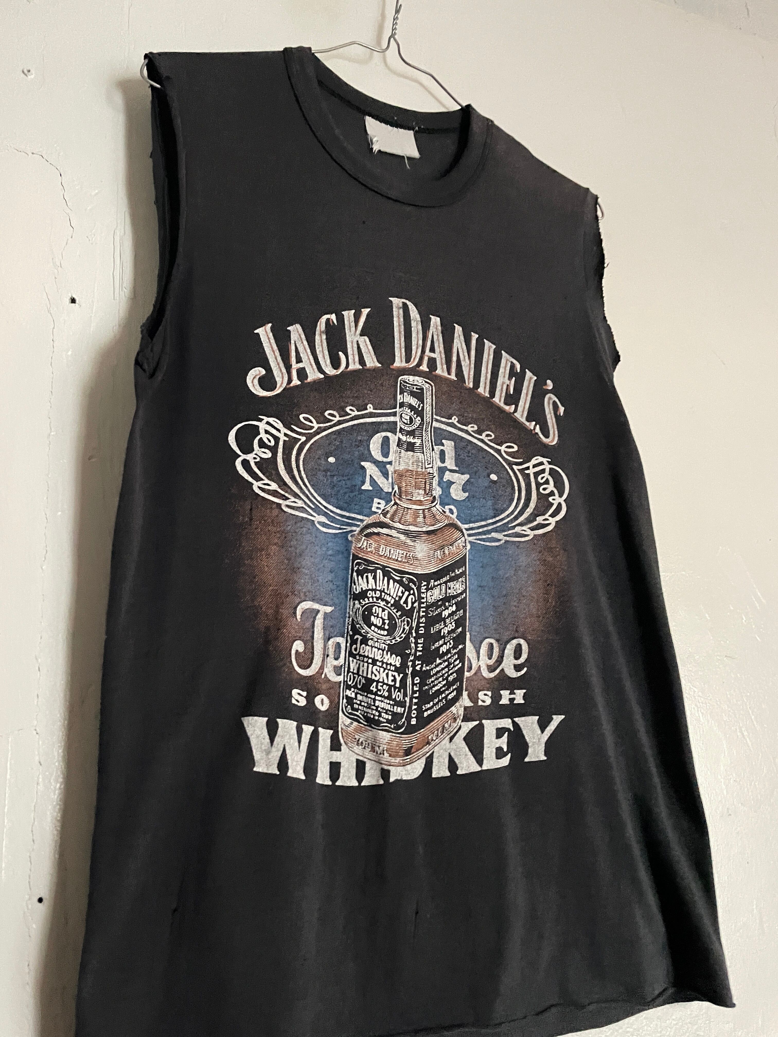 フェードしたブラックボディに、ウイスキーで有名な”ジャックダニエル”のプリントが施された、カットオフTシャツ。やや掠れたボトルとネームプリントがかなりクール。袖、裾は大胆にカットオフされています。ヴィンテージ感漂う薄めのサラッとしたボディ。インナーなどではもちろんですが、これだけ面が良いので、夏には一枚でファッションのメインとして着たいです。所々にピンホールが見られますが、それも込みで良い雰囲気です。